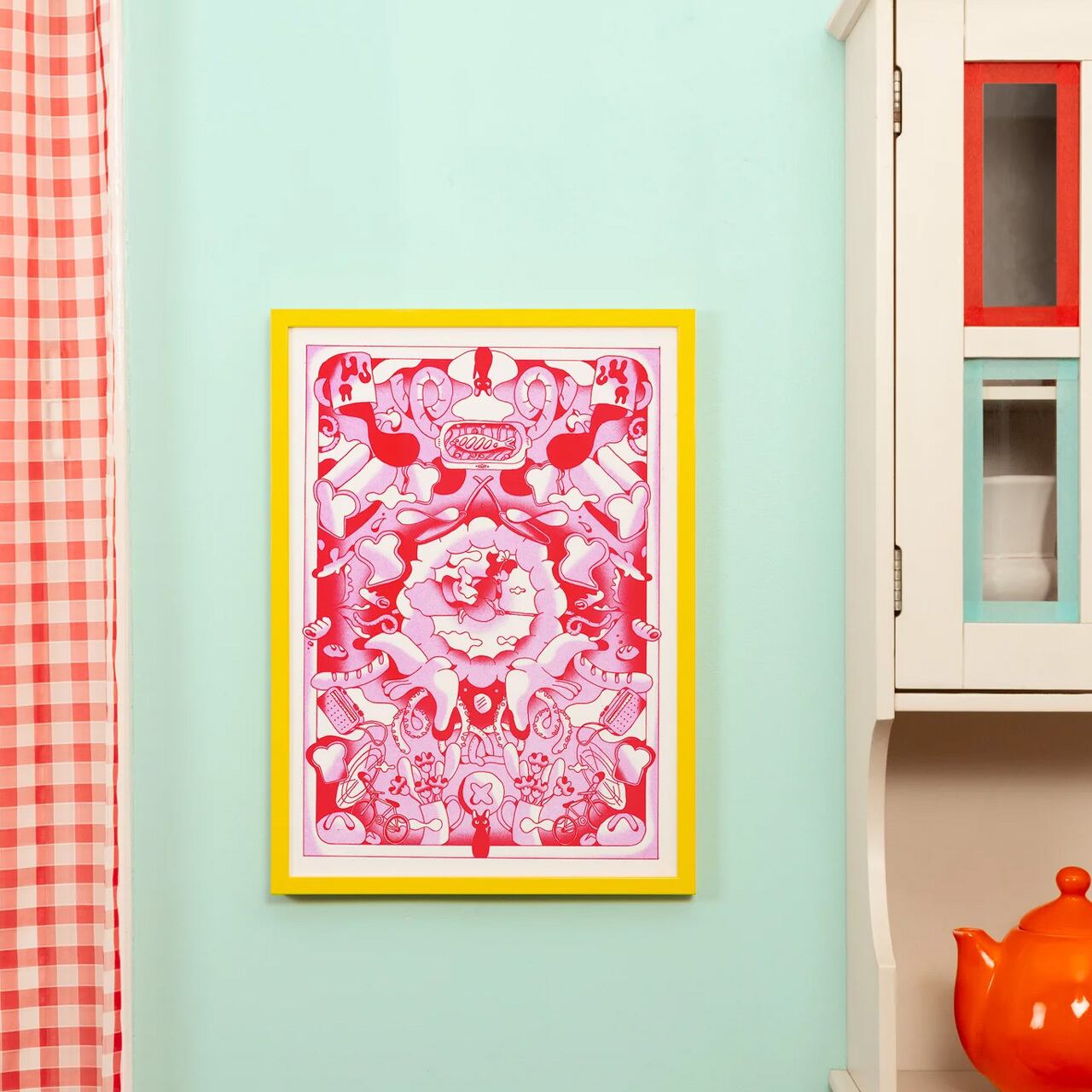 曲線とシンプルな黒のラインで描かれたかわいらしいキャラクターやモチーフ、美味しそうな食べ物たちが、観る者の心を瞬時に幸せな気分で満たします。クリアで軽やかなメロディのように、ポスター全体が魔法と喜びであふれ、日常に小さな夢を届けてくれる一枚です。