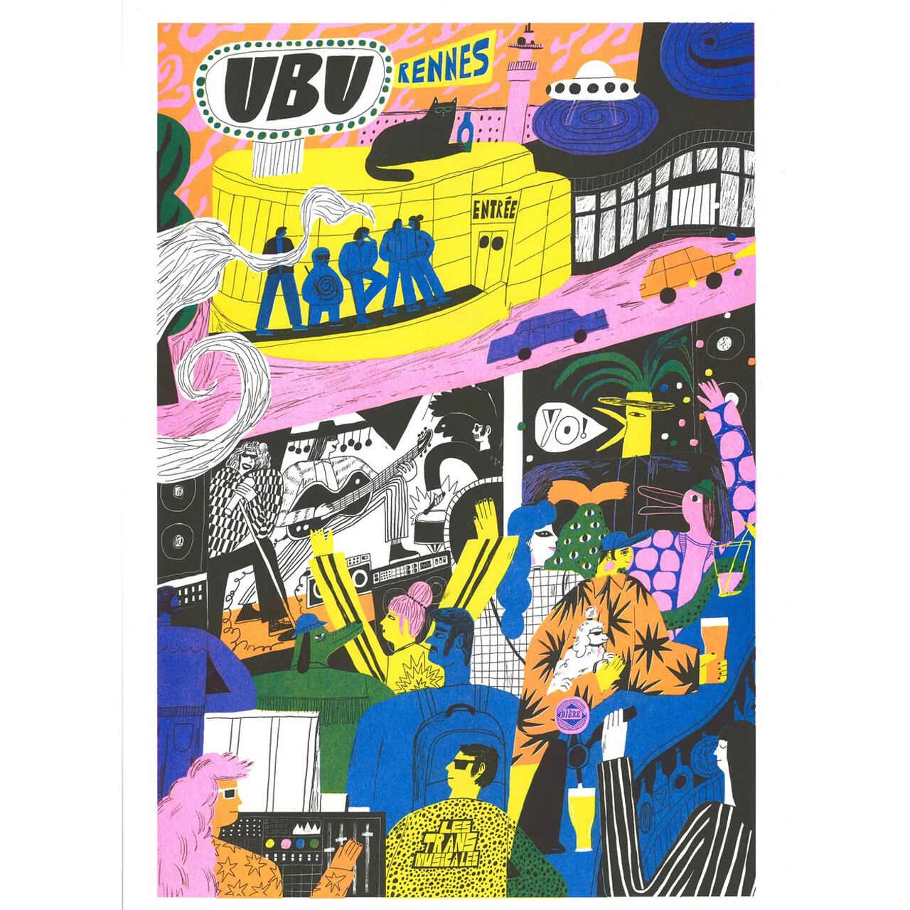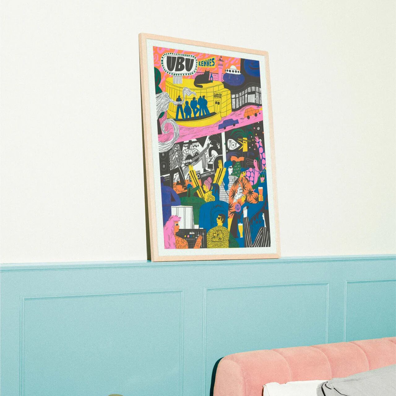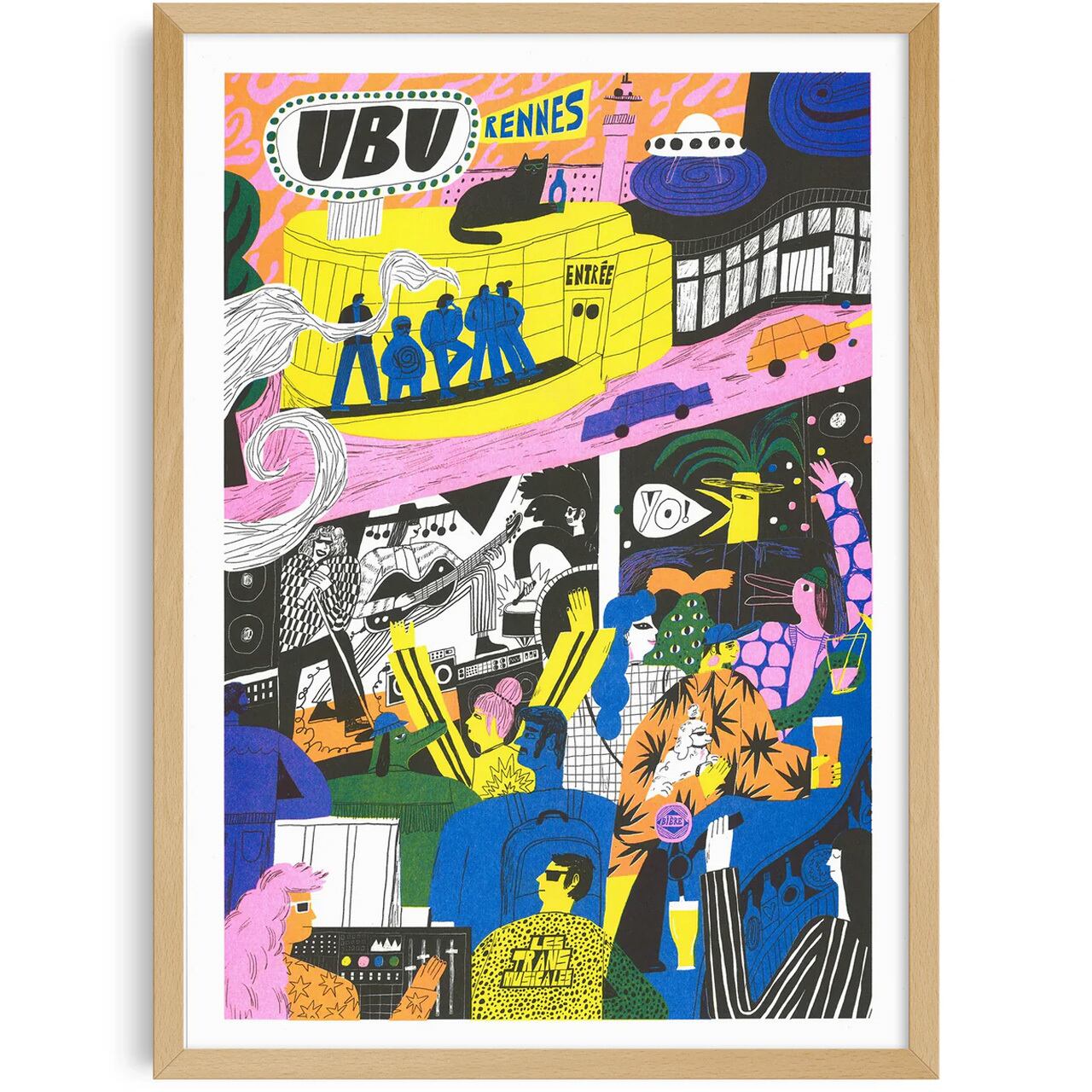 彼の作品には、眠気を吹き飛ばすような、叫び、爆発するエネルギーが満ちています。ポップカルチャーを愛し、グラフィックのインパクトを追求する彼のスタイルは、力強い色彩と素朴なタッチを組み合わせることで、可愛らしさと視覚的な衝撃を両立させています。この「UBU」は、フランスのレンヌにあるライブハウス「Ubu」の活気と熱狂を表現した一枚。ユーモアとポジティブなエネルギーに満ちたこの作品は、私たちの固定観念を打ち破り、見る人すべてに深く響くでしょう。