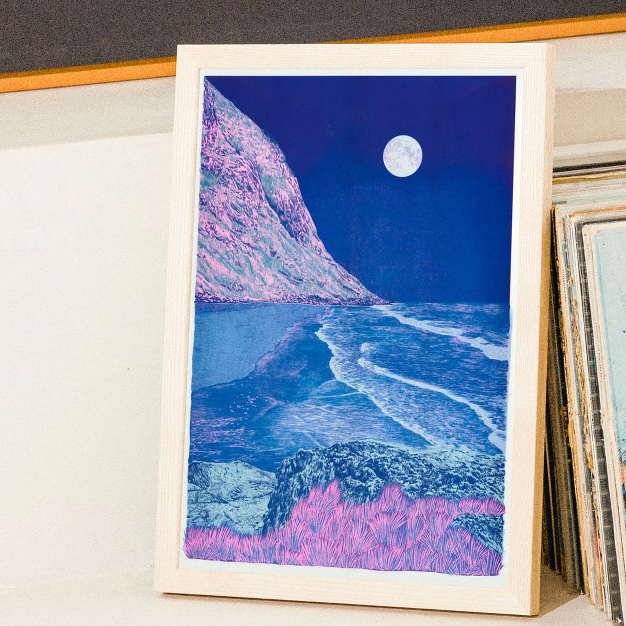純粋な感情と澄んだ空気を表現する彼女は、訪れた現実の、あるいは空想の風景へと私たちをいざないます。パリのゴブラン校で学んだ彼女の作品は、写真からヒントを得た構図や光の表現によって、極めて精緻でありながら、見る人の心を惹きつける不思議な魅力に満ちています。この「Blue Euphoria」も、幻想的な光を放つ月夜の海岸線が、鑑賞者を魅惑的な旅へと誘います。リスグラフ印刷特有の温かみのある風合いが、作品の持つ繊細な美しさをさらに引き立てています。