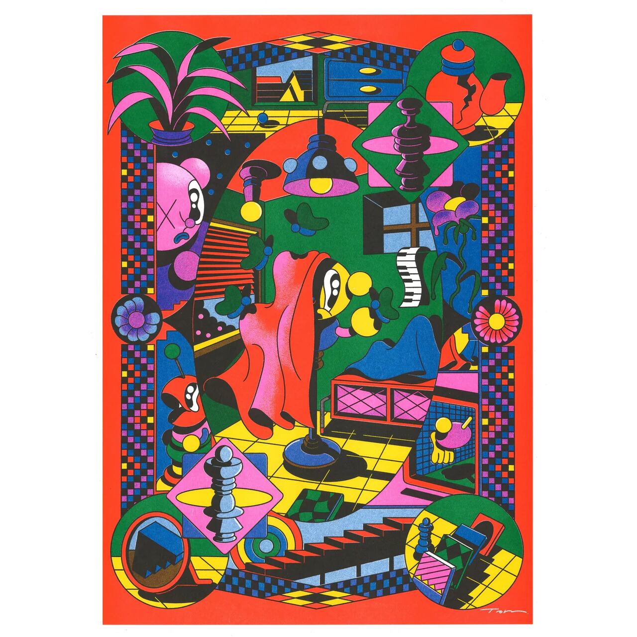 フランス・リヨン発KIBLIND Atelier から、Trampoline「Jumble」。子どものような視点で世界を捉える日本のイラストレーター、Trampoline(トランポリン)によるアートプリントです。