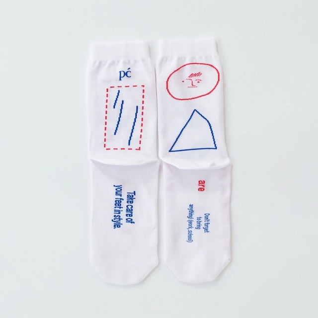 グラフィックデザイナー・山口崇多さんによる、左右で異なる柄が楽しめるプレイフルな靴下。靴を脱いだときに現れるのは、「忘れ物をするな!」というユーモラスなメッセージ。まるで自分だけが知っている秘密のサインのようで、思わずクスッと笑みがこぼれます。