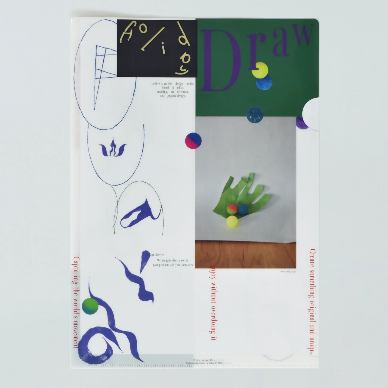 このアイテムの最大の魅力は、他にはない唯一無二のデザイン!『published by collé』が大切にしているポリシー「Holiday FUN draw draw」を、遊び心あふれるレイアウトと大胆な色使いで表現しています。このポリシーには「毎日を休日のような気持ちで楽しみ、とにかく描いていく!」という自由でクリエイティブな精神が込められており、まるでアート作品のようなクリアファイルは、デスク周りやバッグの中でも一際目を引く存在となるでしょう。