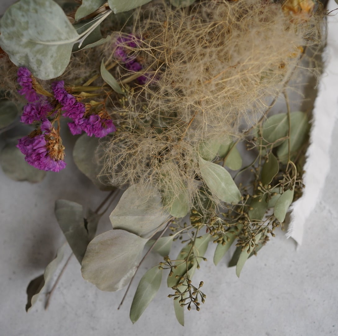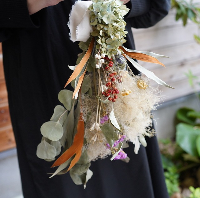 ※ドライフラワーは大変デリケートです。直射日光の当たる場所や湿気の多い場所を避け、優しくお取り扱いください。自然素材を使用しているため、色味やボリュームには個体差があること、また、配送中に多少の葉落ちが発生する可能性があることをあらかじめご了承ください。