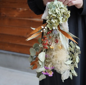 落ち着いたトーンのアンティークアジサイをメインに、シックなユーカリ、ふんわりとしたスモークツリー、そして差し色となる小さな赤い実物を添え、自然な空気感を大切に束ねています。グリーン、ベージュ、テラコッタ(茶)といったニュアンスカラーが複雑に絡み合いとても魅力的なスワッグです。和洋どちらの空間にもすっと馴染み、壁に掛けるだけで、そこを上質なボタニカルの空間へと変えてくれそう。
