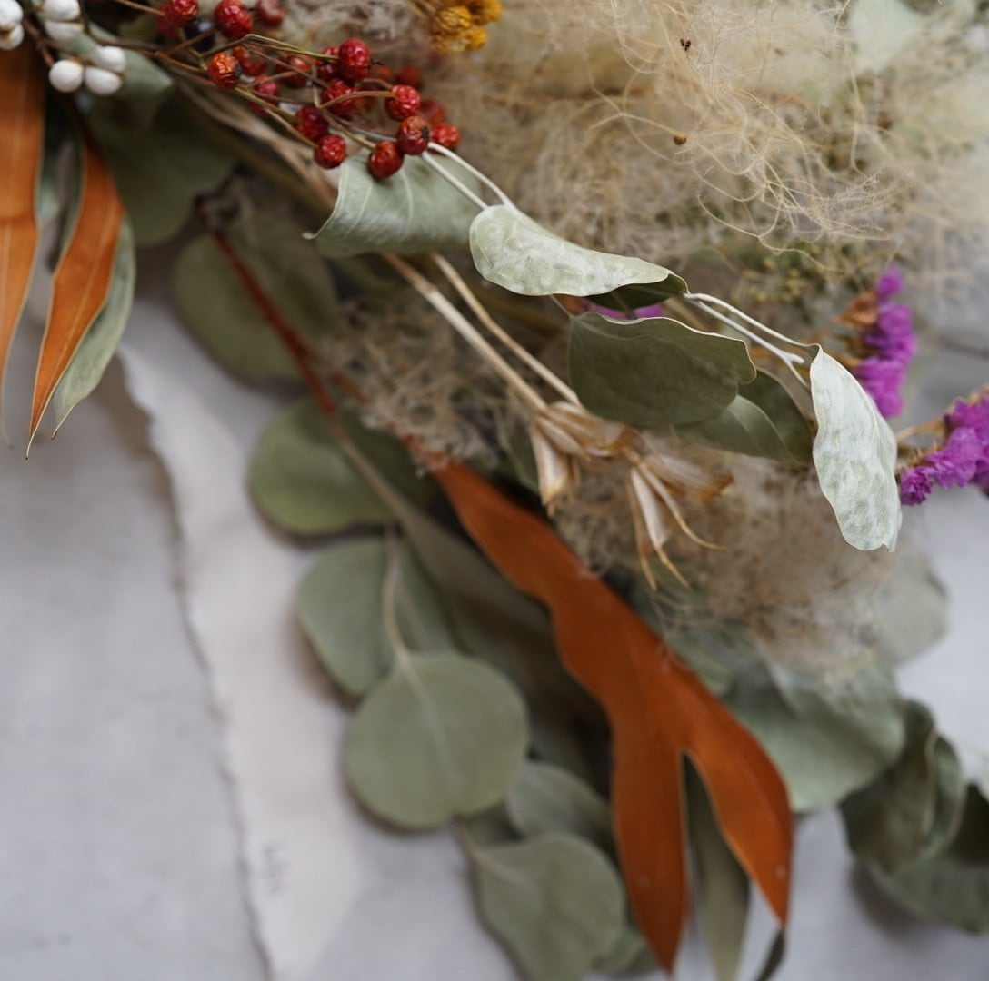 hibaから、季節の移ろいを静かに伝える、美しいドライフラワースワッグが届きました。
