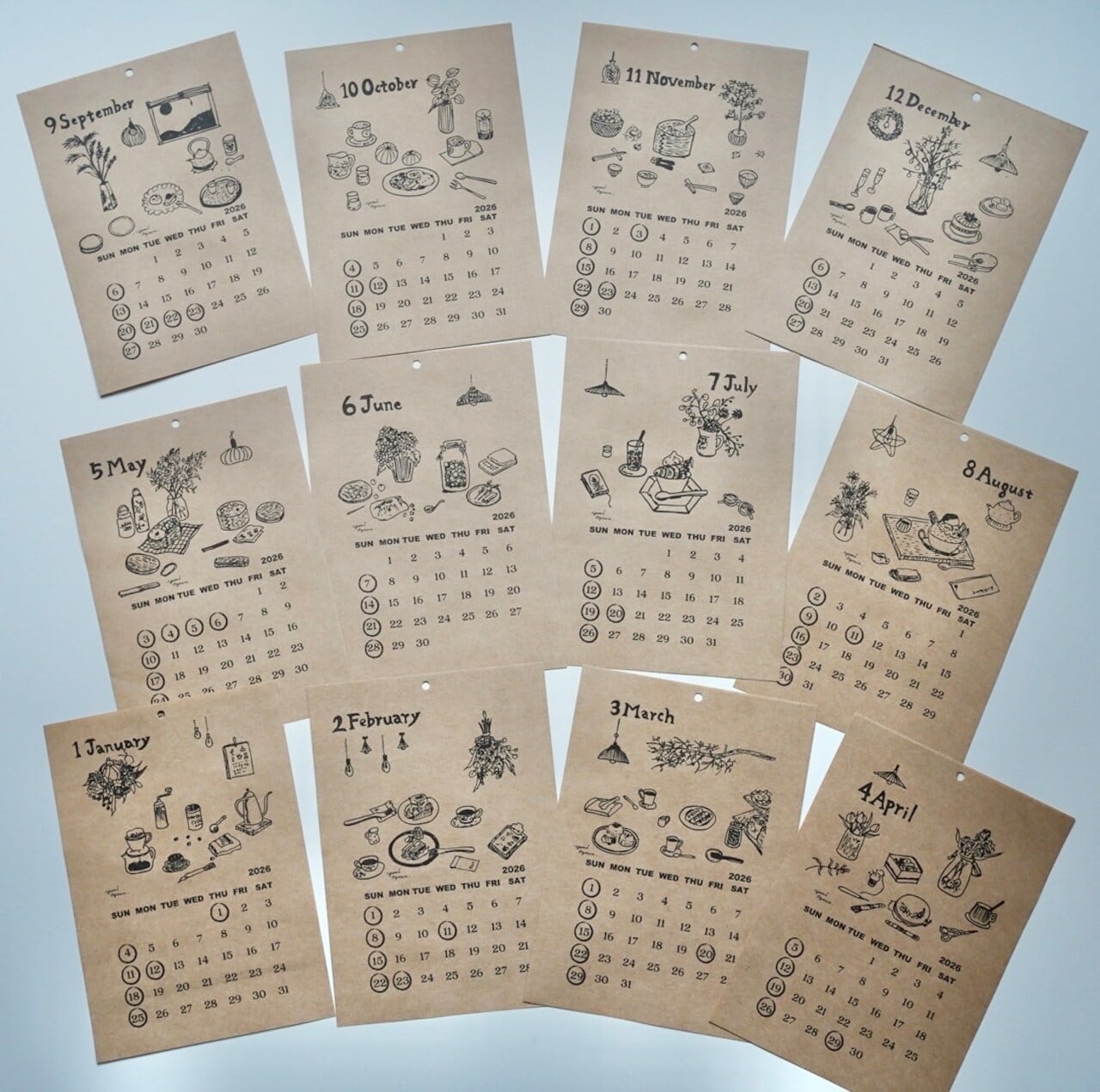 イラストレーターYumi Ogawaさんの2026年カレンダー。日々の暮らしの中の"テーブルの上のもの"を題材に小川ユミさんが描き上げました。1月から12月まで12種類のイラストがお楽しみいただけます。