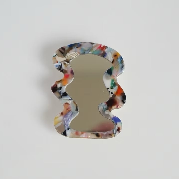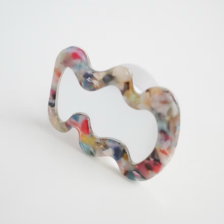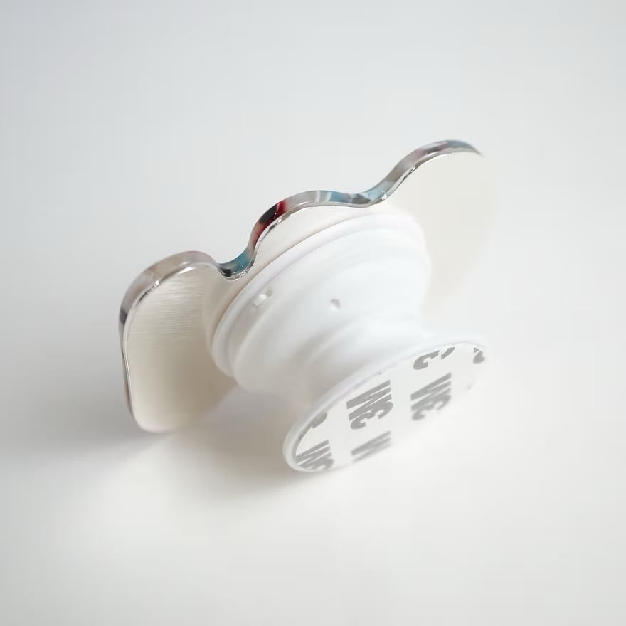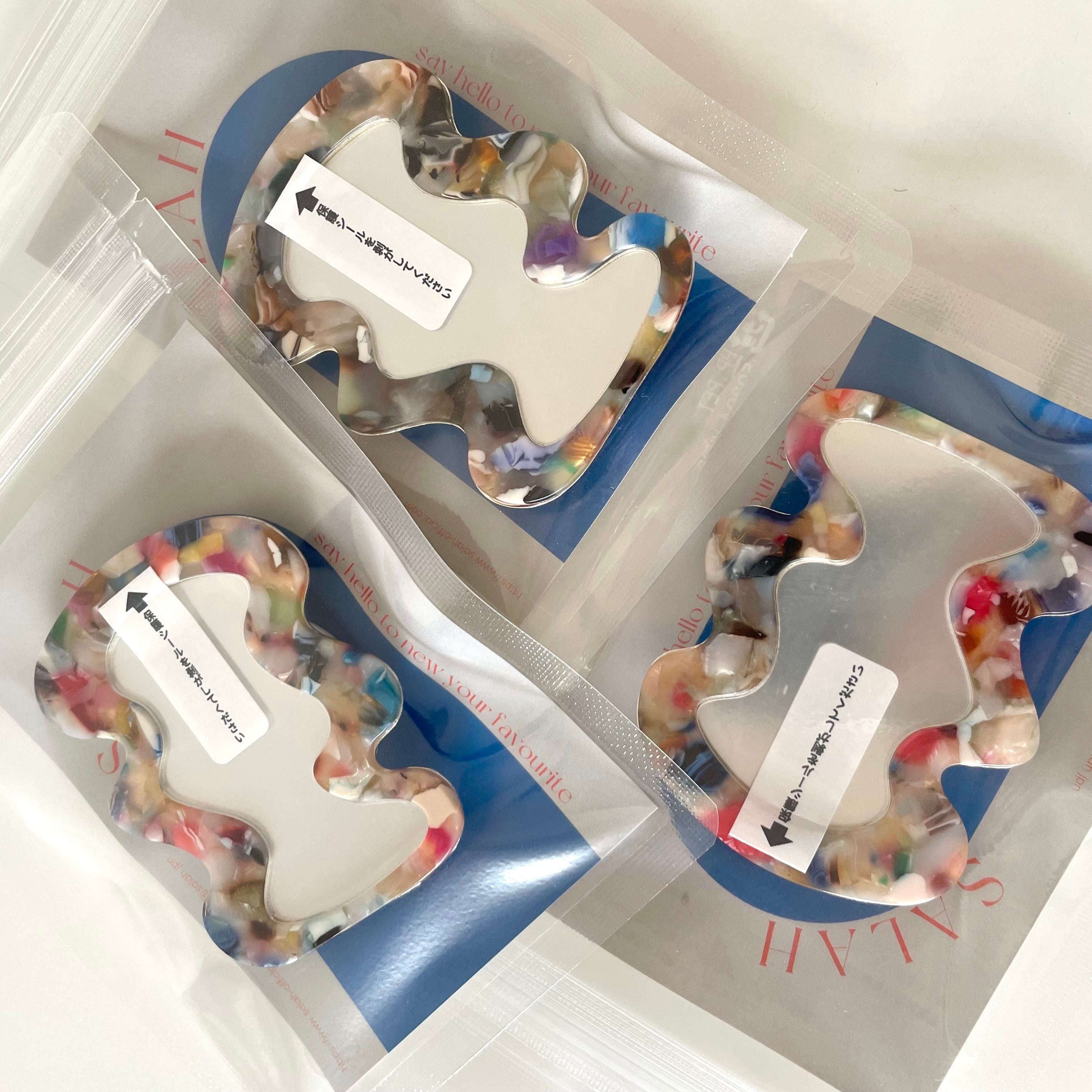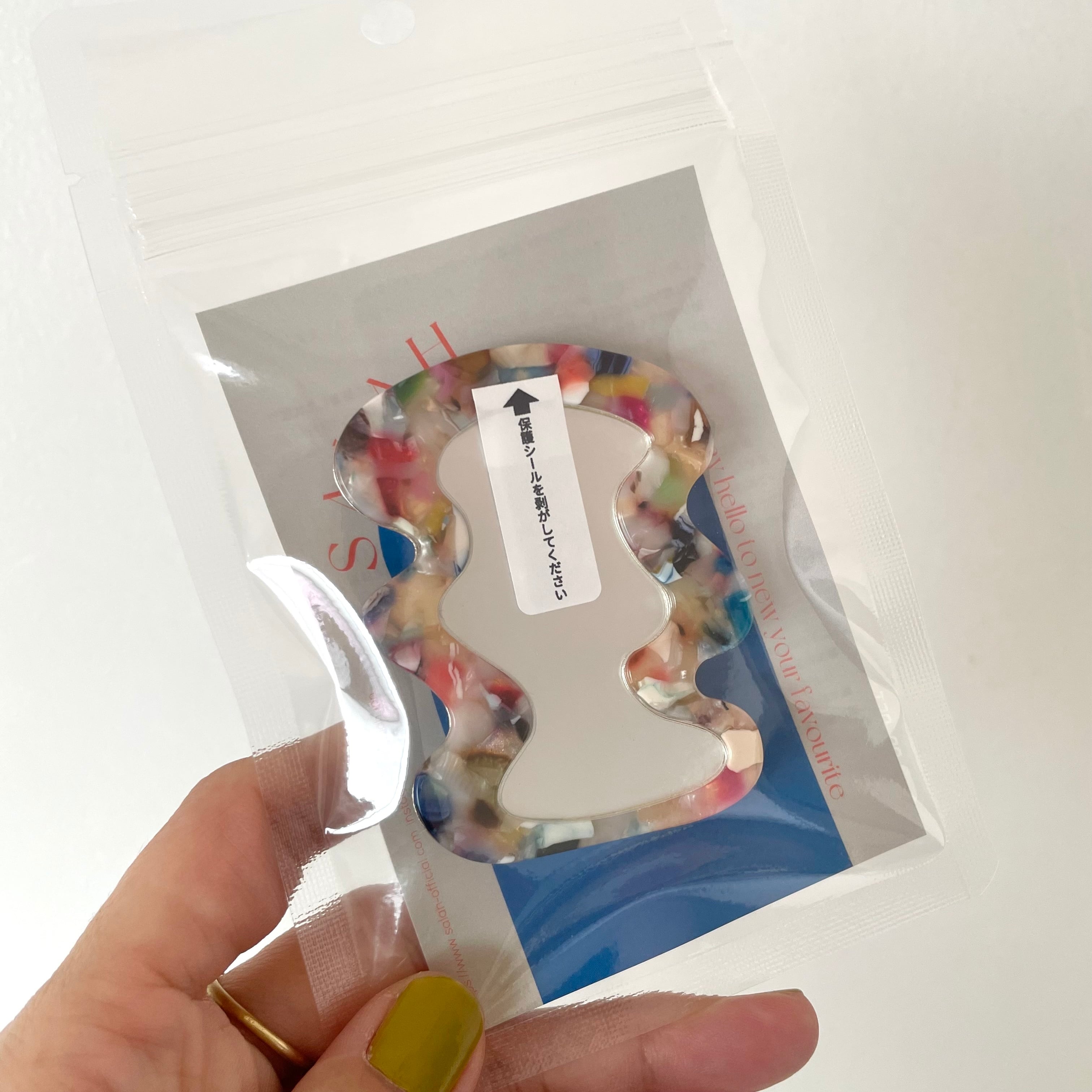 遊び心あふれる独特なウェーブ型のアクリルフレームが目を引く、SALAH(サラ)のミラー付きスマートフォン用グリップ。持つだけで手元が華やぎ、ファッションアイテムとしてもお楽しみいただけます。中央に配されたミラーはアクリル製でありながら歪みが少なく、ちょっとしたメイク直しや身だしなみチェックにも十分使える実用的なクオリティを保っています。このモチーフを引っ張ることでグリップ部分を2段階の高さに調整できるため、指を挟んでしっかりとスマートフォンをホールドできるのはもちろん、スタンドとしても活躍し、動画視聴時などに便利な角度に簡単に調整が可能です。グリップの後面には強力な粘着テープがついており、シートを剥がしてケースの平らな面に貼り付けて使用します。