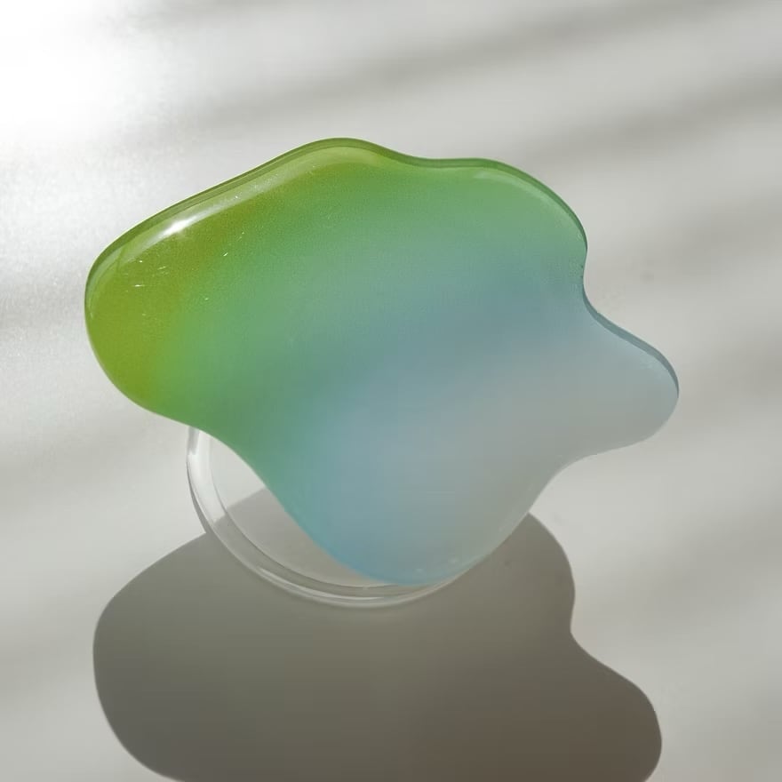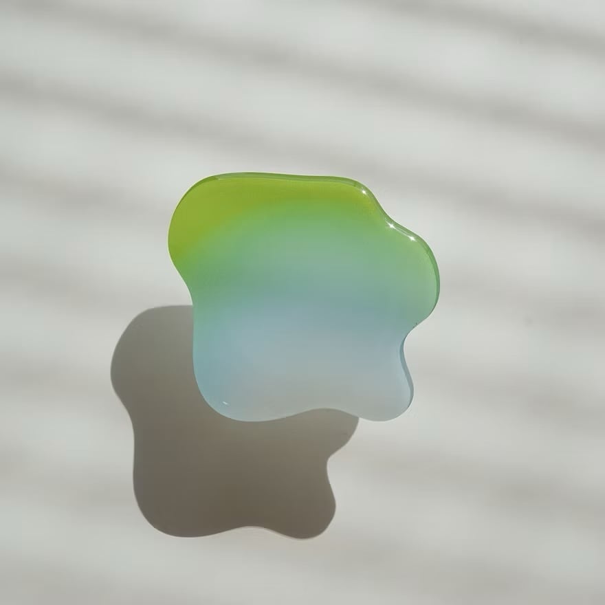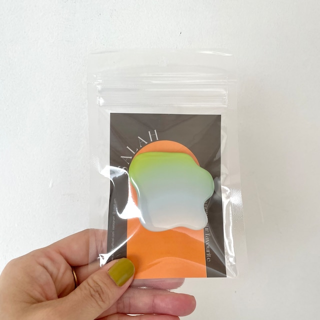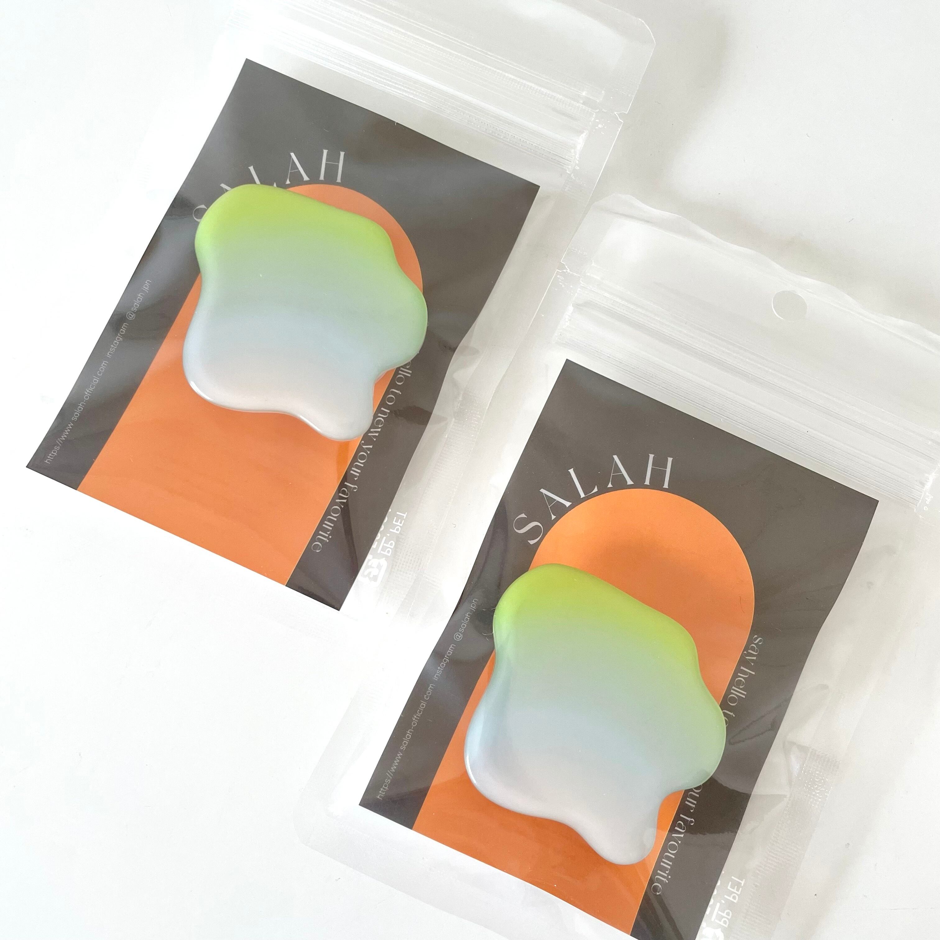 柔らかな曲線のウェーブモチーフが特徴のSALAHのスマートフォン用グリップ。鮮やかなライムグリーンからミントグリーン、そしてクリアなホワイトへと移り変わる美しいグラデーションが魅力! 光の当たり方や角度によって表情を変え、手元を優しく、アートピースのように彩ります。