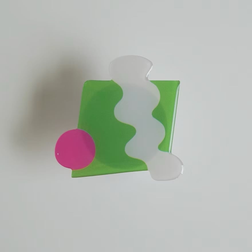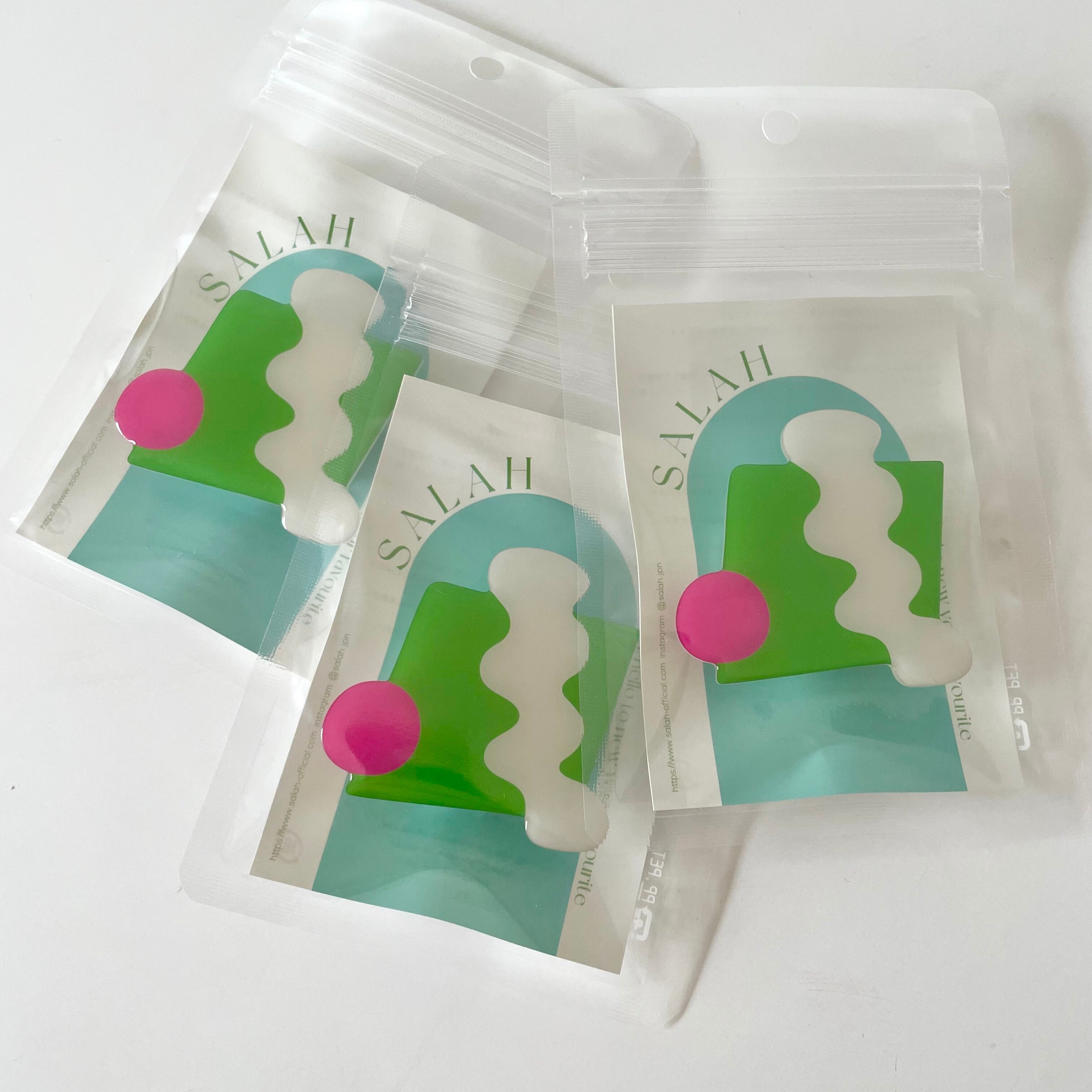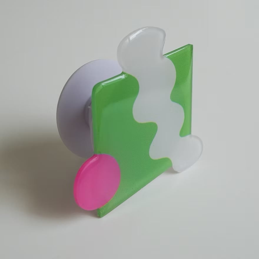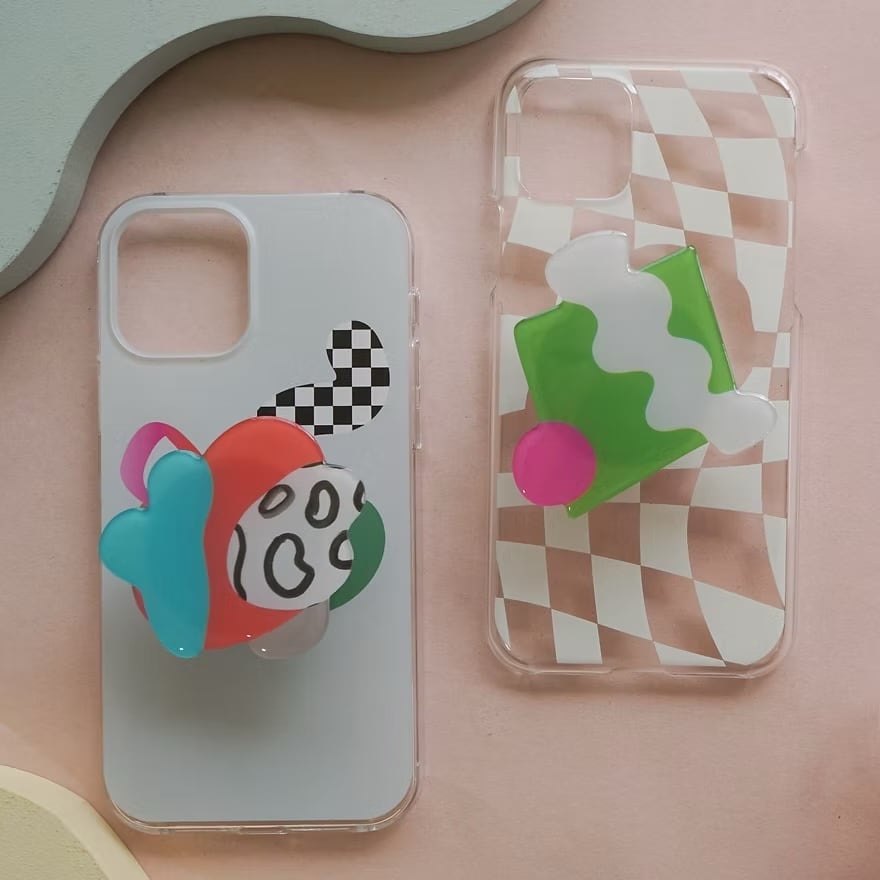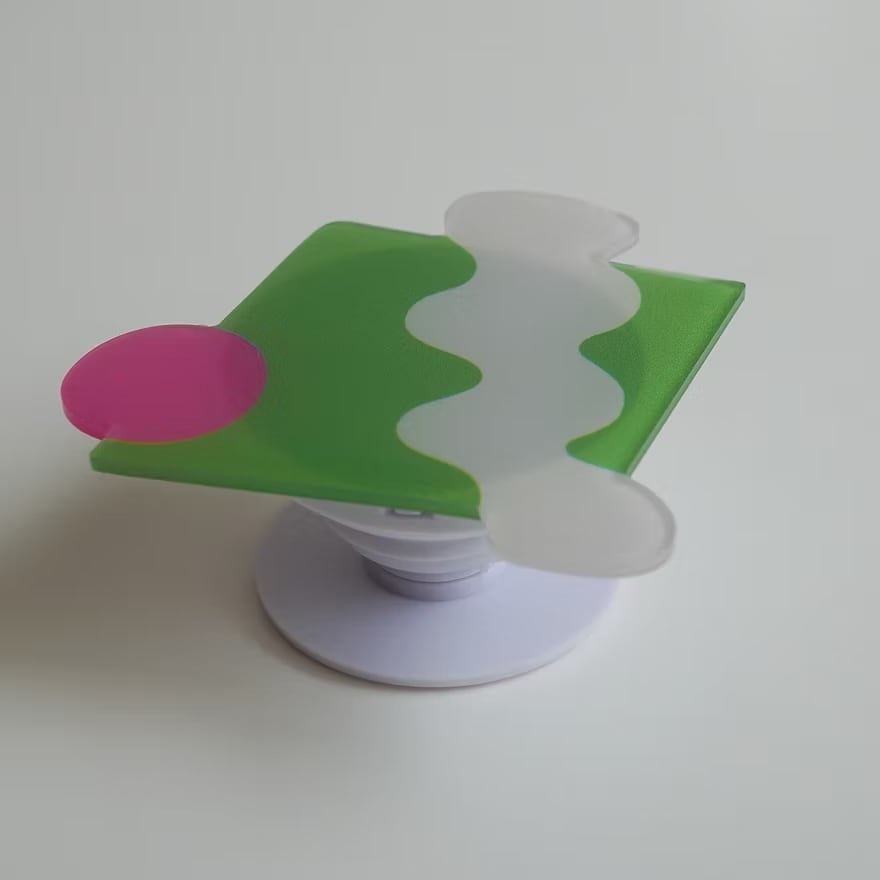 鮮やかなライムグリーンをベースに、ホワイトのウェーブ模様とピンクのサークルを組み合わせた、SALAHのアートピースのようなスマートフォン用グリップ。異なる形と色が重なり合うデザインは、抽象画のようなモダンな雰囲気で、手元に強烈な個性をプラスします。