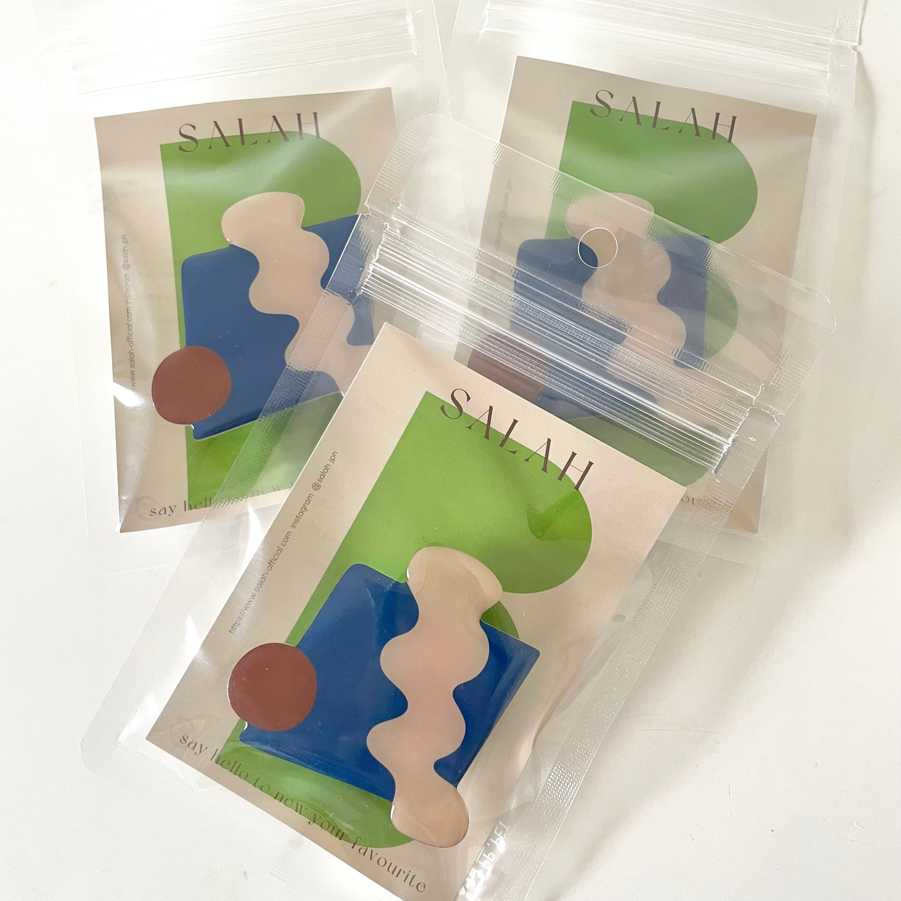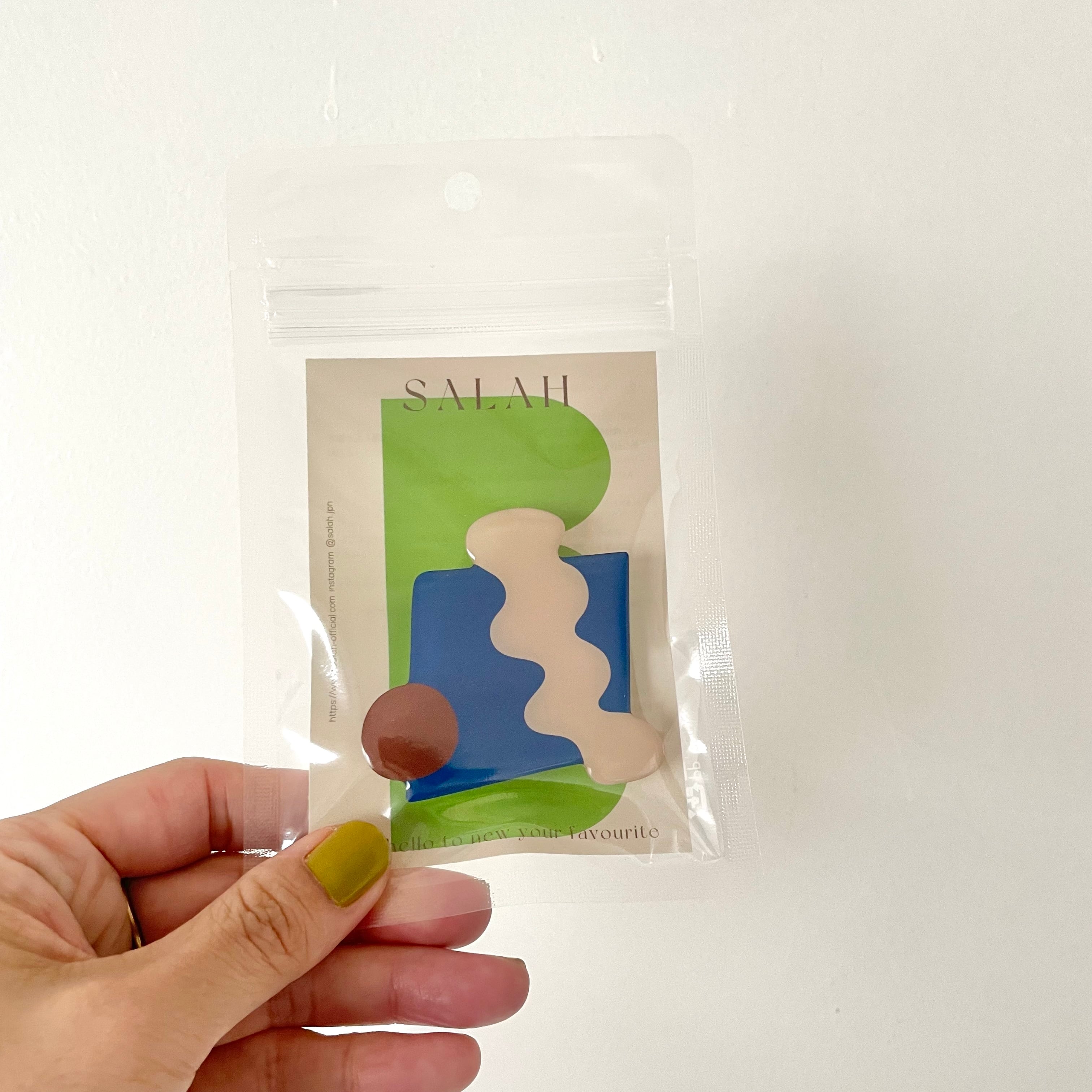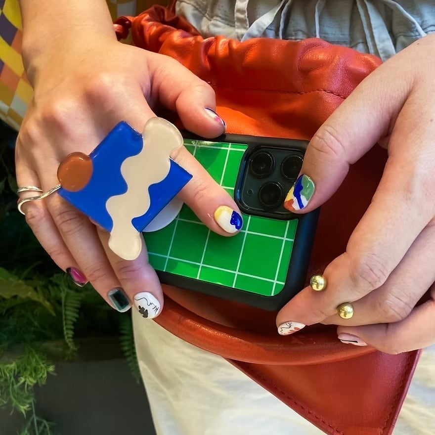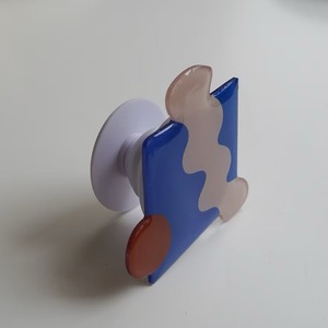 鮮やかなコバルトブルーのスクエアをベースに、くすみピンクのウェーブとテラコッタカラーのサークルを組み合わせた、SALAHのアートピースのようなスマートフォン用グリップ。色や形のレイヤーが際立つモダンなデザインは、シックでありながらも大胆な存在感を放ち、手元を洗練された印象に演出します。