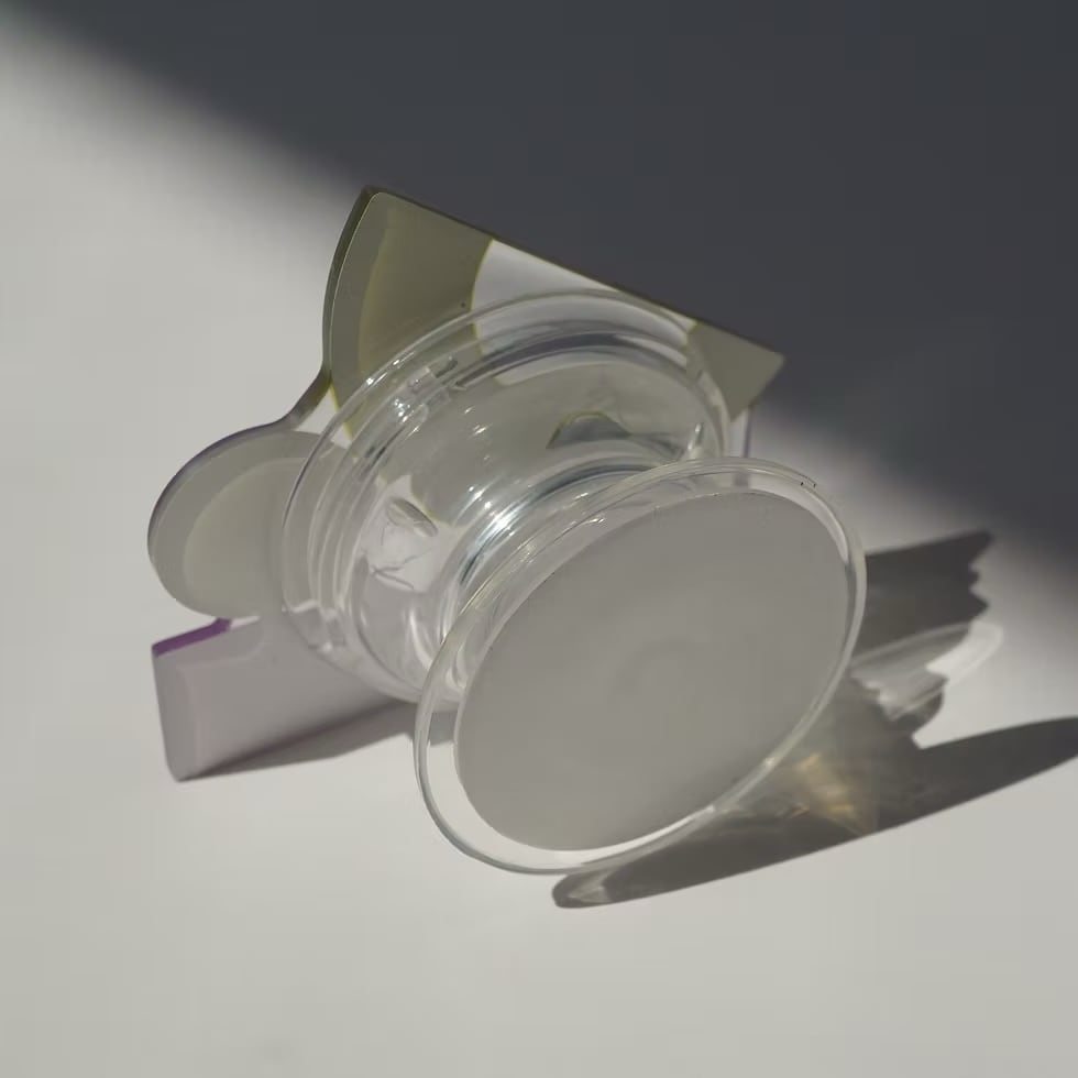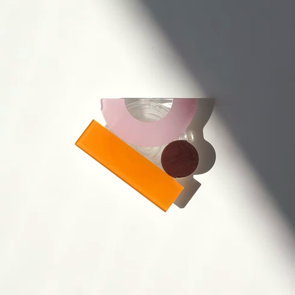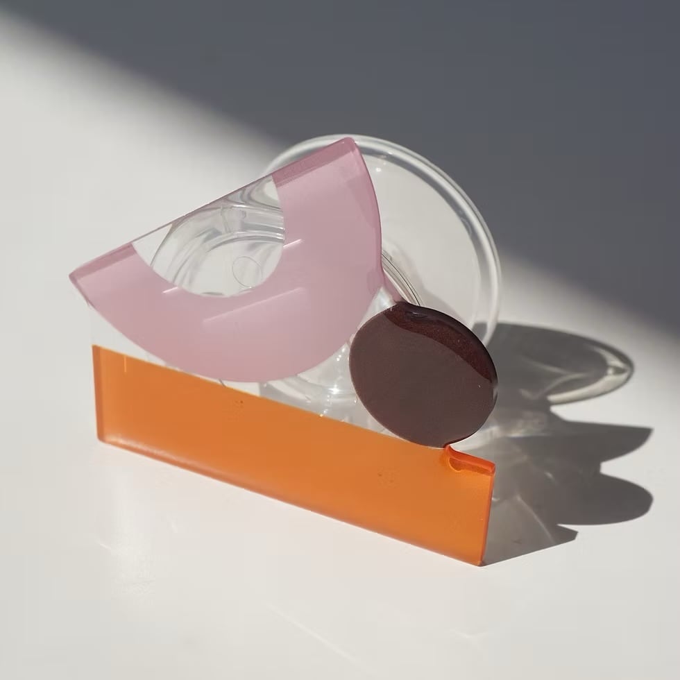 まるで抽象画から飛び出したかのような、ユニークな形と色彩の組み合わせが魅力のスマートフォン用グリップ。ピンクの半円、鮮やかなオレンジの長方形、シックなブラウンのサークルなど、異なるカラーが大胆にレイヤードされており、一つ一つがアートピースのような強い個性を放ちます。このモダンなデザインは、日々のスマートフォンをファッションアイテムへと昇華させます。