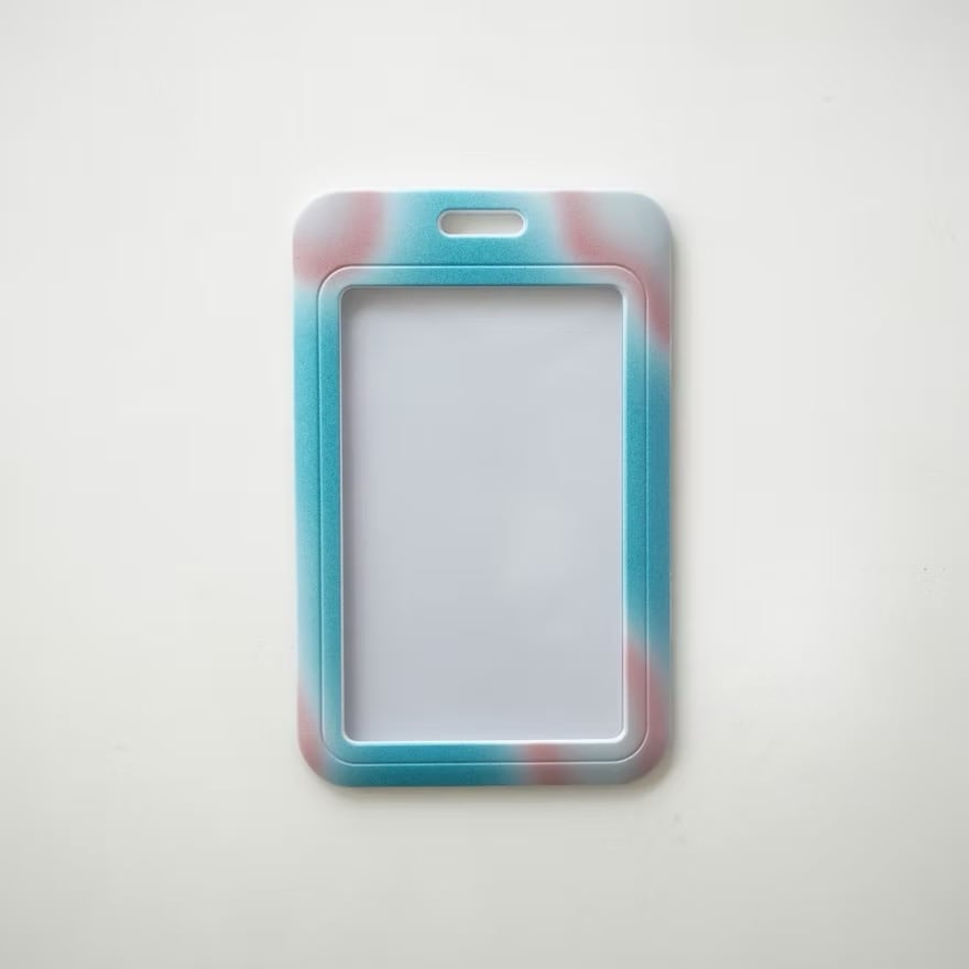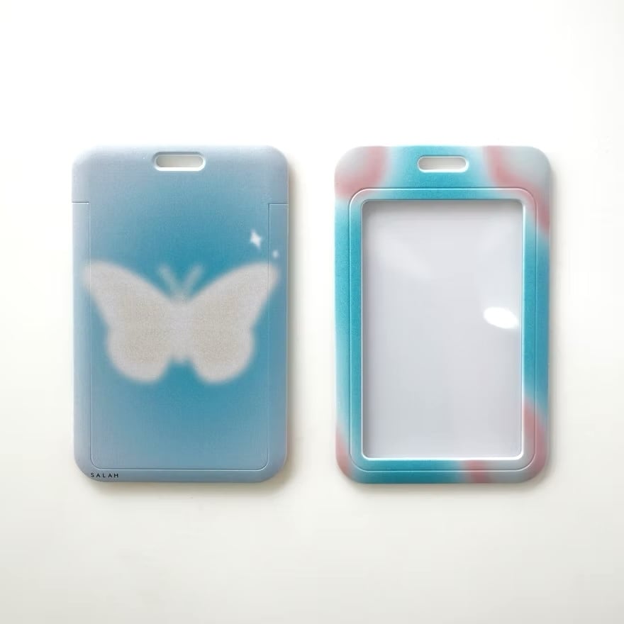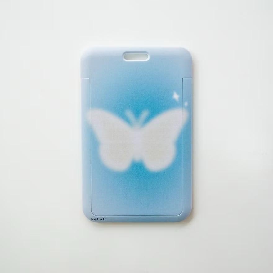 SALAHの幻想的なデザインが目を引くカードケース。背面には、霧の中に浮かび上がるようなバタフライのモチーフが描かれており、淡いブルーのニュアンスカラーと相まって、夢見るような雰囲気を醸し出しています。前面のフレームは、ブルーとピンクのムラ感のあるグラデーションになっており、個性とトレンド感を両立させたデザインです。