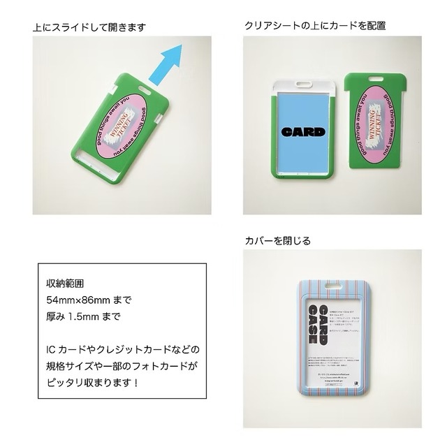 このカードケースはスライドして開閉するタイプで、ICカードやクレジットカード、またお気に入りのフォトカードなどをスマートに収納できます。お手持ちのICカードと同じサイズであれば、ピッタリと収まります。