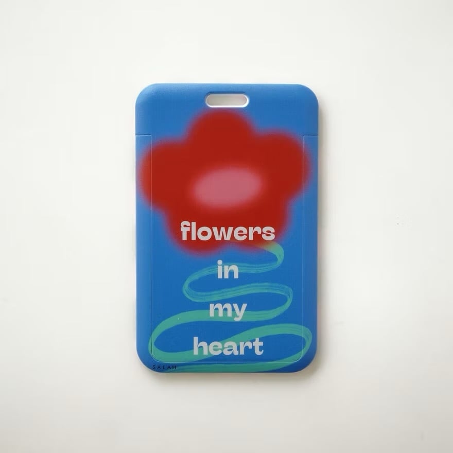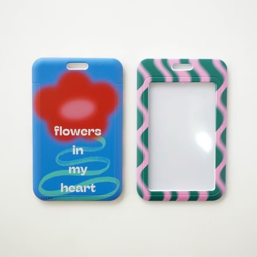 SALAHの個性的で目を引くデザインのカードケース。背面には、「flowers in my heart」というメッセージとともに、鮮やかな赤の大きな花とグリーンのリボンが描かれています。前面のフレームは、グリーンとピンクのストライプ柄になっており、レトロでガーリーな雰囲気が手元に華やかさを添えます。