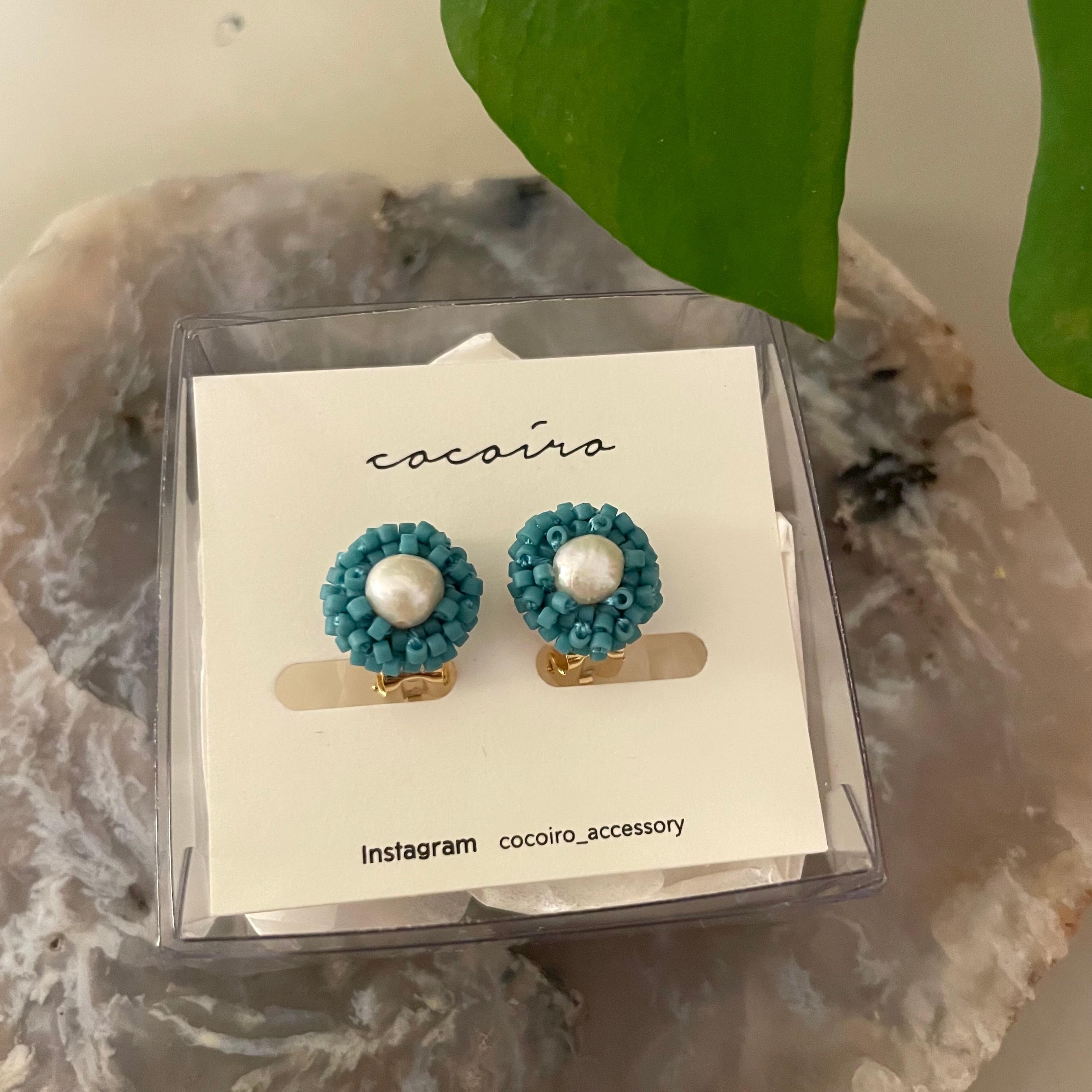 ころんとしたフォルムが愛らしい、cocoiroのピアス/イヤリング。鮮やかなターコイズブルーのビーズを丁寧に編み上げ、中心には上品な光沢を放つ淡水パールをあしらいました。
