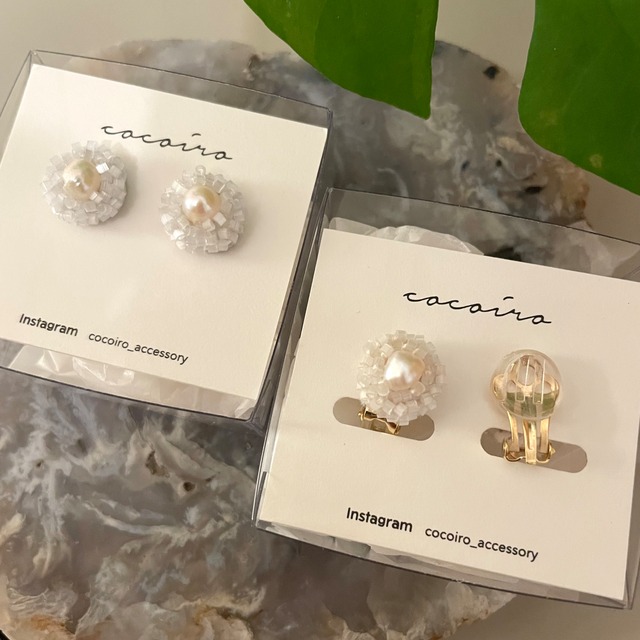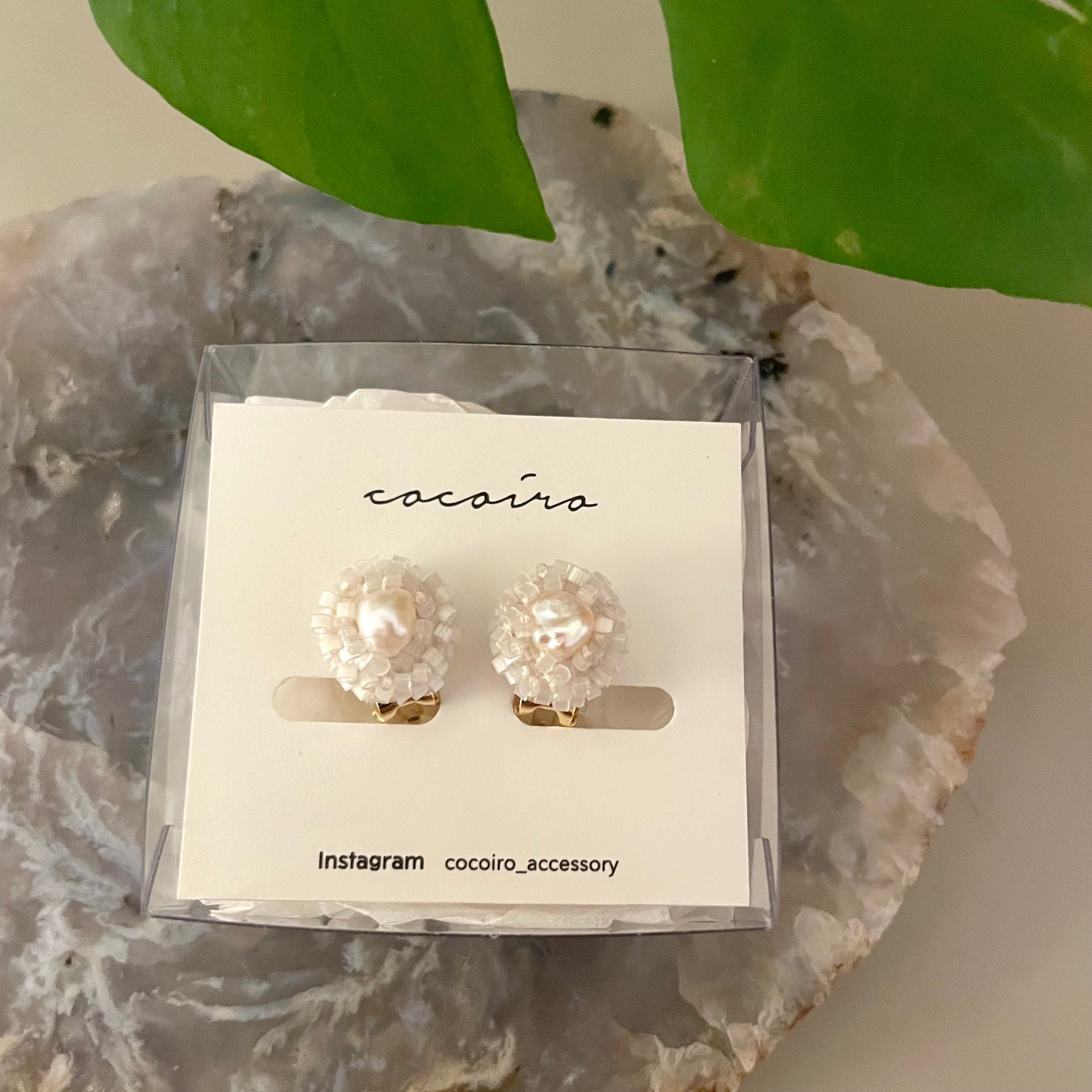 ころんとしたフォルムが愛らしい、cocoiroのピアス/イヤリング。美しいホワイトのビーズを丁寧に編み上げ、中心には上品な光沢を放つ淡水パールをあしらいました。