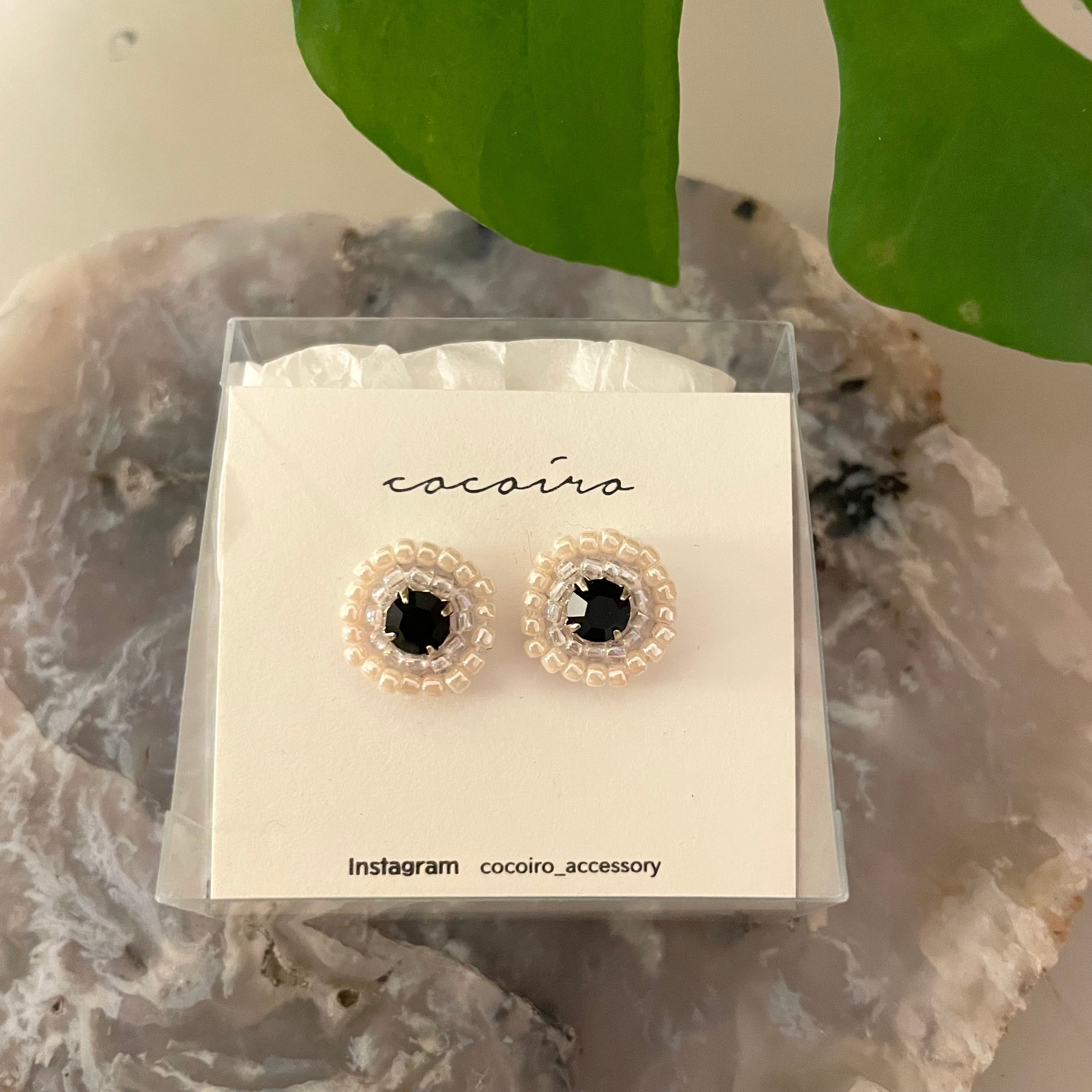 ころんとしたフォルムが愛らしい、cocoiroのピアス。美しいビーズを丁寧に編み上げ、中心には上品な光沢を放つブラックのビジューをあしらいました。