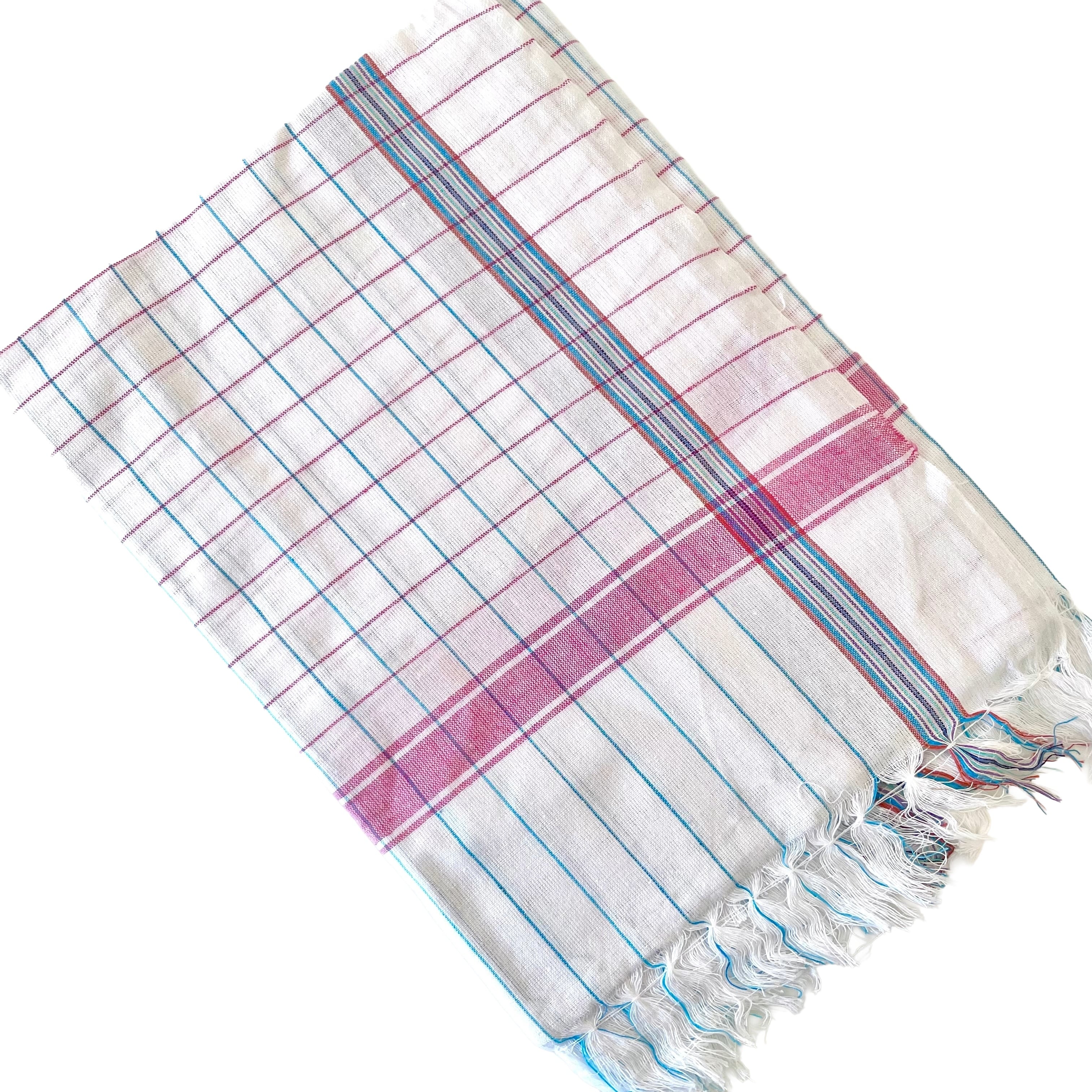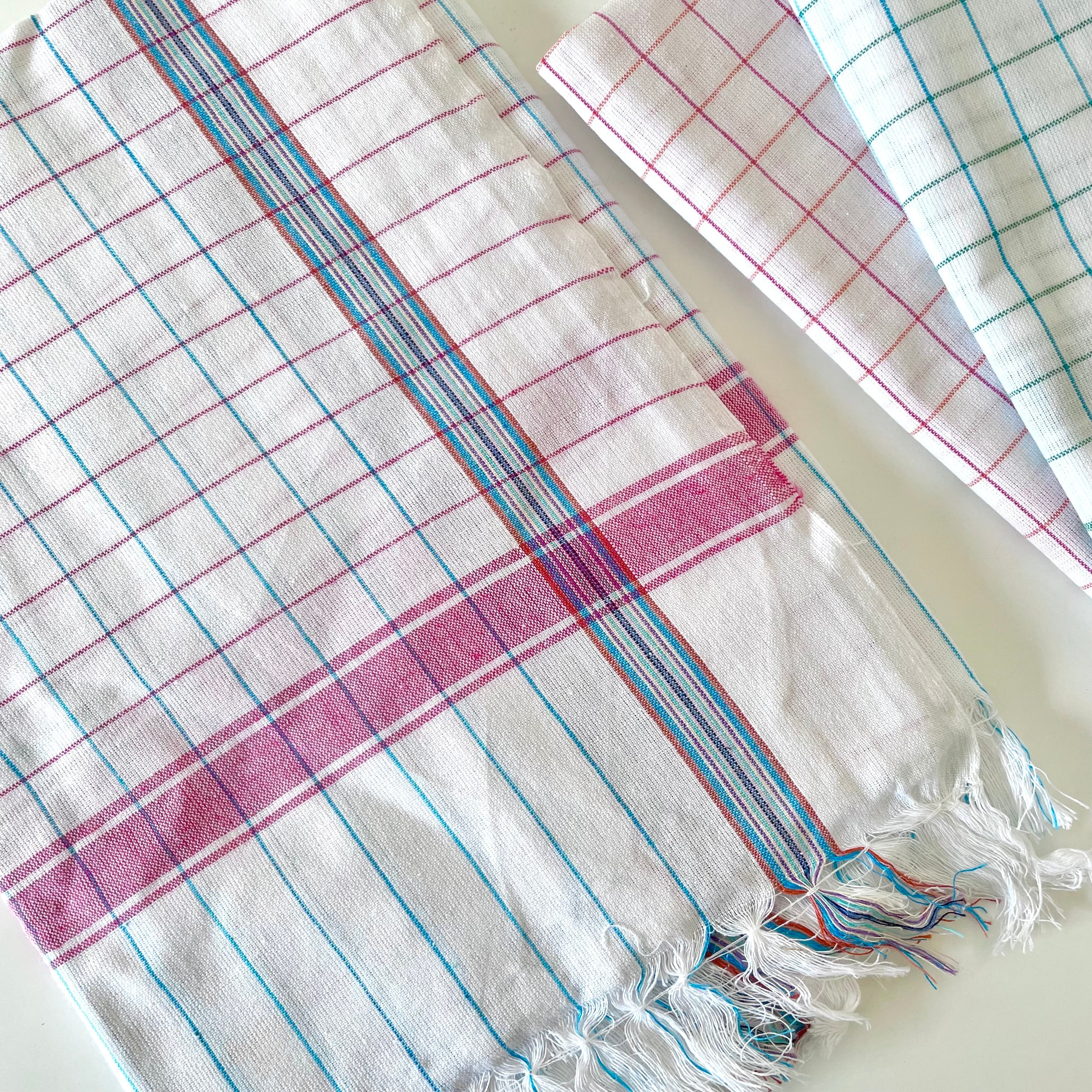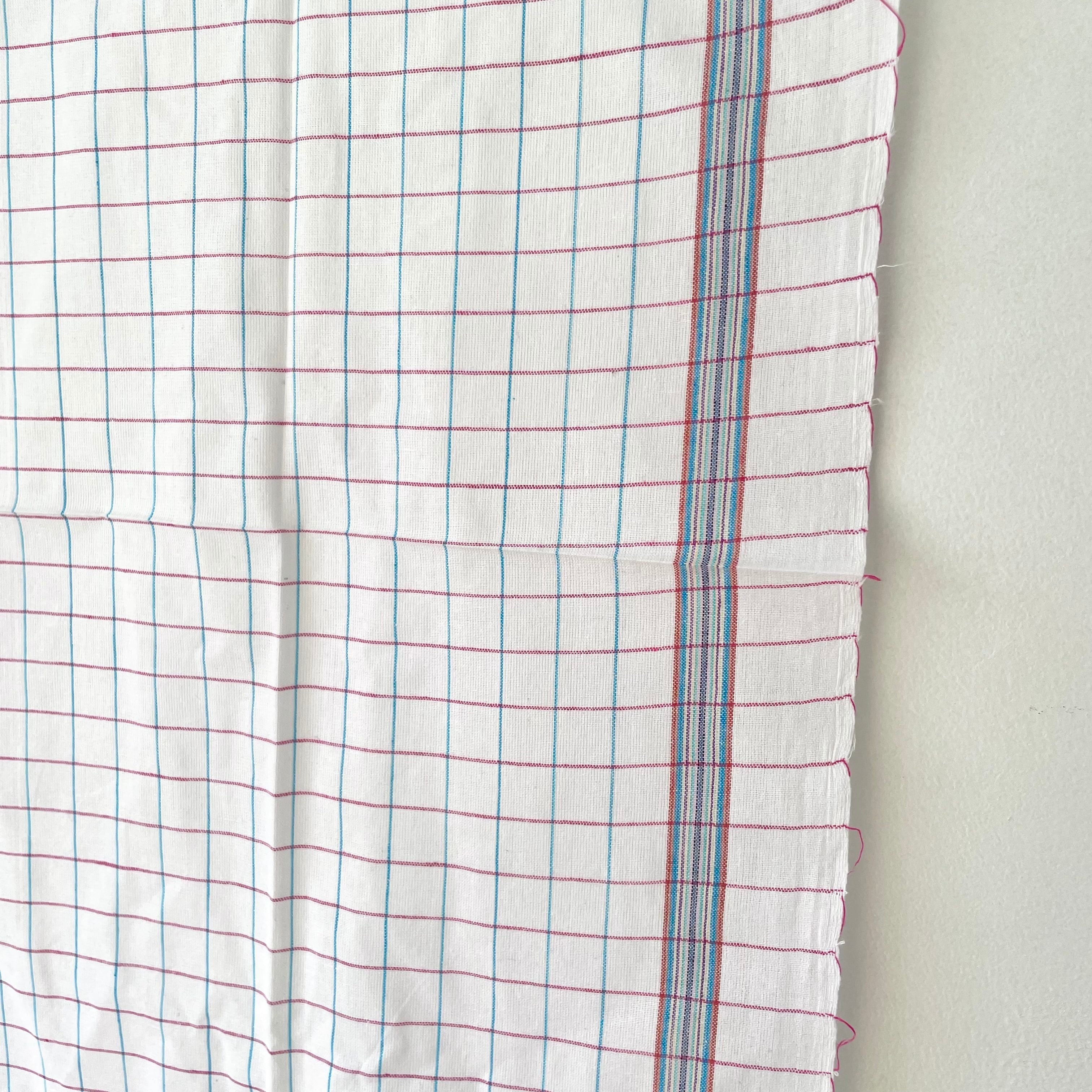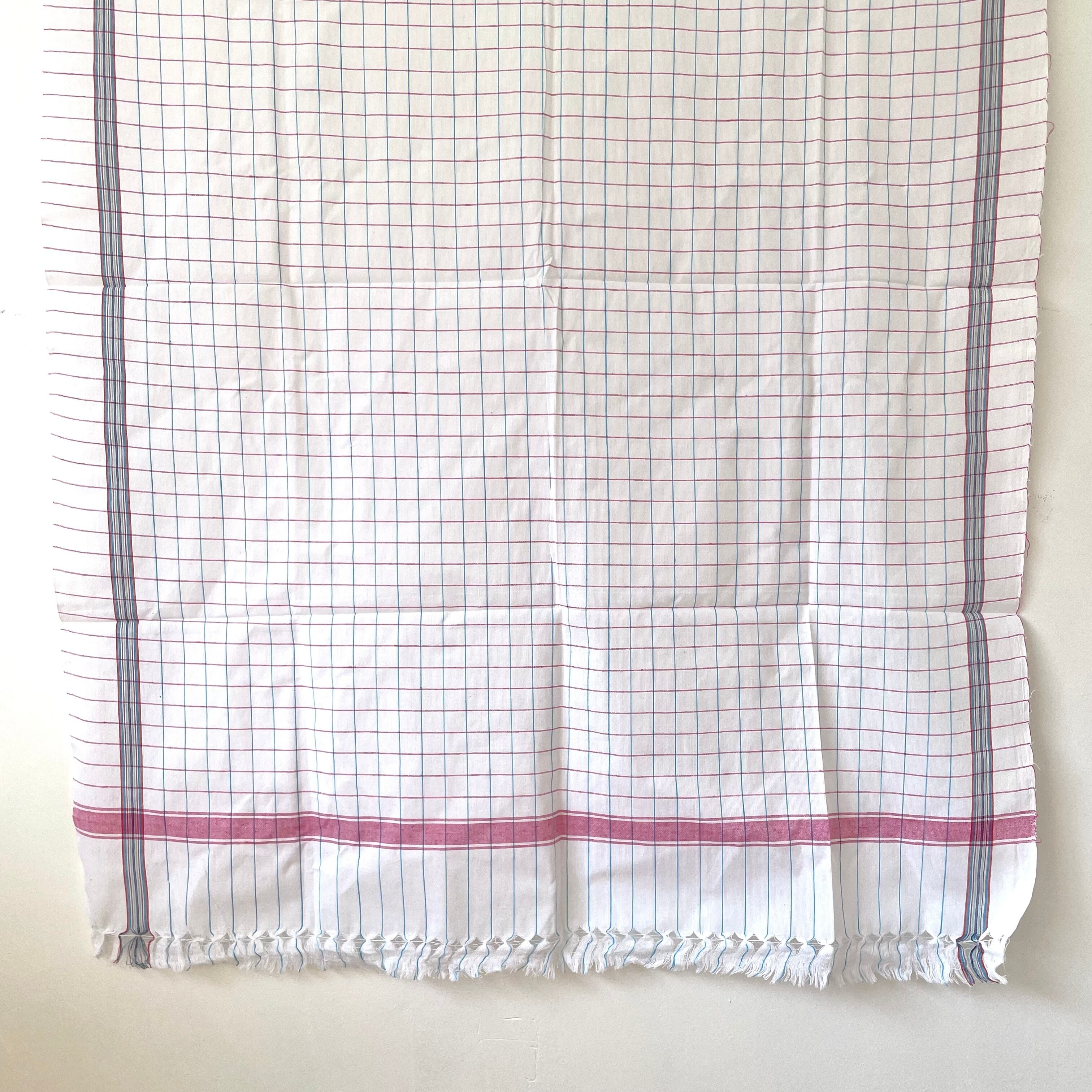 インドの伝統的な織りの技術が生み出した、カラフルでPOPな色合いが素敵なコットンファブリック。白地にレッド、ブルーなどの鮮やかな色が交差する爽やかなタータンチェック柄は、お部屋に明るいアクセントをもたらし、空間を楽しく彩ります。素材は上質なインド綿(コットン100%)を使用しており、軽やかで吸湿性に優れ、肌触りが非常に良いのが特徴です。お洗濯を繰り返すほどに、さらに柔らかく肌に馴染む風合いの変化もお楽しみいただけます。約170cm × 85cmという使い勝手の良いサイズ感で、ダイニングテーブルに敷いてテーブルランナーとして使ったり、棚や収納の目隠し布としてご活用いただけます。また、ソファやベッドにラフに掛けてインテリアの雰囲気を変えるのもおすすめです。両端にあしらわれた、手作業の温かみが感じられるフリンジが、デザインに軽快な表情を加えています。