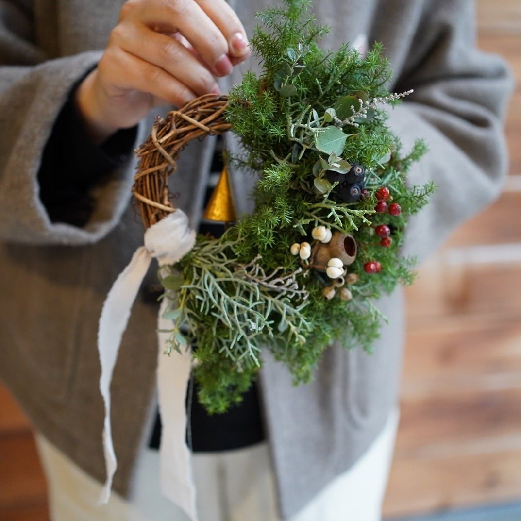 伝統的なリースをモダンに解釈した、ハーフ(半円形)スタイルのクリスマスリース。土台となる蔓(つる)のナチュラルな美しさを活かしつつ、片側に豊かなフレッシュグリーンと木の実を大胆に集めることで、動きとリズムのあるデザインが生まれています。