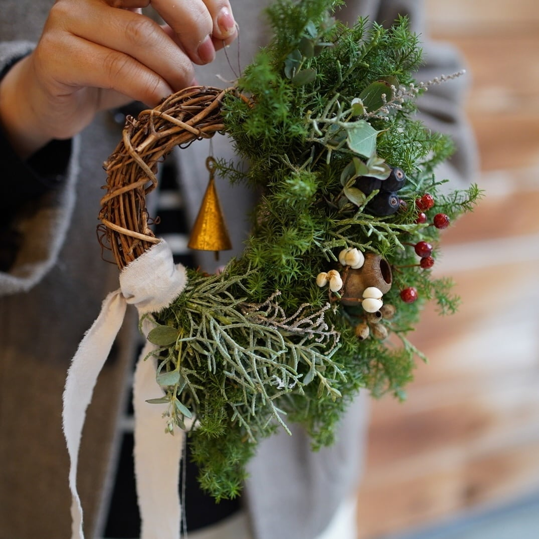 リースには、白いリボンが優雅なアクセントを添え、リースの奥には、アンティーク調のゴールドのベルが控えめに顔を覗かせます。使用されているフレッシュな針葉樹の清々しい香りも魅力の1つ。お届け後、時間の経過とともにゆっくりとドライへと変化し、その移ろいゆく姿を長くお楽しみいただけます。