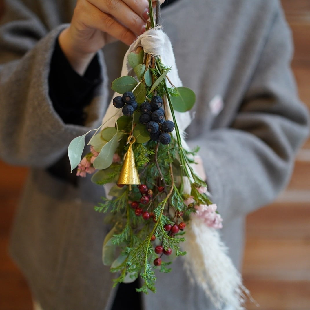 束ねたグリーンからは、清々しい森の香りが優しく漂い、お部屋の空気を心地よくしてくれます。アクセントとして添えられたアンティークゴールドのベルが、揺れるたびにチリンと鳴り、聖夜への期待感を静かに高めます。