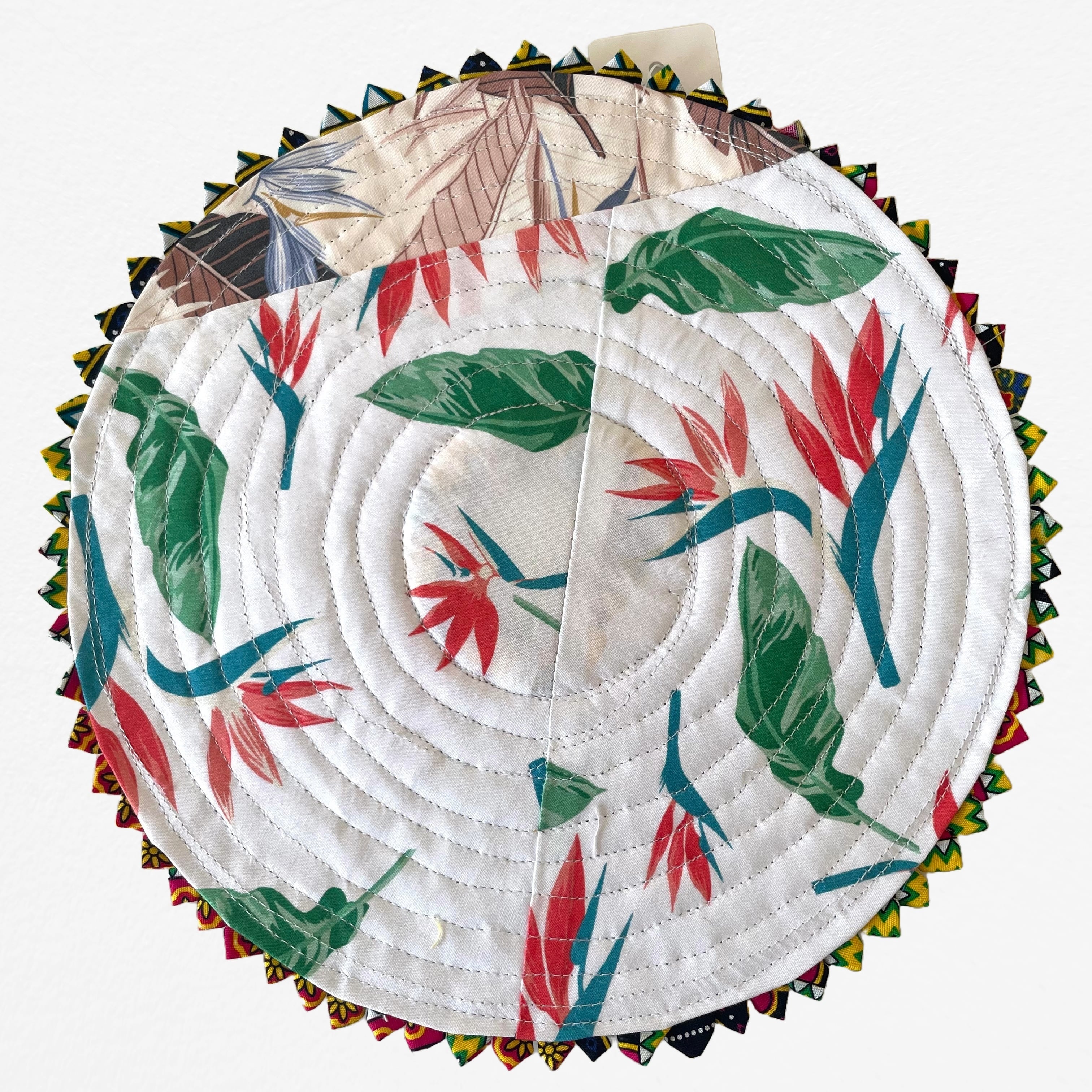 ひとつとして同じものはない、個性豊かな生地の組み合わせが、マット全体に深みと表情を与えています。さらに、裏生地には、エキゾチックな雰囲気を持つアフリカンな柄の生地を組み合わせることで、見えない部分にも遊び心とポップさが詰まった仕上がりとなっています。