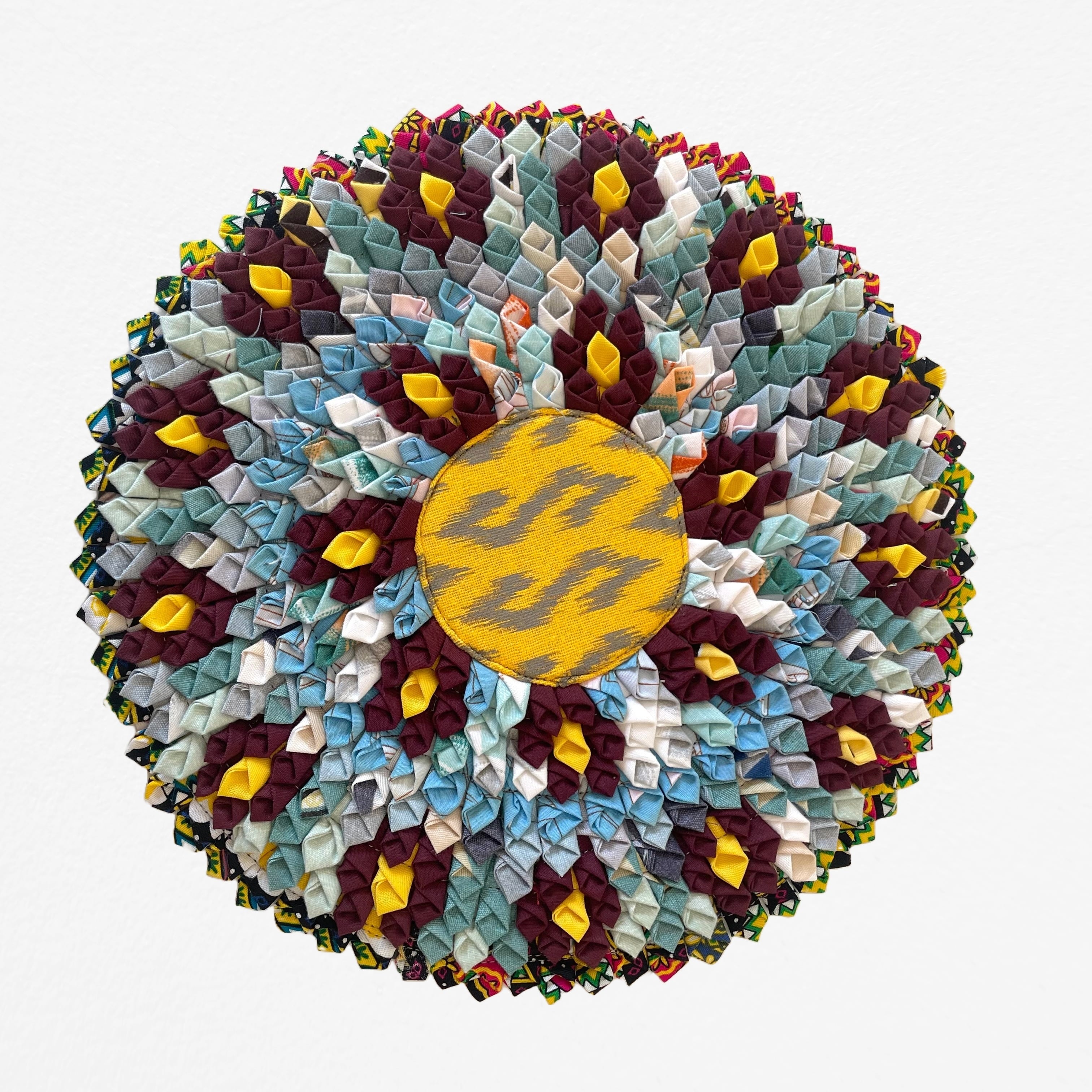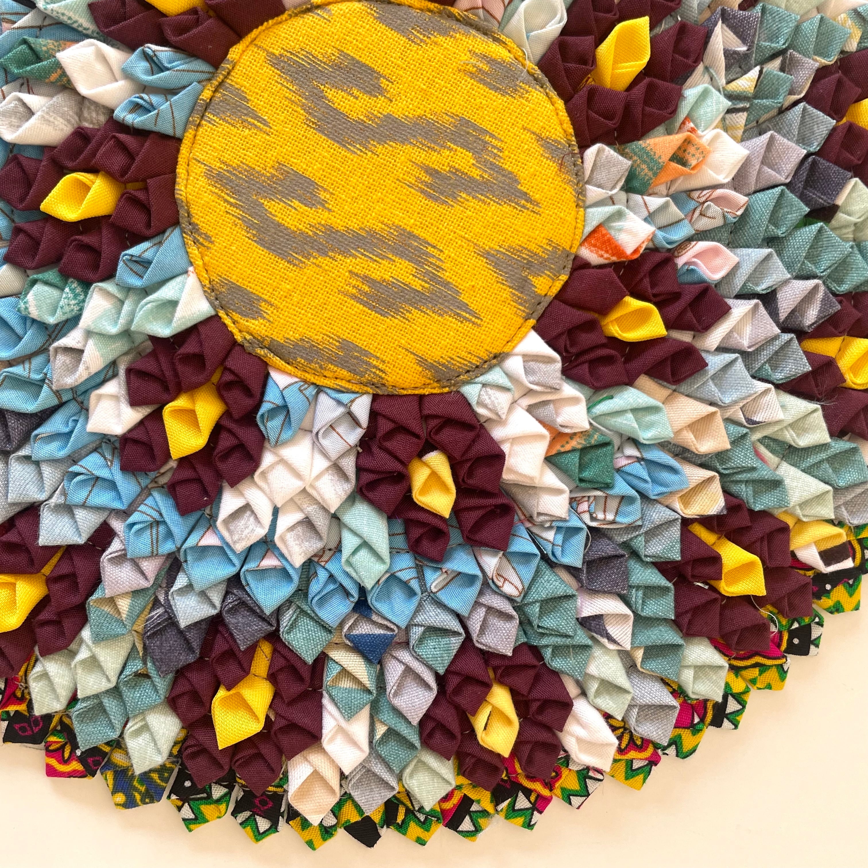 異なる生地とカラフルな色使いを組み合わせた立体的なテクスチャー。細かく折り曲げられた生地が幾重にも重なり、中央から外側へ向かって広がる花びらのような模様を描き出しており、これは現地の職人たちが時間をかけて生地を折り曲げ、組み合わせていく温かい手仕事の証です。