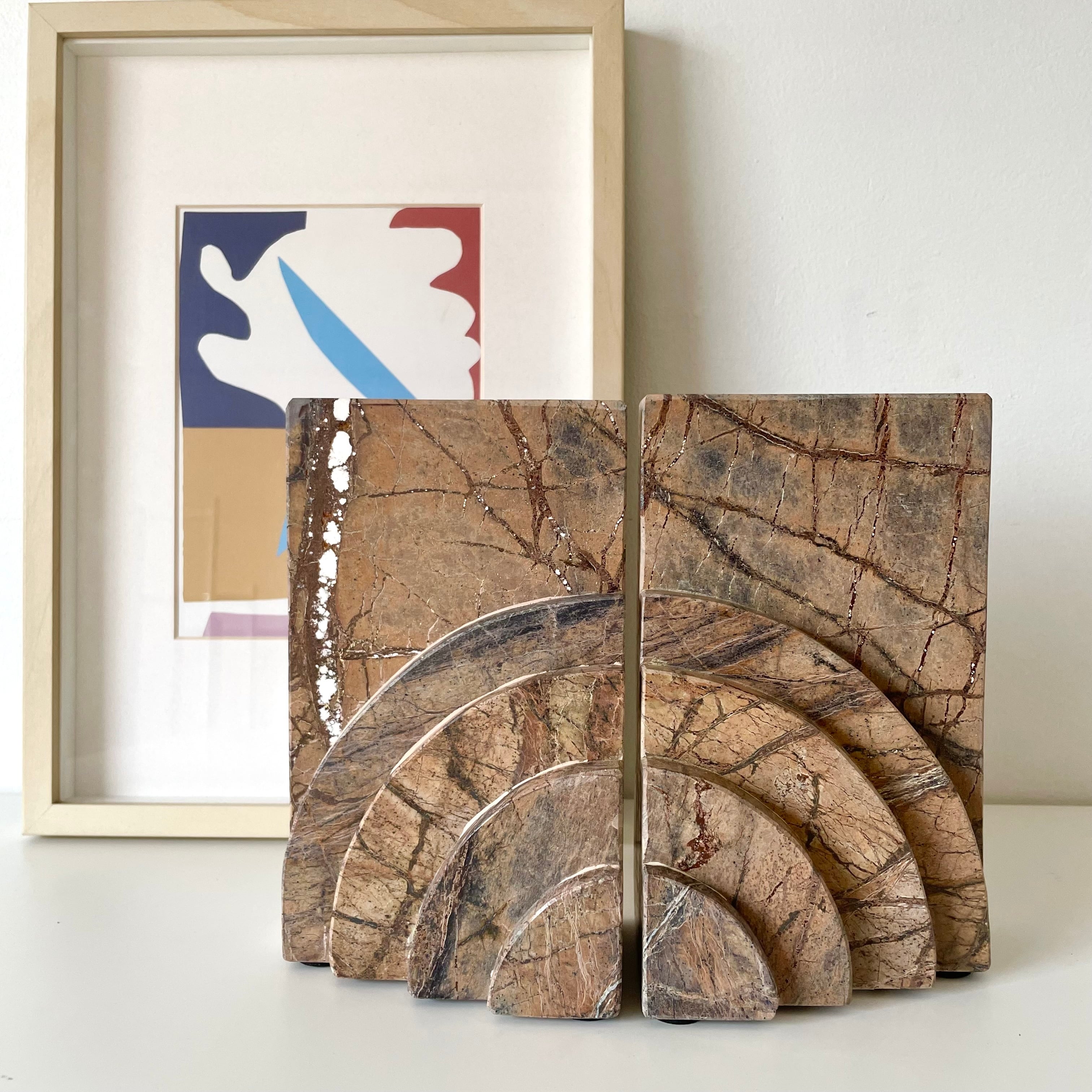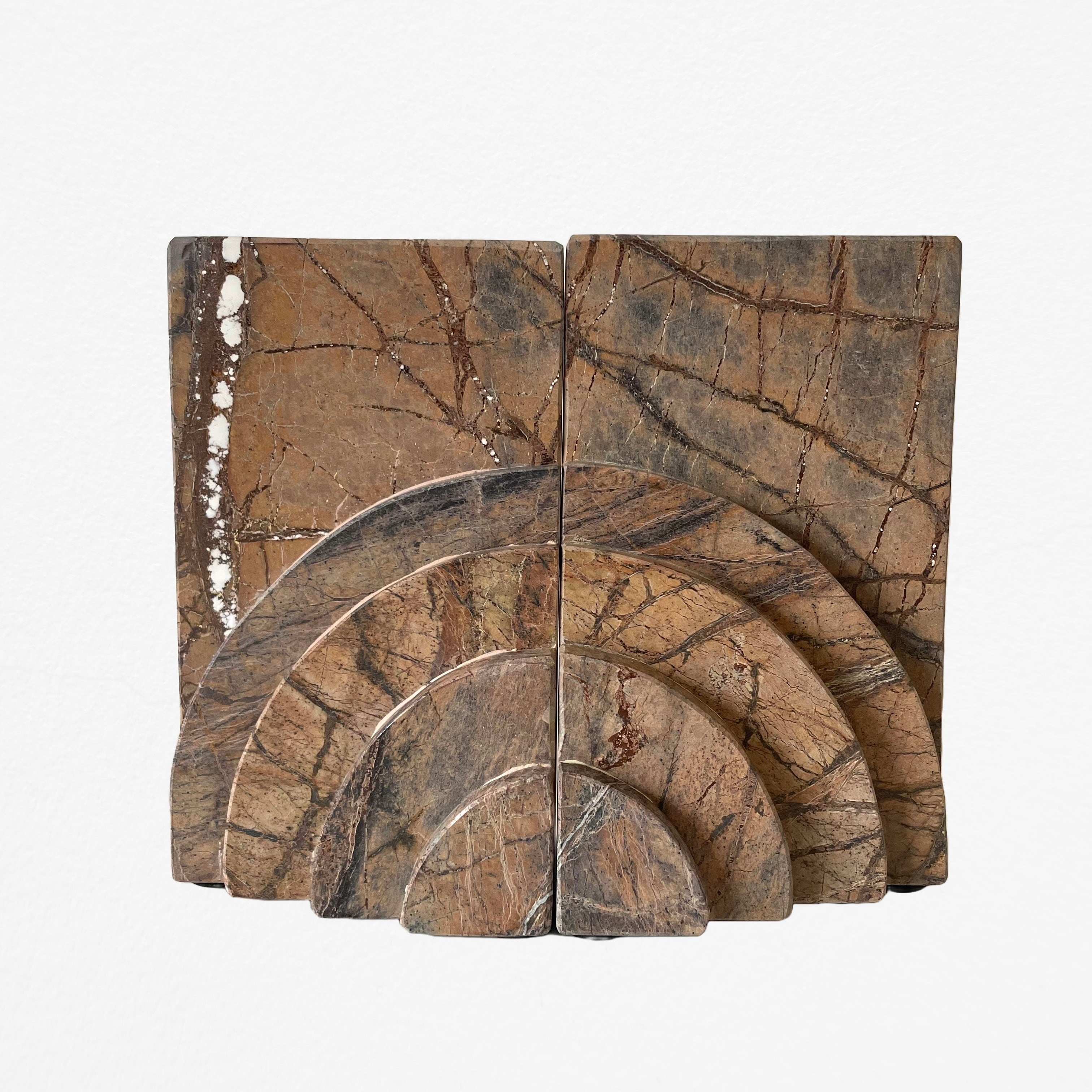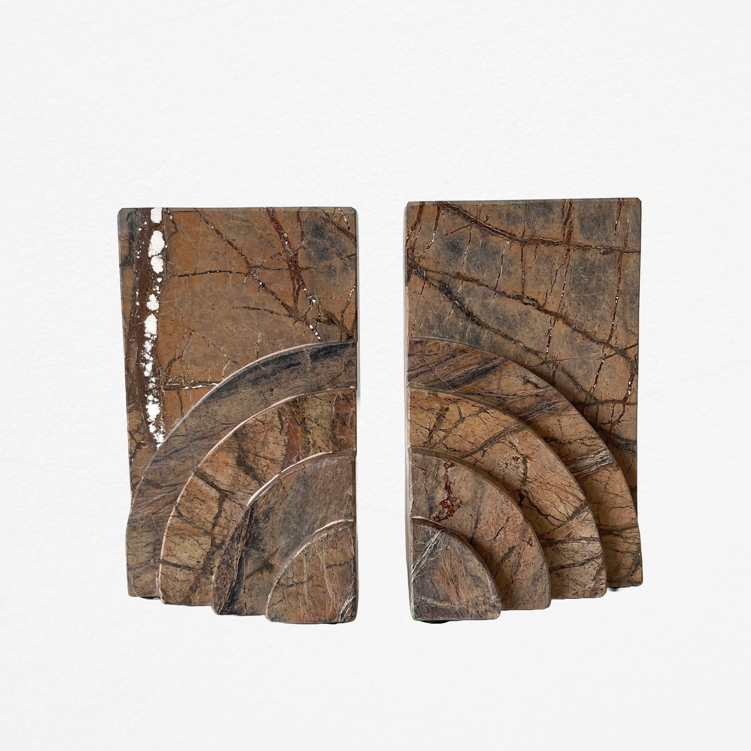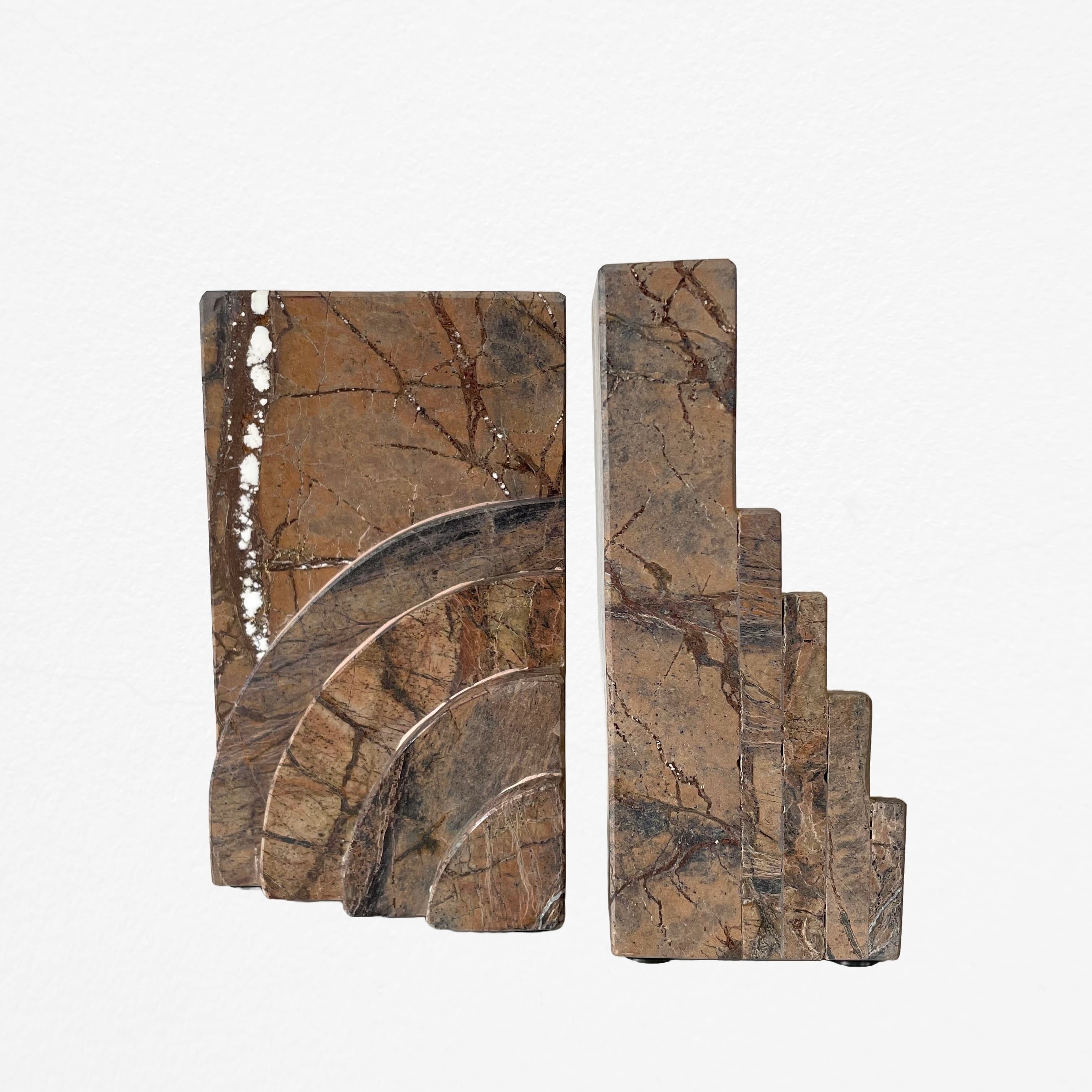 深みのあるブラウンマーブル天然大理石を贅沢に使用した、重厚感あふれるブックエンド。美しい白い筋(ベイン)と力強い茶色の地色が織りなす紋様は、まさに世界に二つとない自然のアートであり、置くだけで空間全体に知性とエレガンスをもたらします。ブロックには垂直な面から滑らかに流れるような階段状のデザインが施されており、この立体的な造形は、本を支える実用品という役割を超えて、まるでモダンアートの彫刻のような美しさを放ちます。