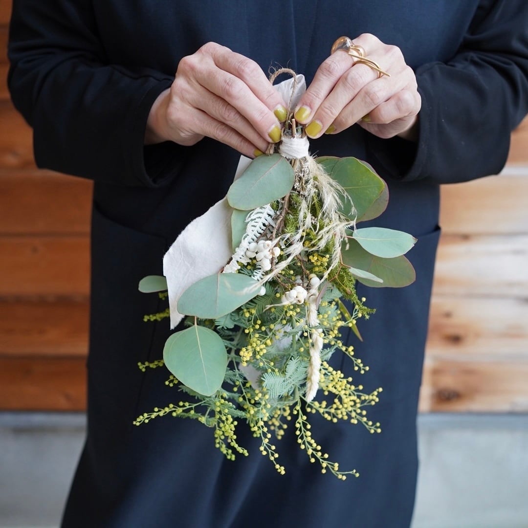 花作家hibaさんが手がける、瑞々しいユーカリの葉に春の光のようなミモザを添えたミニスワッグ。落ち着いたグリーンのグラデーションの中に、ミモザがアクセントとなり、壁に掛けるだけでお部屋に穏やかな春の風を運んできてくれます。愛らしいサイズ感ながら、厳選された花材を幾層にも重ねた立体的な仕上がりは、作家ならではの繊細な手仕事を感じさせます。そのままドライへと変化していく過程も美しく、移ろいゆく季節の表情を長く楽しんでいただけるのが魅力です。