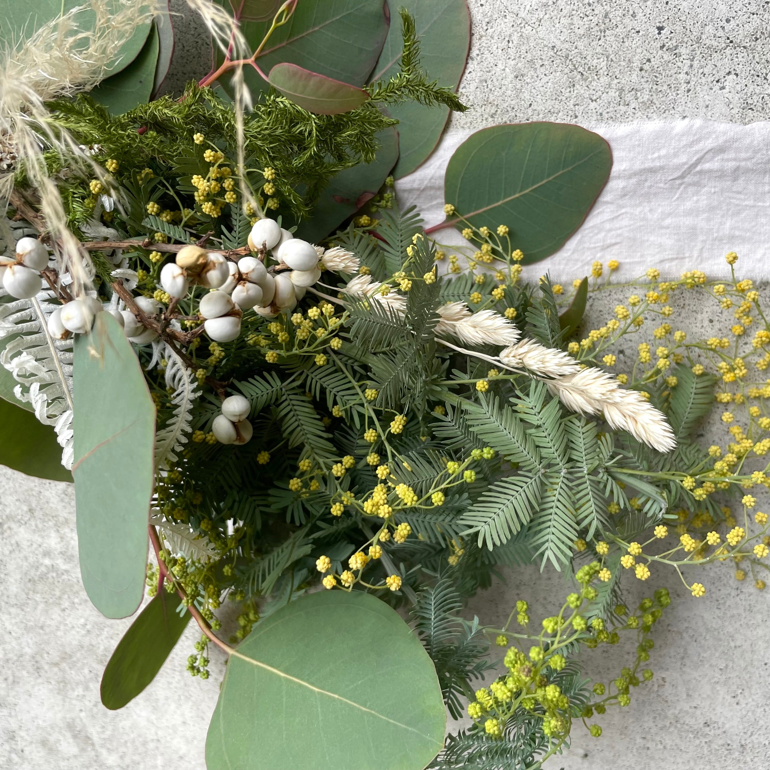 花材:グリーンミモザ・ポポラスユーカリ・パンパスグラス・タタリカ・ヒカケノカズラ・山シダ・ナンキンハゼ・オーチャードグラス