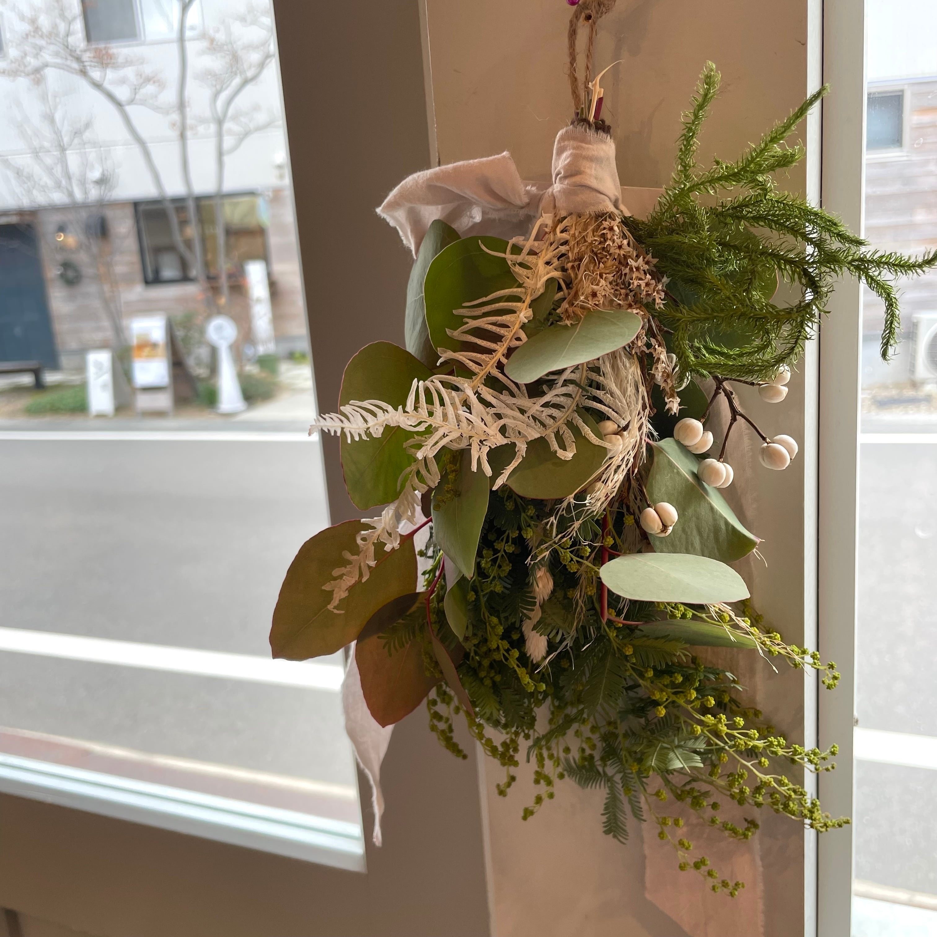 花材:グリーンミモザ・ポポラスユーカリ・パンパスグラス・タタリカ・ヒカケノカズラ・山シダ・ナンキンハゼ・オーチャードグラス