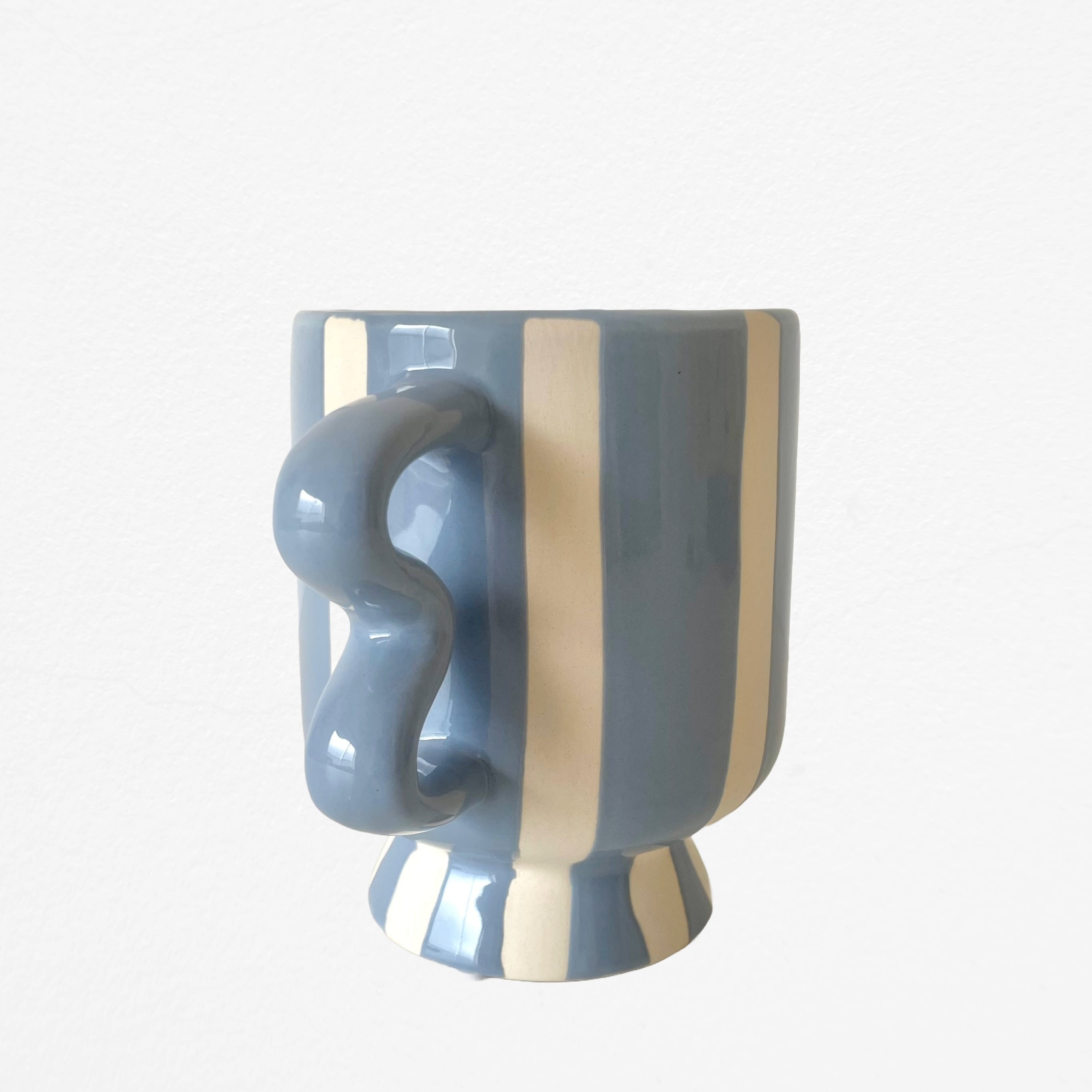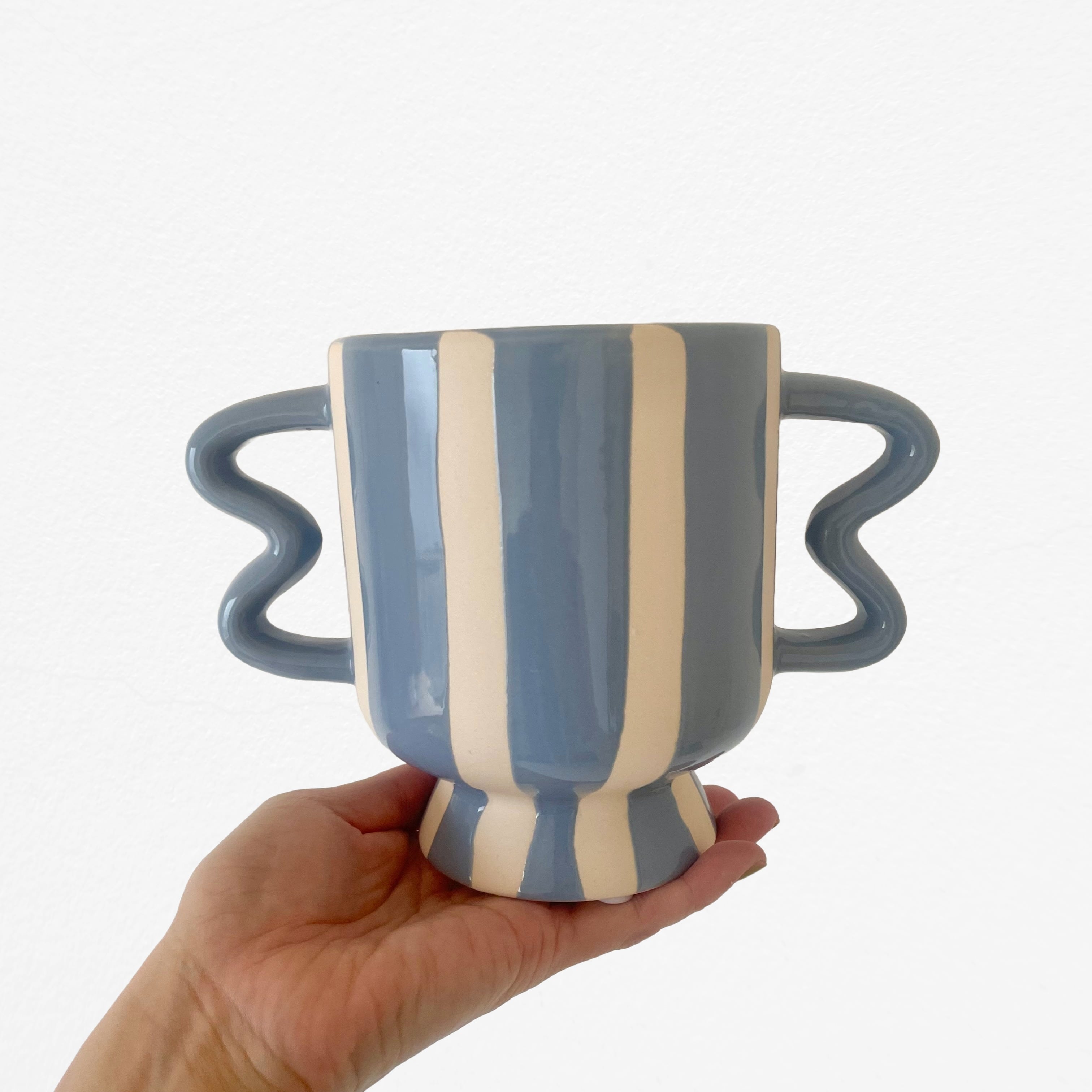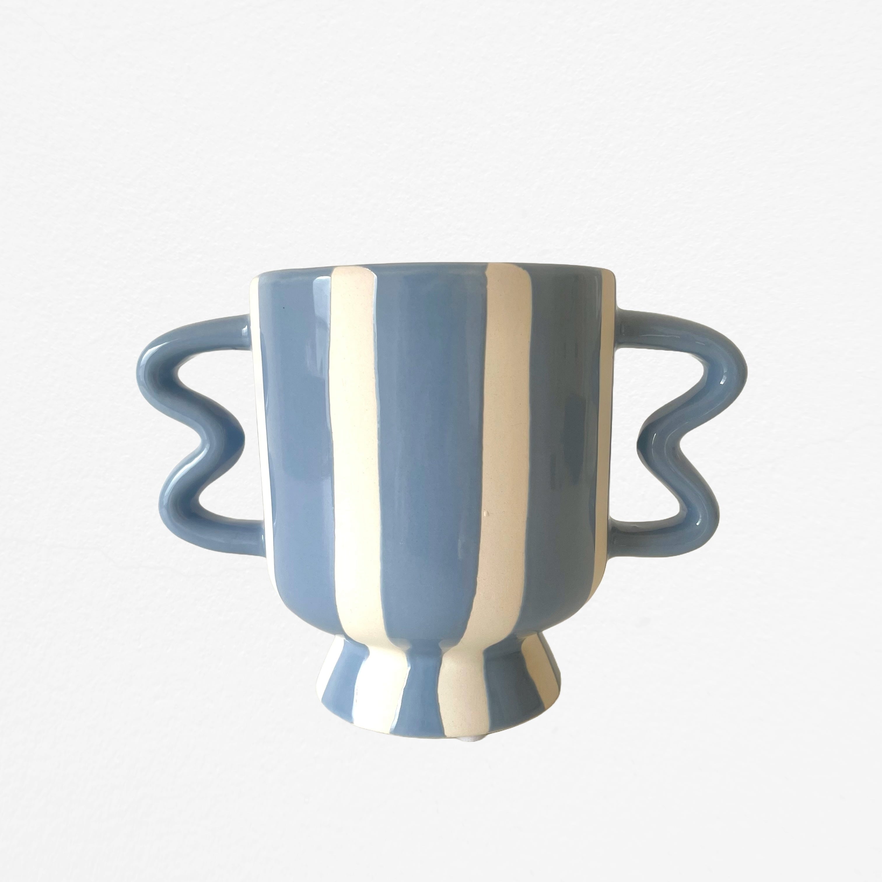 まるでプランターが両手を腰に当ててポーズをとっているような、遊び心あふれるシルエットが魅力の植木鉢カバー、Wavy Stripe Pot。波打つユニークなハンドルと、手描きのような温かみのあるブルーのストライプが、お部屋に爽やかなリズムを運んでくれます。どっしりとした台座付きのデザインは、お気に入りの植物をまるでアート作品のように特別な存在へと引き立ててくれそう!
