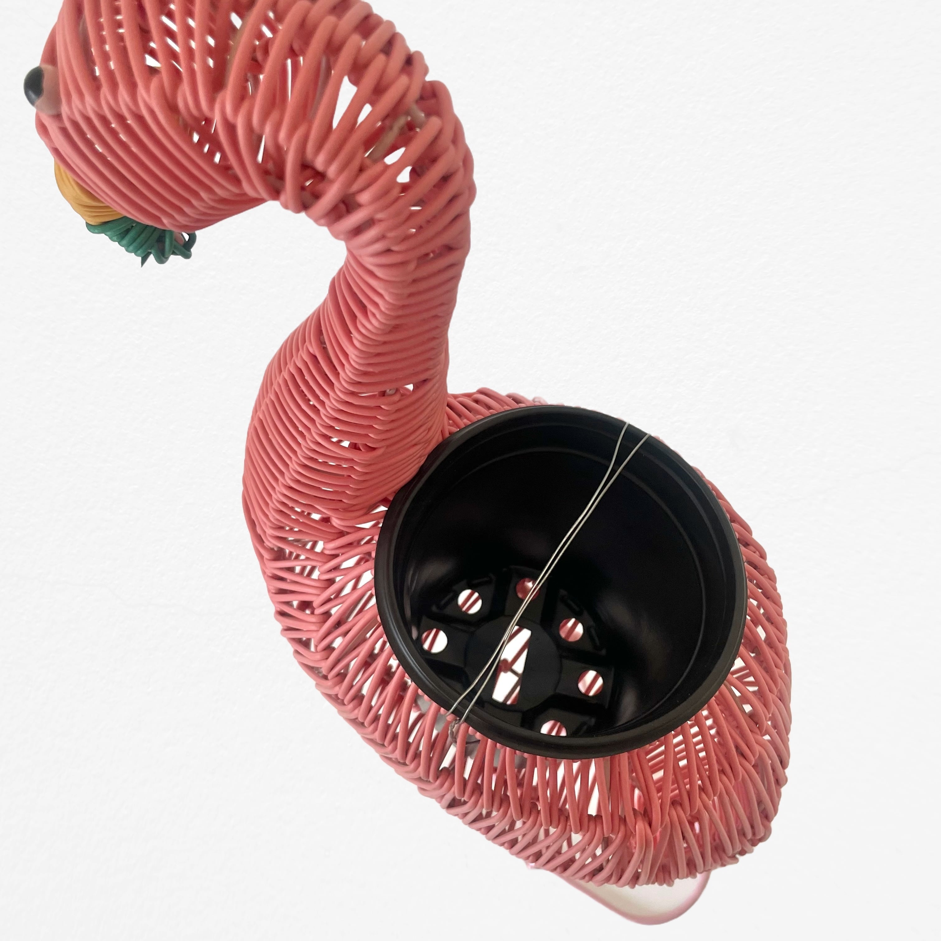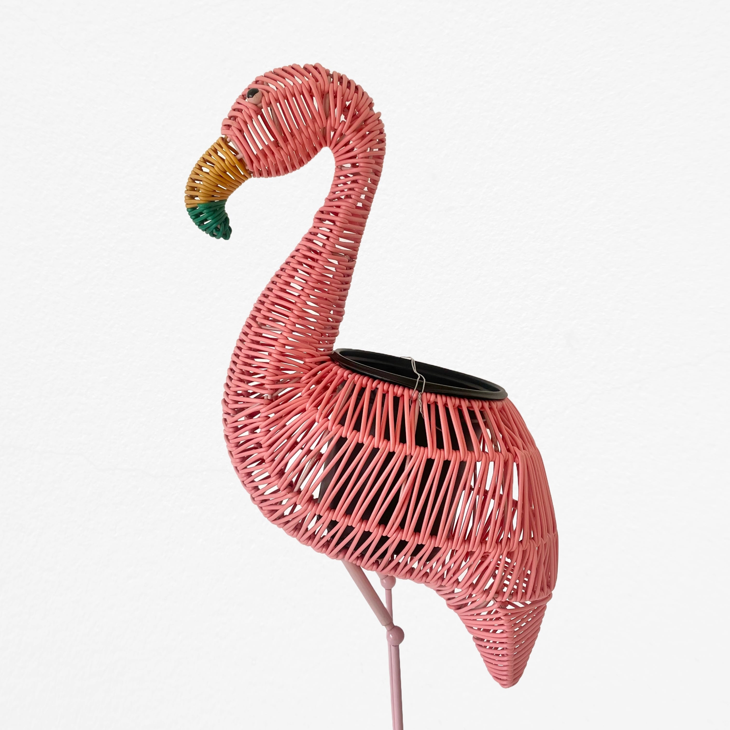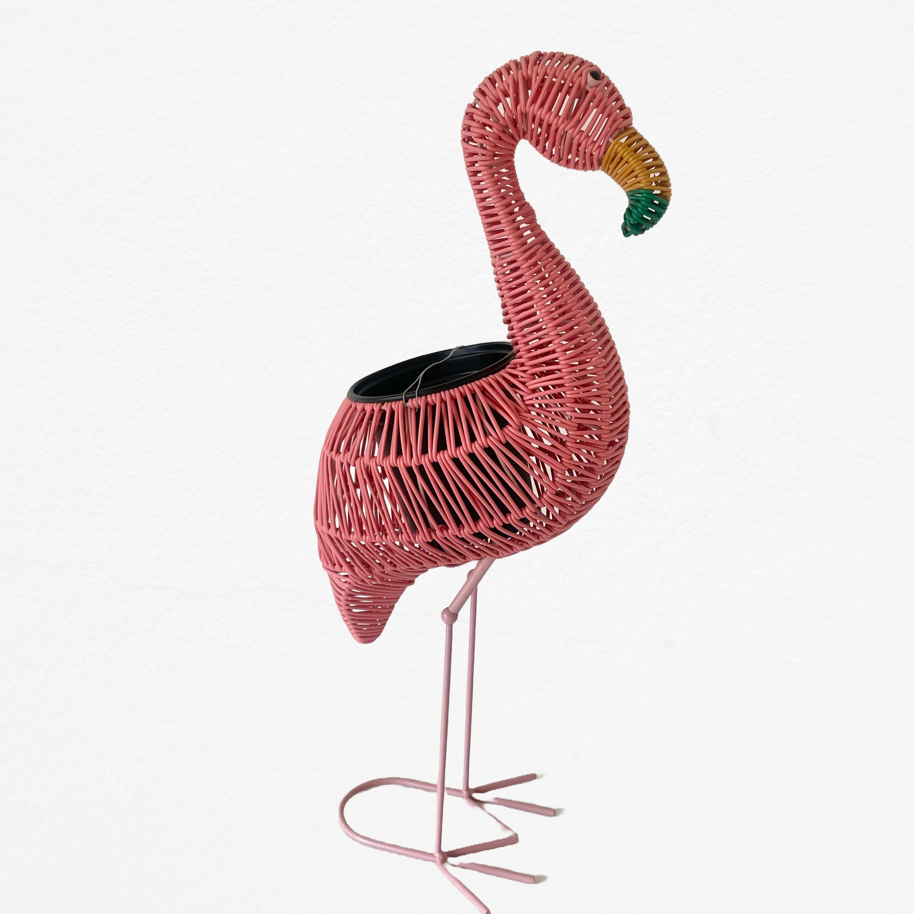 鮮やかなピンクのボディが目を引く、フラミンゴをモチーフにした遊び心たっぷりのプランター、Flamingo Woven Planter。一見するとラタンのようなナチュラルな風合いですが、実は耐久性と軽量性に優れたビニール素材を丁寧に編み込んで作られています。そのためお手入れがしやすく傷みにくいのが嬉しいポイント。高さ55cmと存在感のあるサイズ感は、お部屋のコーナーや玄関先のアイキャッチとして抜群の個性を放ちます。中央には直径11cmの鉢が収まる設計になっており、お気に入りの観葉植物をセットするだけで、まるでフラミンゴの背中から緑が芽吹いたようなファンタジックな空間を演出できます。