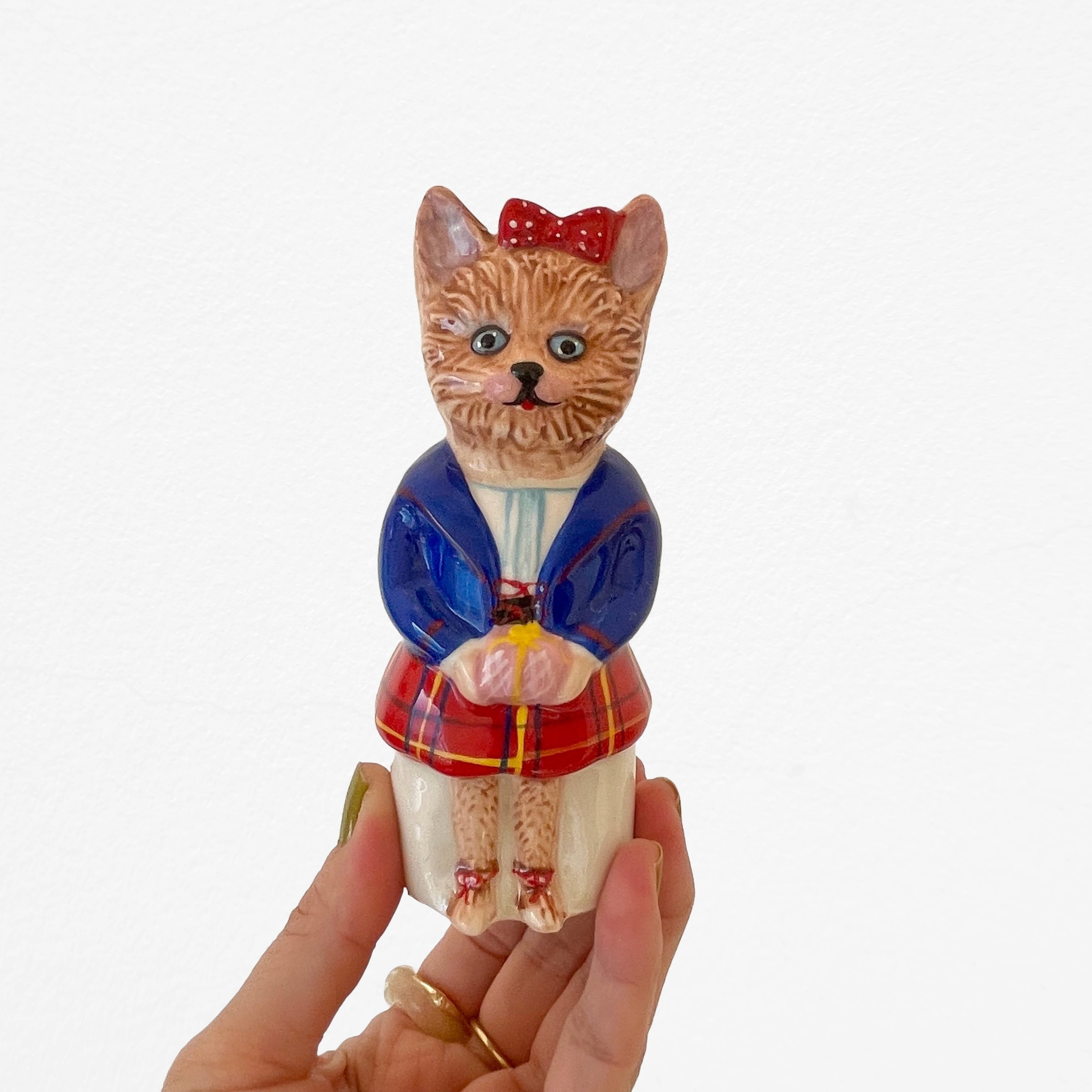 パリを拠点に活躍するアーティスト「Nathalie Lete(ナタリー・レテ)」と、デンマークのインテリアブランド「rice(ライス)」がコラボレーションして生まれた、アーティスティックなセラミックキャンドルホルダー。赤い大きなリボンをつけ、チェックのスカートで上品に装った猫の姿は、まるでフランスの古い絵本から抜け出してきたかのよう。ナタリー・レテらしい色彩の魔法と、どこかミステリアスで愛らしい表情が、艶やかなセラミックで見事に表現されています。