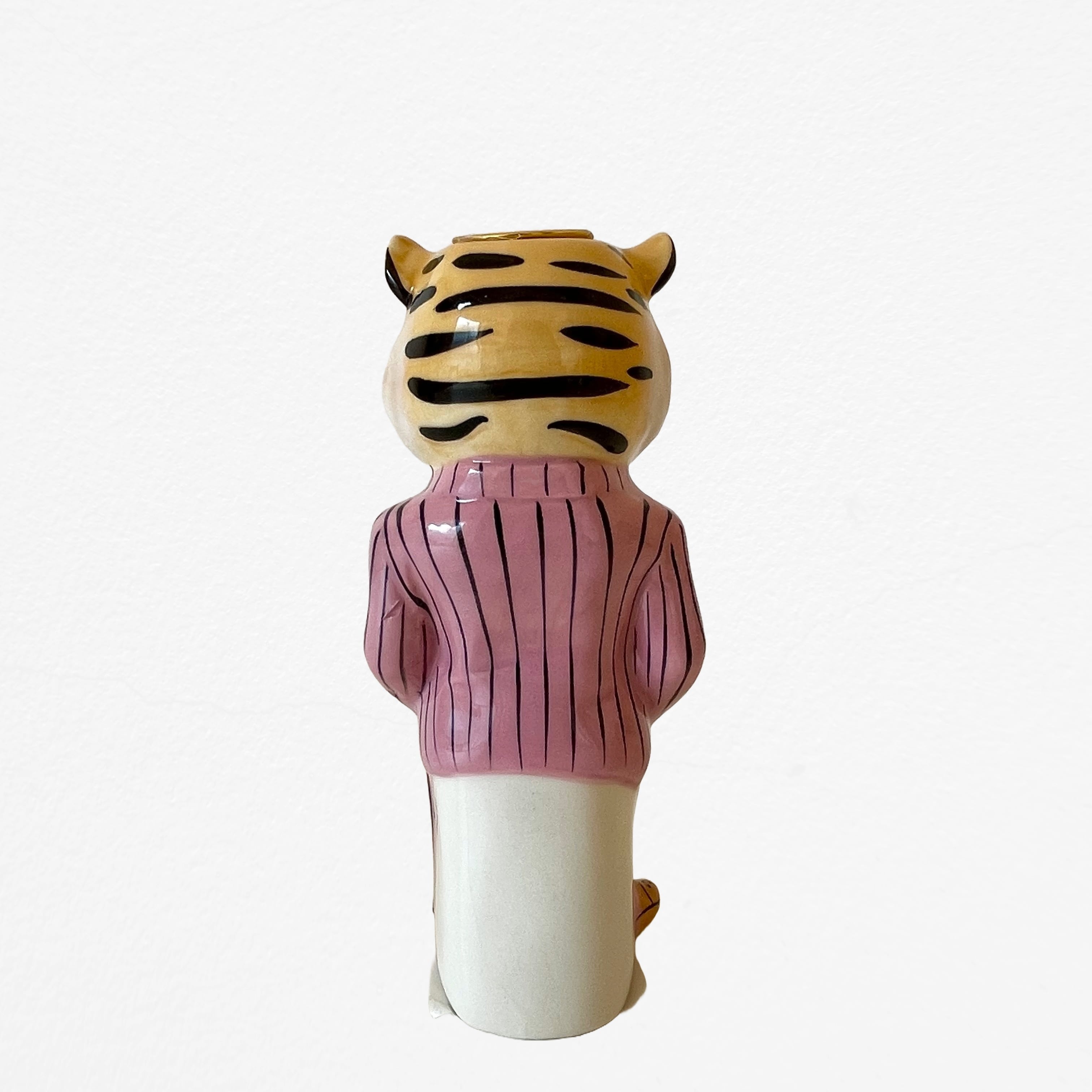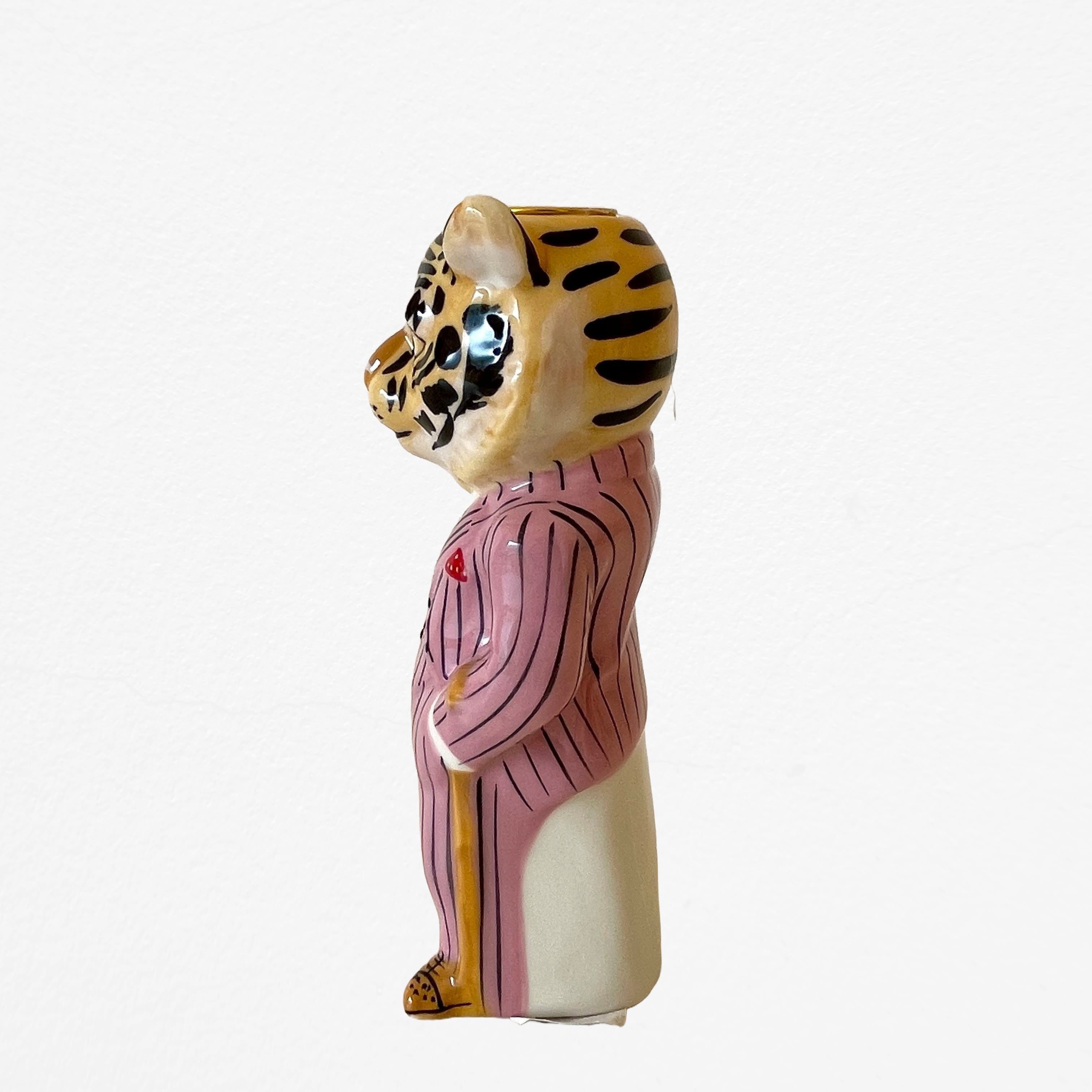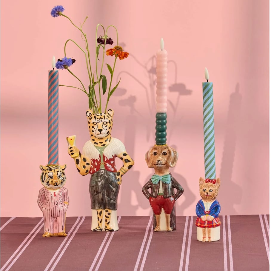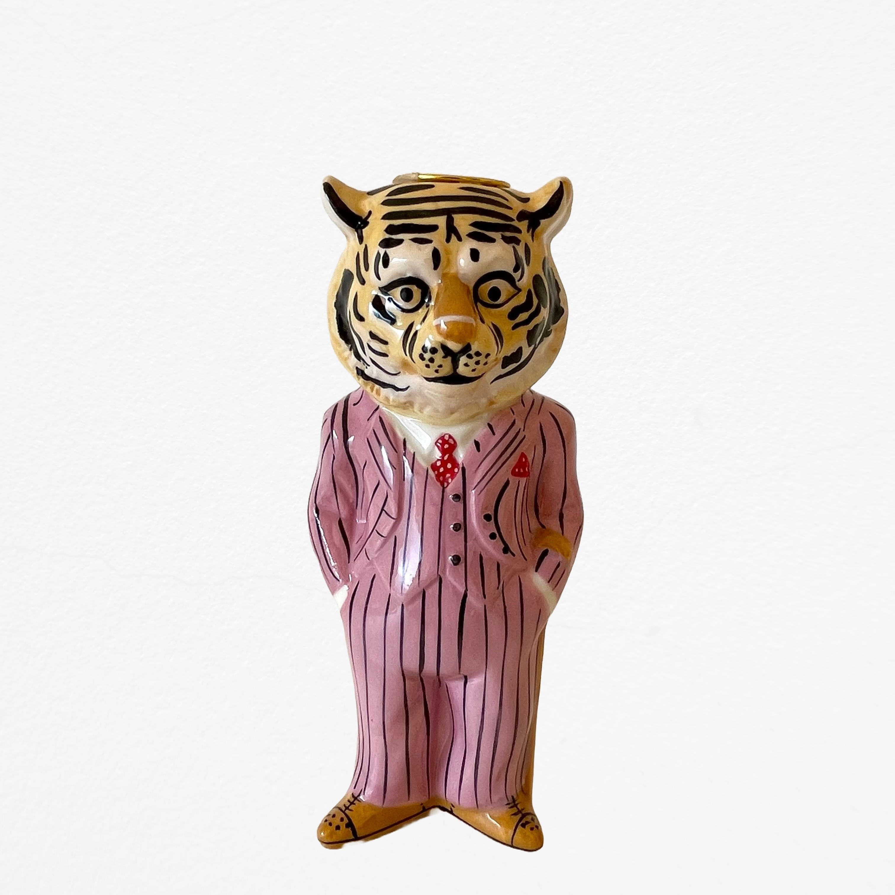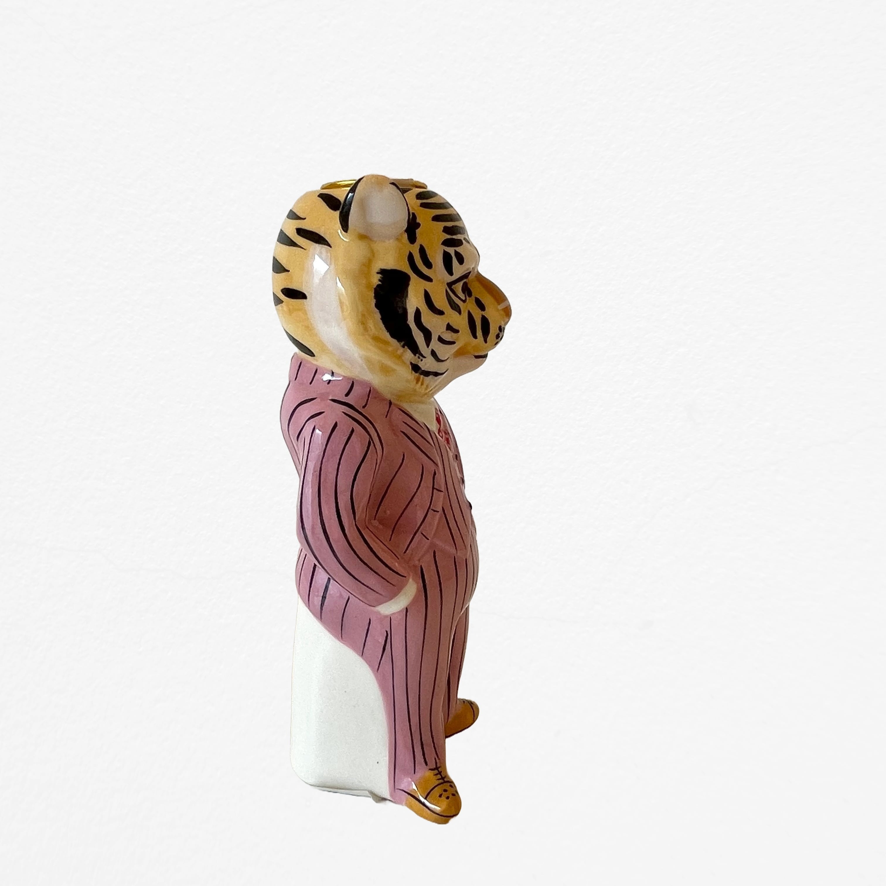 パリを拠点に活躍するアーティスト「Nathalie Lete(ナタリー・レテ)」と、デンマークのインテリアブランド「rice(ライス)」がコラボレーションして生まれた、アーティスティックなセラミックキャンドルホルダー。ピンクのストライプスーツに赤いネクタイを合わせた、まるでお洒落な紳士のような佇まいのタイガー。ナタリー・レテらしい、どこかユーモラスで鋭い感性が光る表情が、艶やかなセラミックの質感で見事に表現されています。