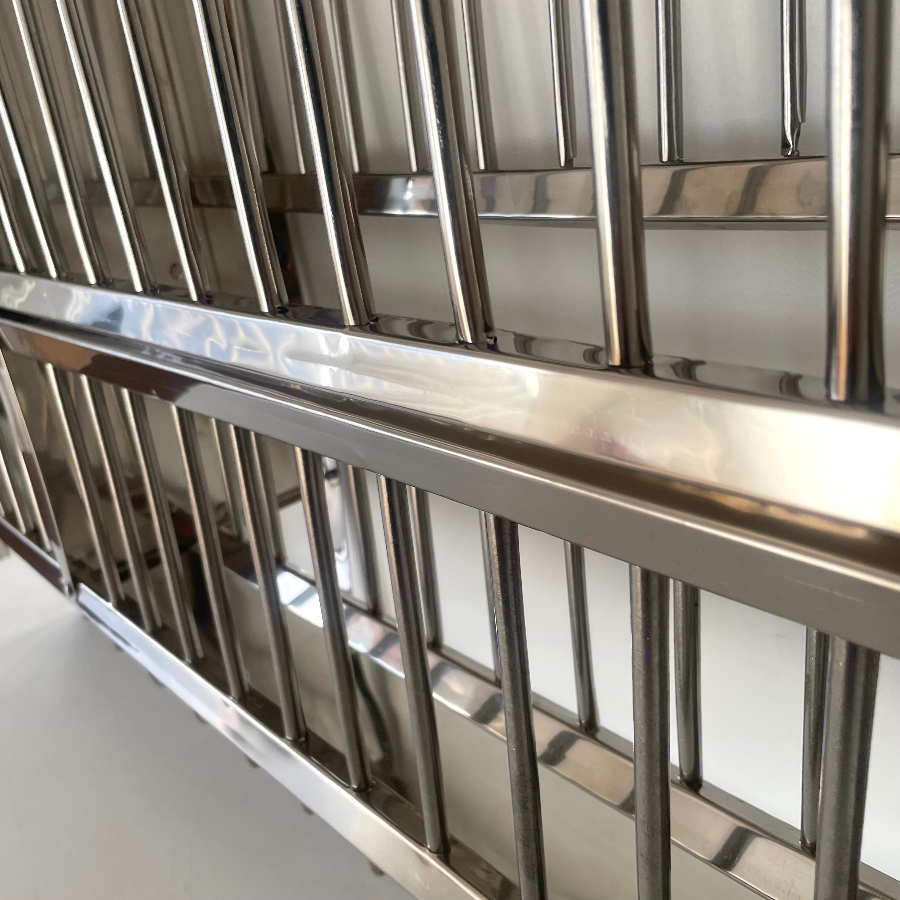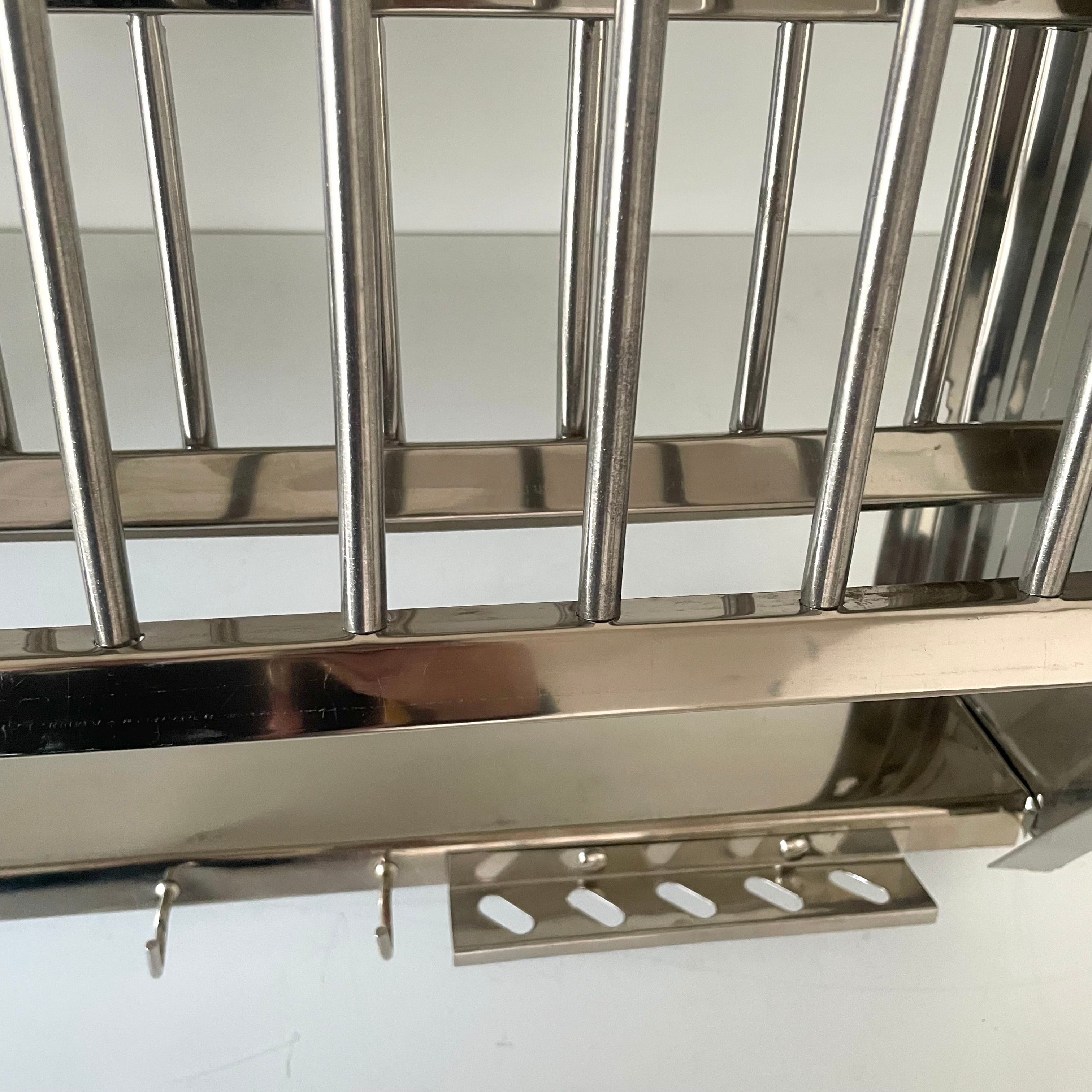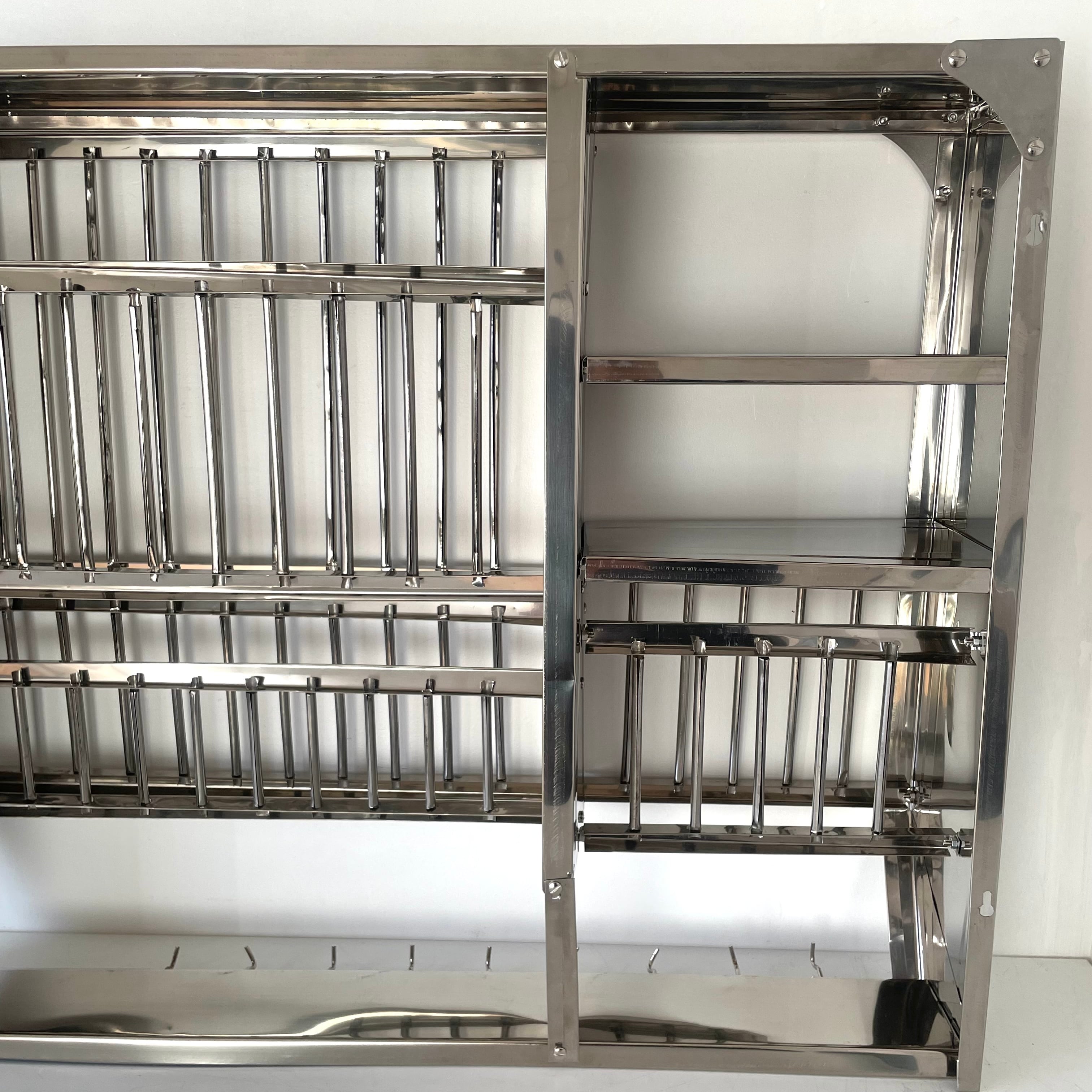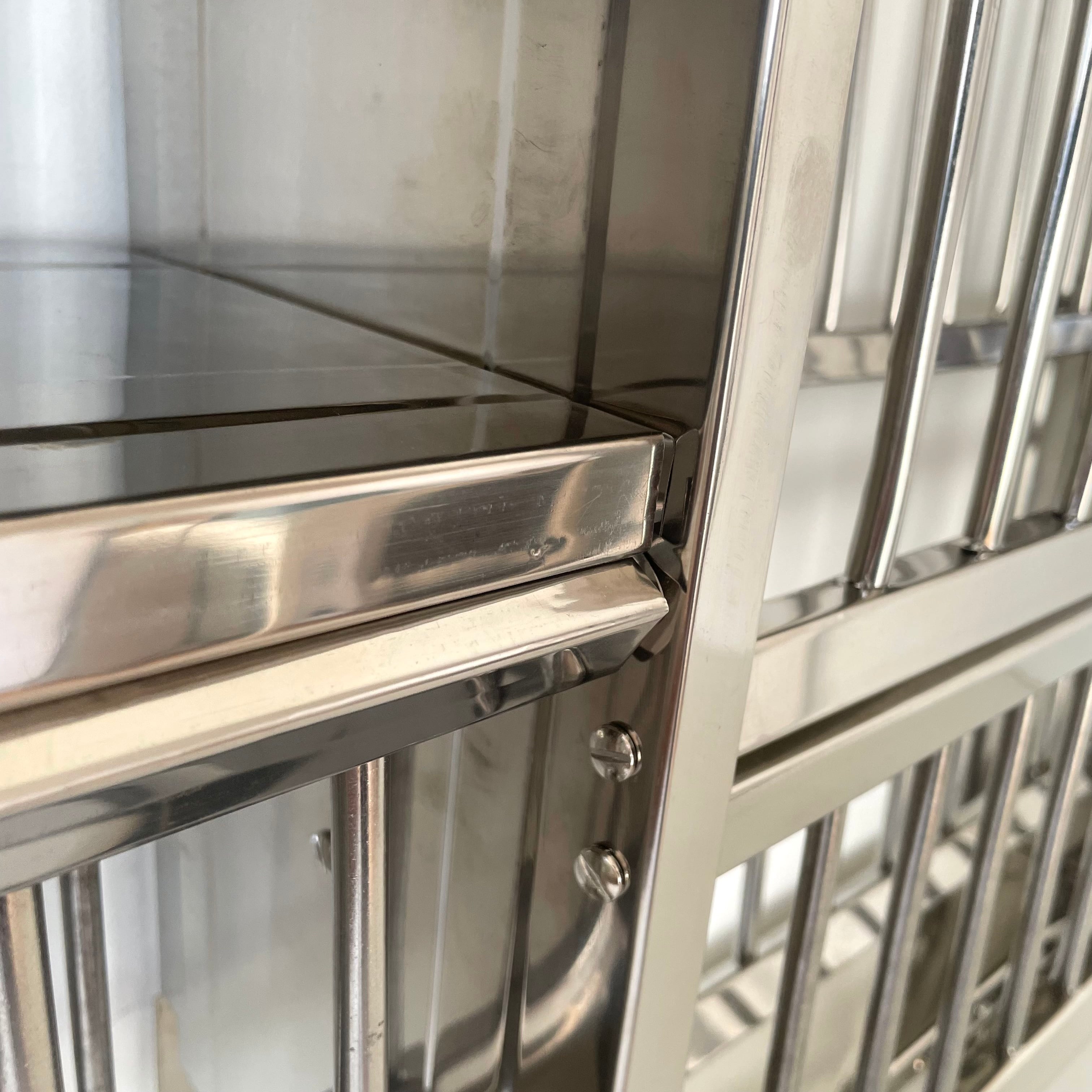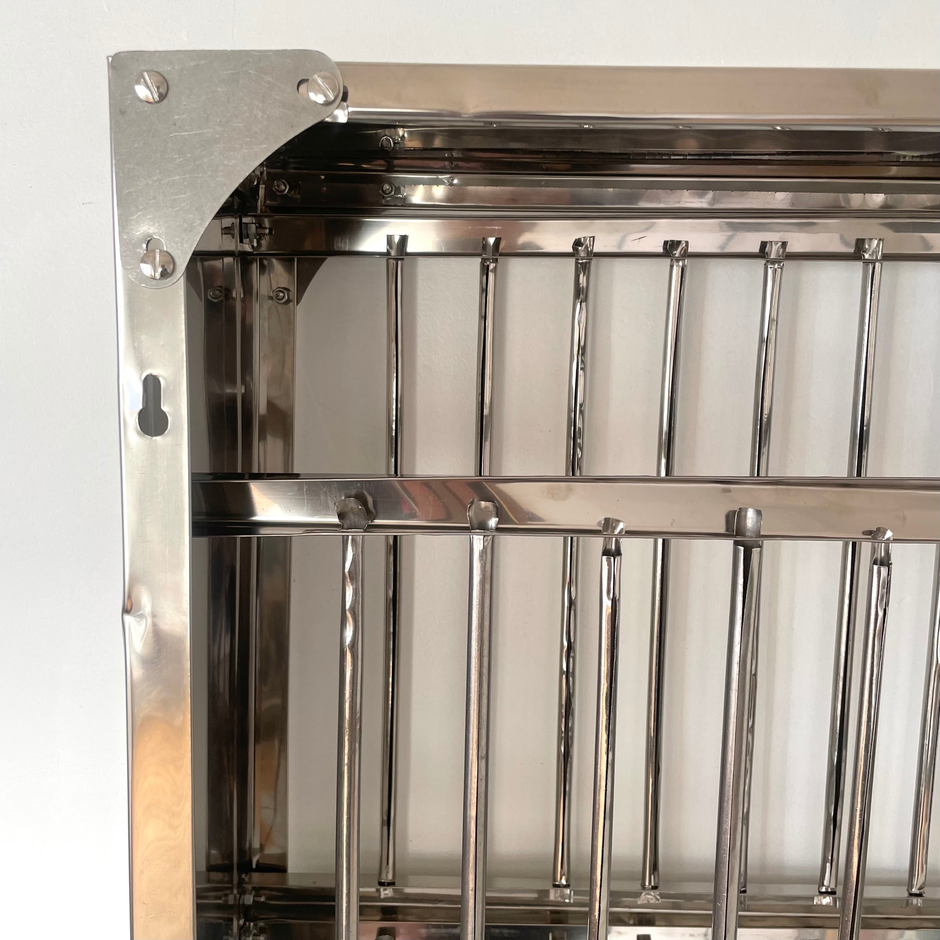 ステンレスの板は薄くベコンとたわむ箇所があったり、棚の端の処理が少し斜めになっていたりと、全体的にどこか不完全で、歪みや部分的な変色、穴あけのバリが残っていることも珍しくありません。しかし、その「精度の甘さ」こそが、大量生産品にはない独特のレトロ感とアンティークのような深い味わいを生み出しています。