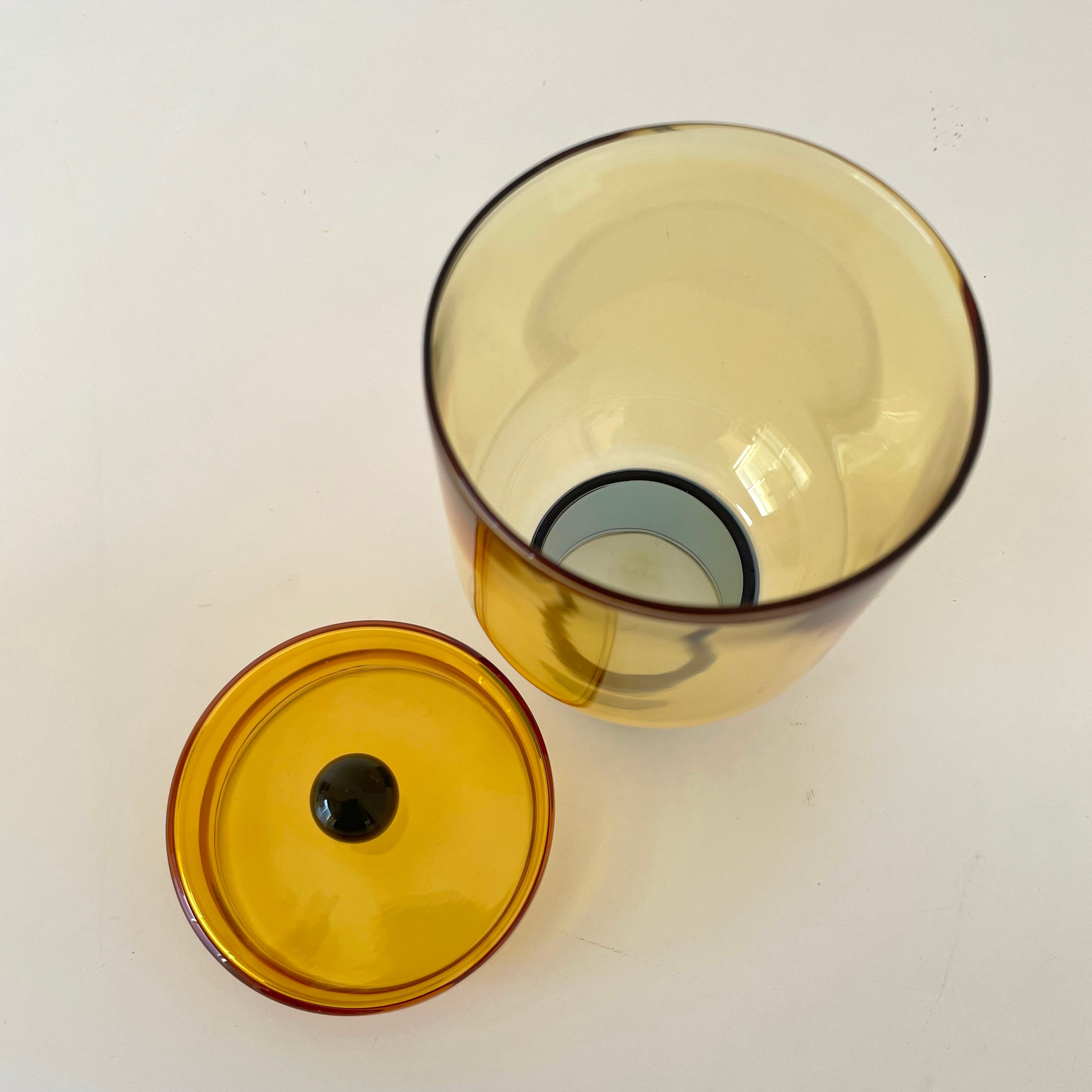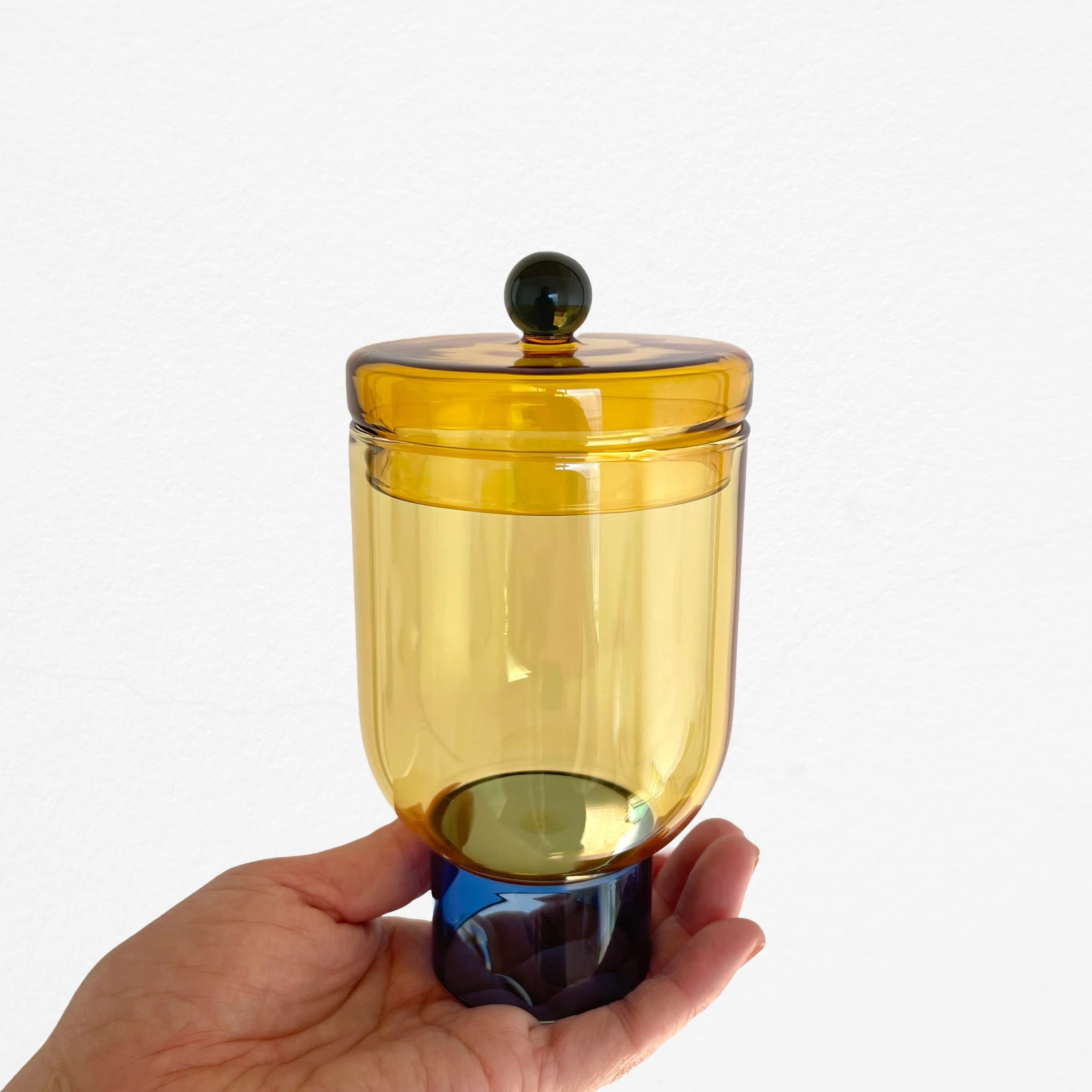 光を透かして映し出される、色の重なりが美しいガラスのキャニスター。どこか懐かしさを感じるアンバーのボディ、そして全体をキリリと引き締める足元のブルー。2つの色彩が、窓辺の光や照明を受けてお部屋の中に美しい影を落とします。