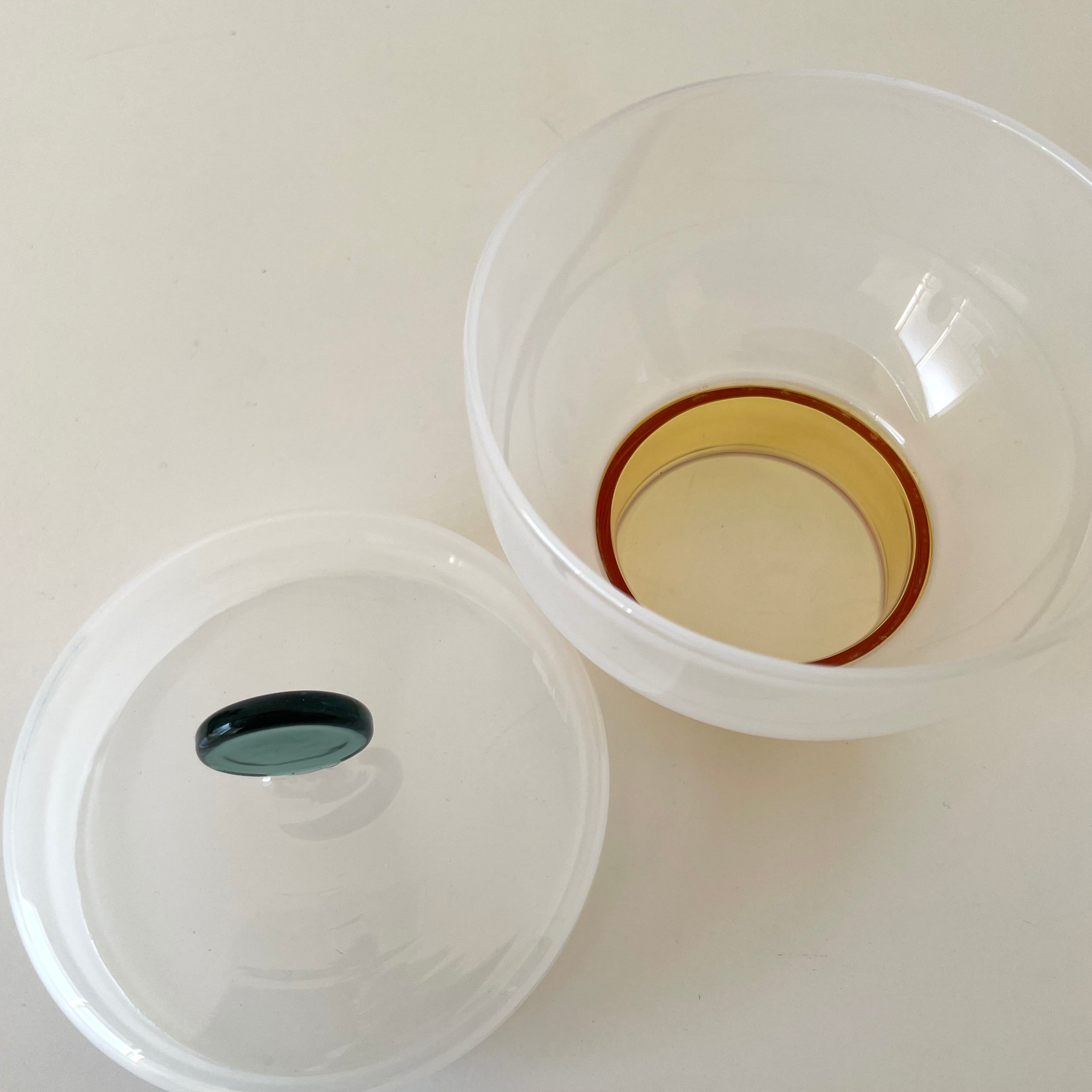 ミルクを溶かしたような、淡く優しい乳白色の質感が魅力的なガラスキャニスター。マットで柔らかなボディに、光を透かす蜂蜜色の脚元と、まるでおはじきのような深いグリーンの持ち手。対照的な色彩が組み合わさることで、どこかモダンでアート作品のような佇まいに仕上がりました。