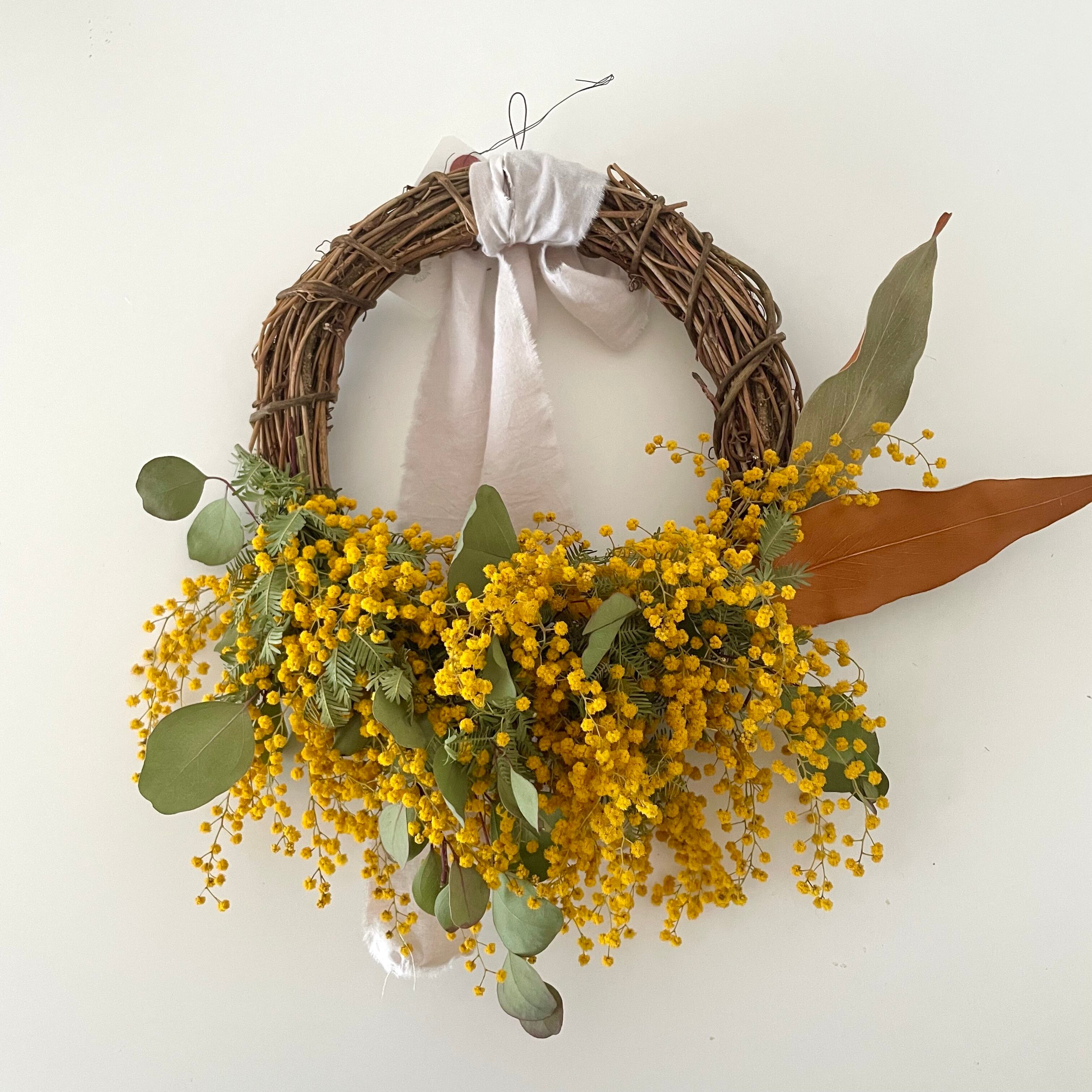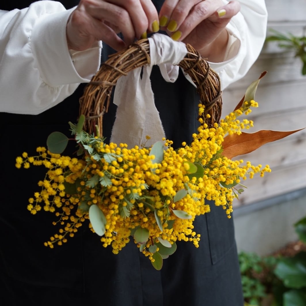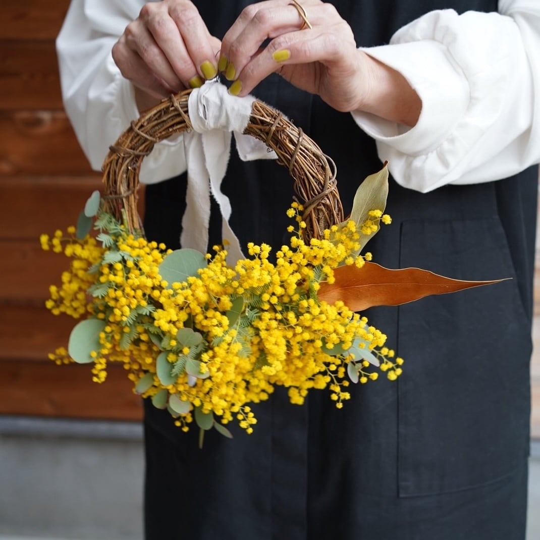 主役となるふわふわのミモザに、静かなユーカリを重ねることで、黄色がよりいっそう引き立ち、お部屋にぱっと明るい灯がともるような存在感を放ちます。あえてリース台の自然な枝ぶりをのぞかせるデザインは、植物のありのままの逞しさと繊細さを大切にするhibaさんならではの感性。ラフに結ばれたリネンリボンが、大人の日常に馴染むシックな遊び心を添えています。