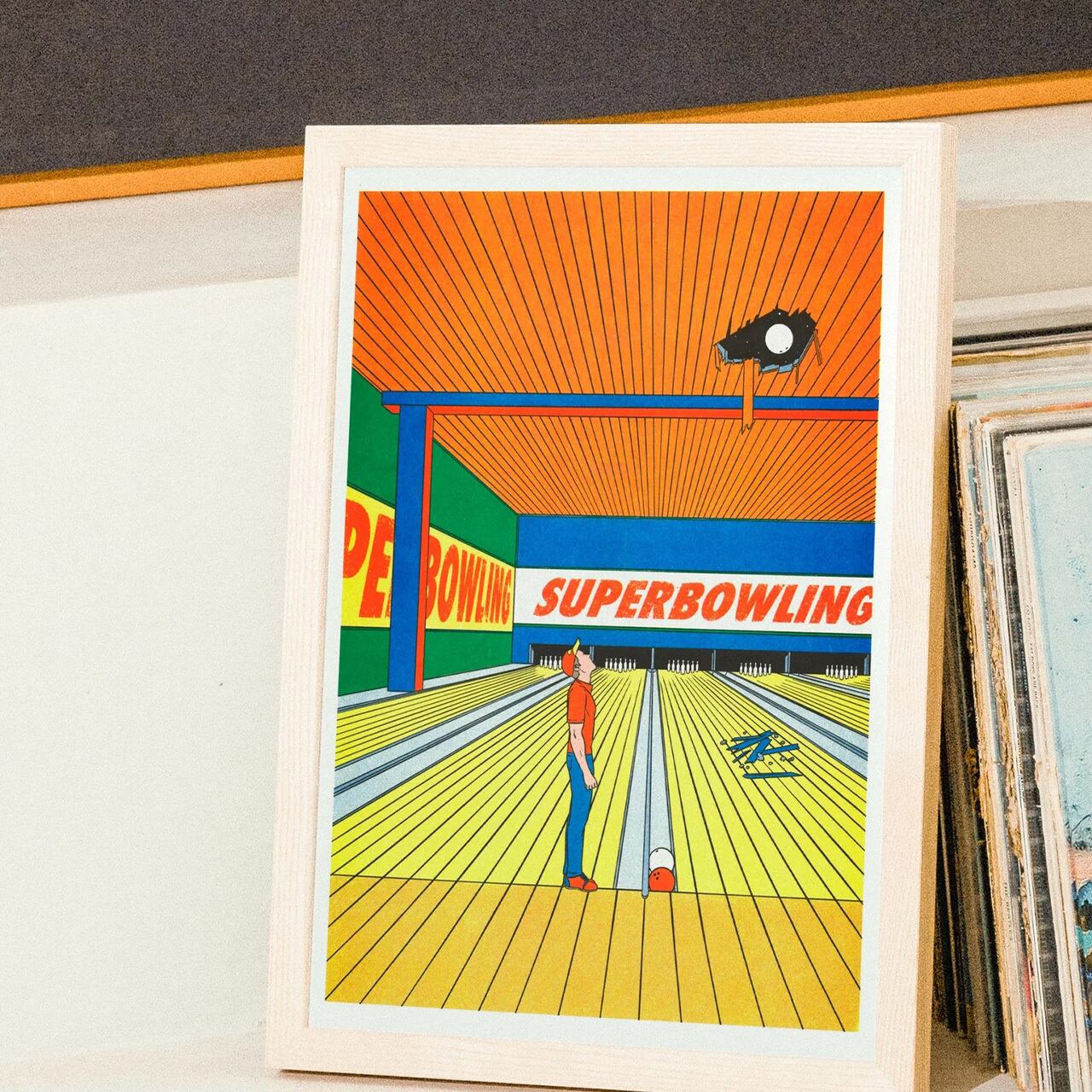 フランス・リヨン発KIBLIND Atelierから、フランスとベルギーのコミック文化、そして映画ポスターの黄金時代を彷彿とさせるアーティスト、Simon Bailly(シモン・バイイ)による「Super bowling」。ボウリング場の一瞬を切り取ったこの作品は、彼が得意とする「クリア・ライン(明快な線描)」と、緻密に計算された構図が光る一枚です。
