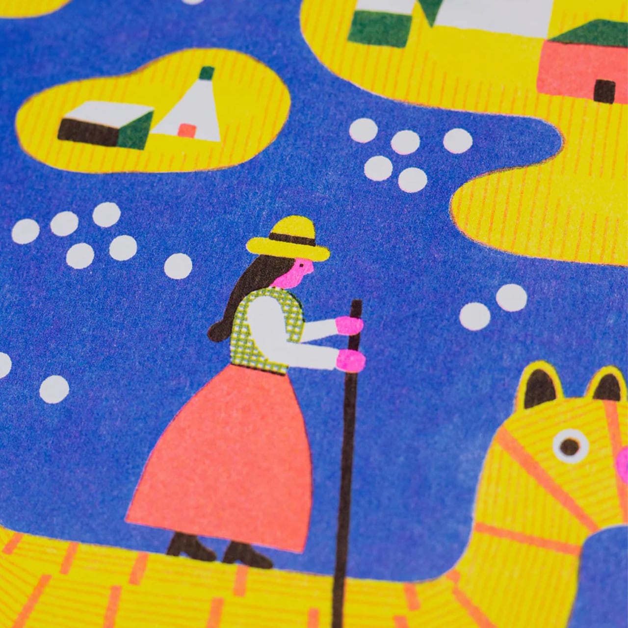 フランス・リヨン発KIBLIND Atelierから、Carole Barraud(キャロル・バロー)による「Nowhere in Peru」。「NOWHERE」は、IFフェスティバルで発表された同名の展覧会のために制作された、個性豊かな10枚のポスターコレクションです。ゲーム「Geoguessr」のコンセプトにインスピレーションを受け、世界中から10名のイラストレーターが、世界の10の地域を独自のスタイルで描きました。