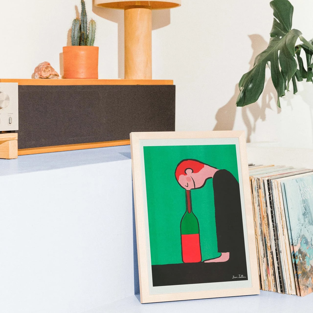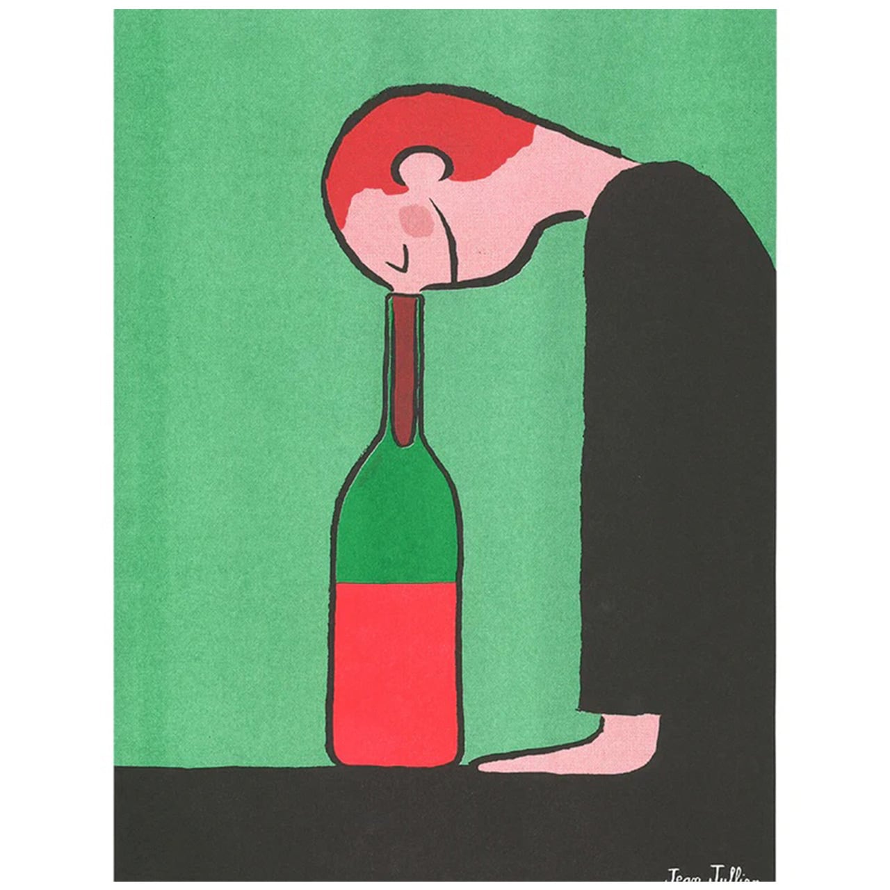 本作品は、ワインをテーマに描かれた全8種のポスターコレクションの一枚です。ジャン・ジュリアンらしい、一目でそれと分かる大胆で迷いのないラインと、日常をシニカルかつ温かく切り取る鋭い観察眼が光ります。「ワインボトル」というシンプルなモチーフに、彼独自のアイロニーと遊び心が吹き込まれたこの作品は、キッチンやダイニングに飾るだけで、空間に心地よいリズムと笑顔をもたらしてくれます。