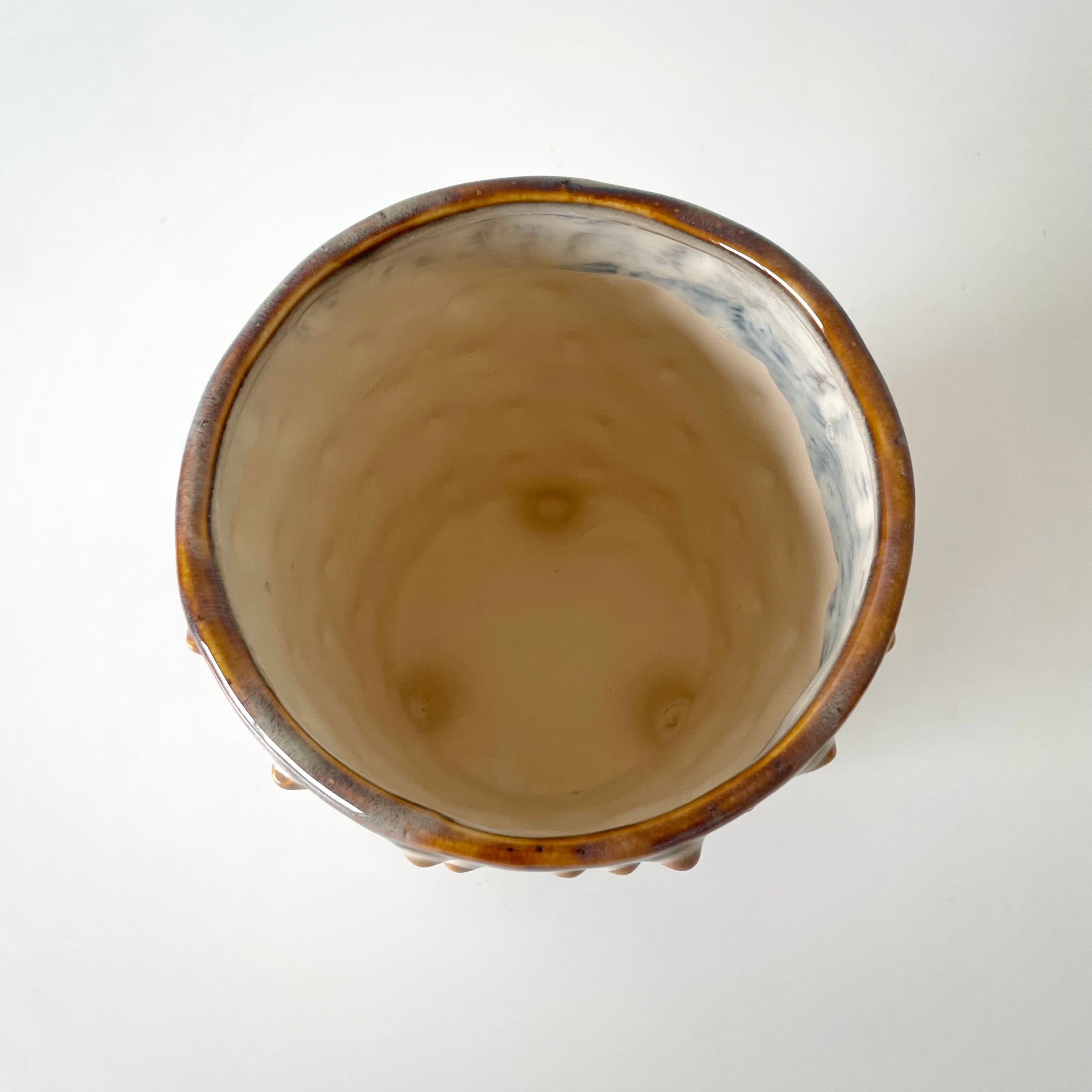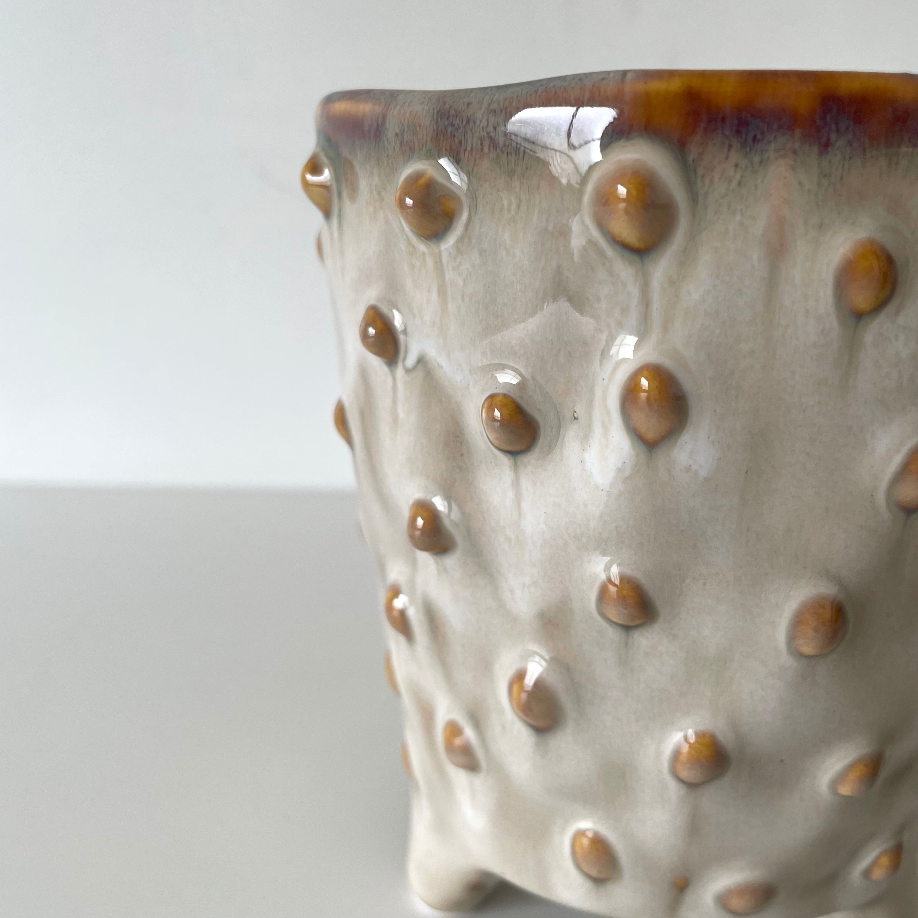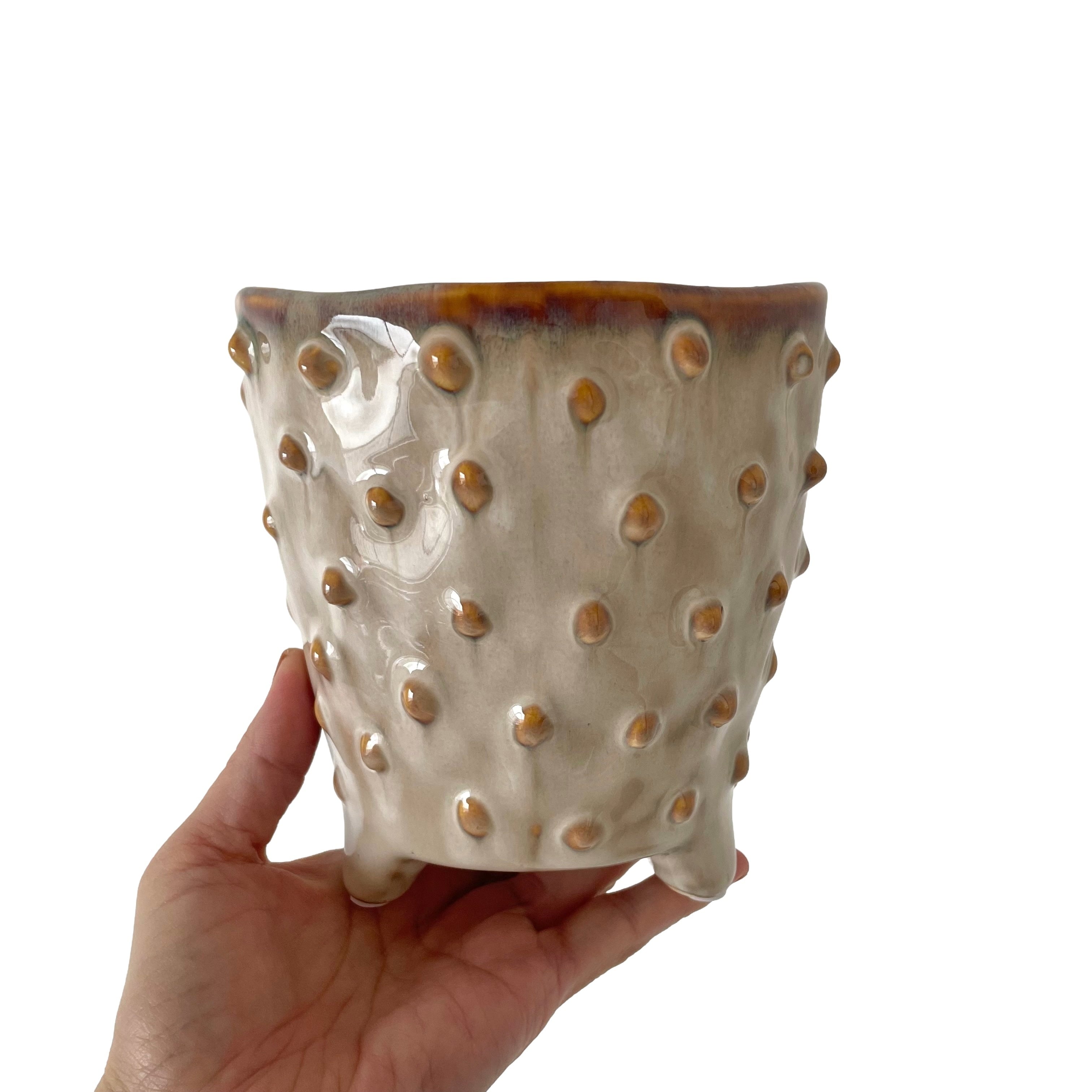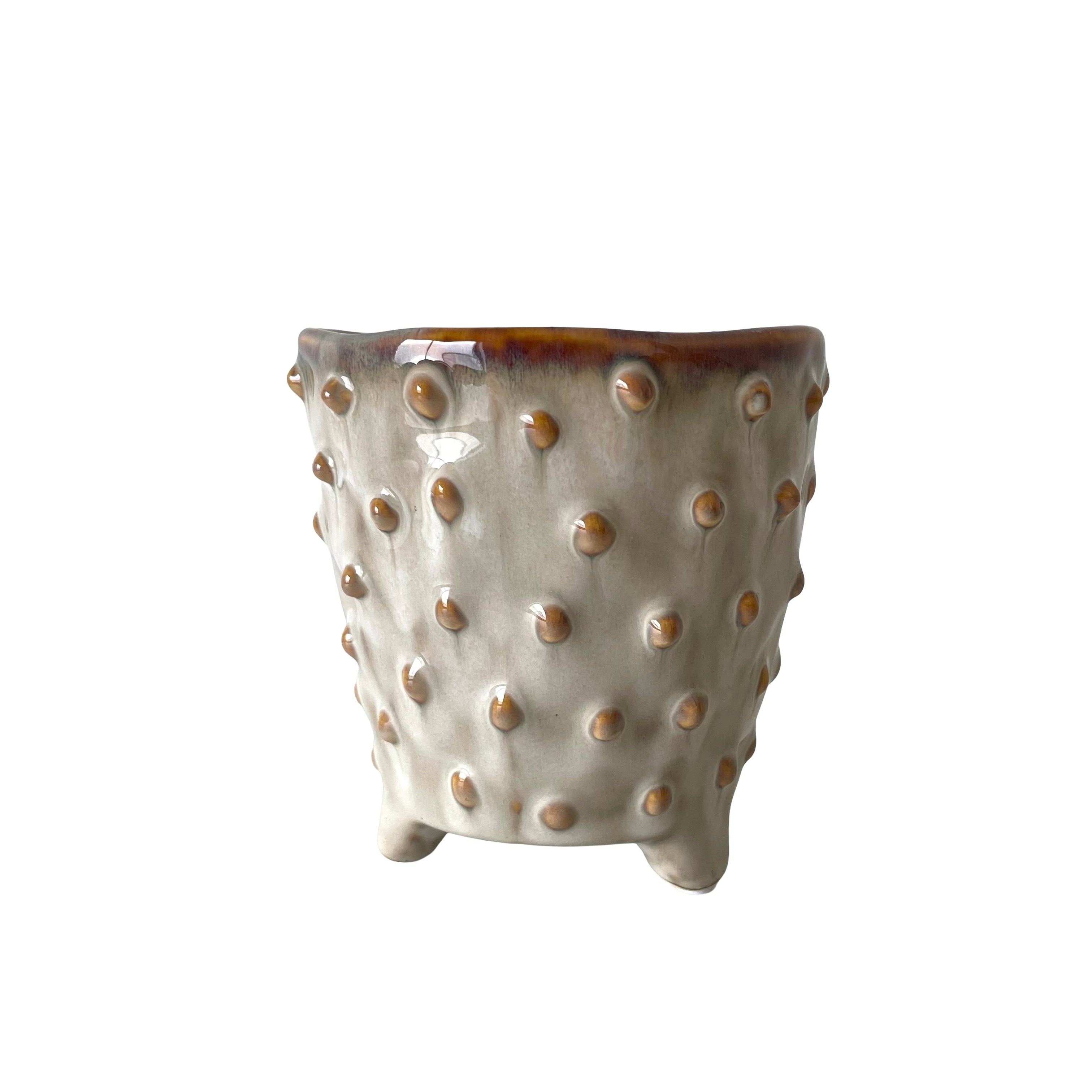 ニュアンスのあるグレーベージュの釉薬に、ぽつぽつとリズミカルに並んだドット模様が愛らしい陶器製の鉢カバー。艶やかな釉薬の質感と、スタッズのような立体的なドット、そしてちょこんとした3本の脚付きのデザインが、お部屋に遊び心とレトロな可愛らしさをプラスしてくれます。Φ14cm×h14.5cm (口径約12cm×h約12cm)で、3号〜4号程度のプラスチック鉢がすっぽりと収まるサイズ感。底穴がないため、水漏れを気にせずリビングの棚やデスクの上など、お気に入りの場所に気軽にグリーンを飾っていただけます。