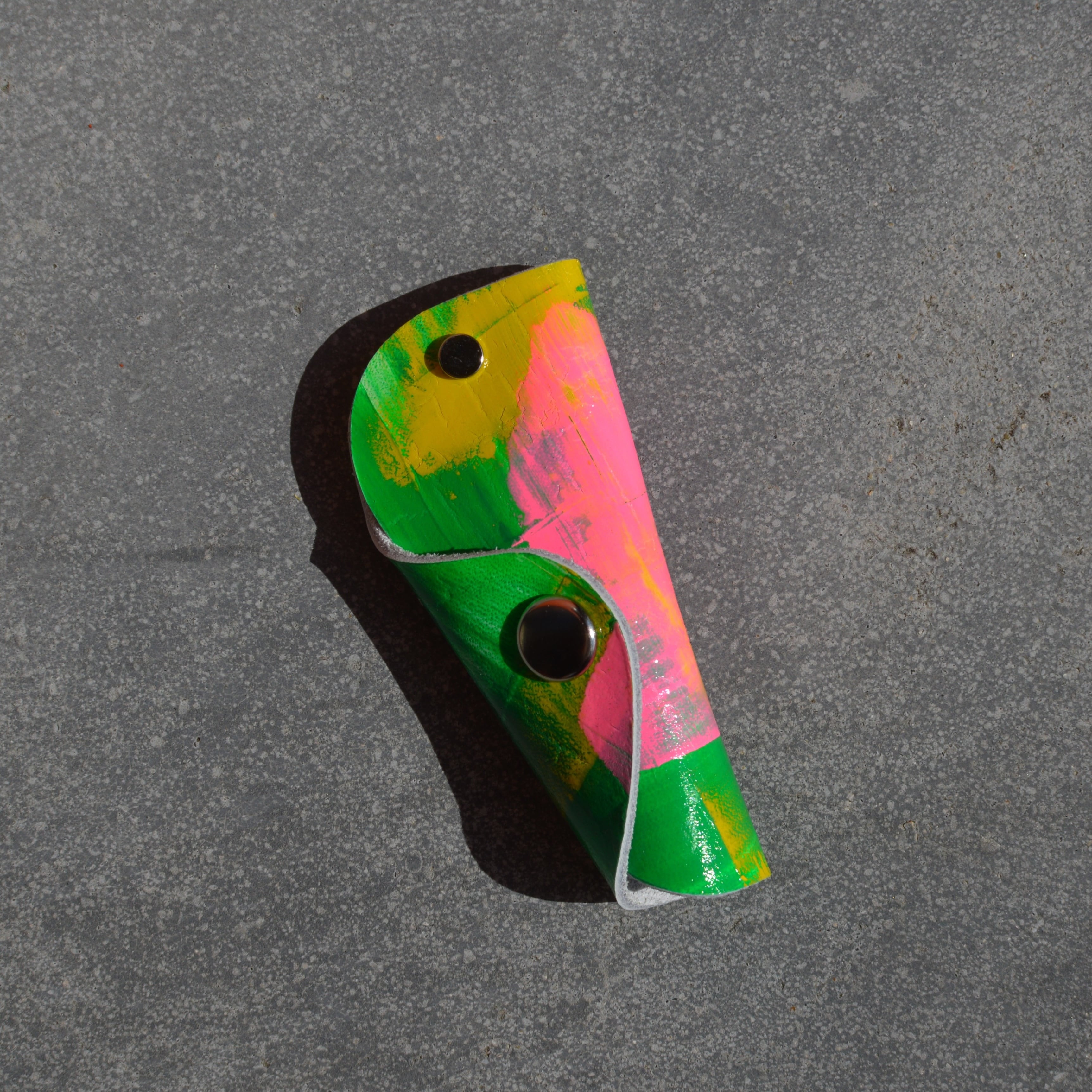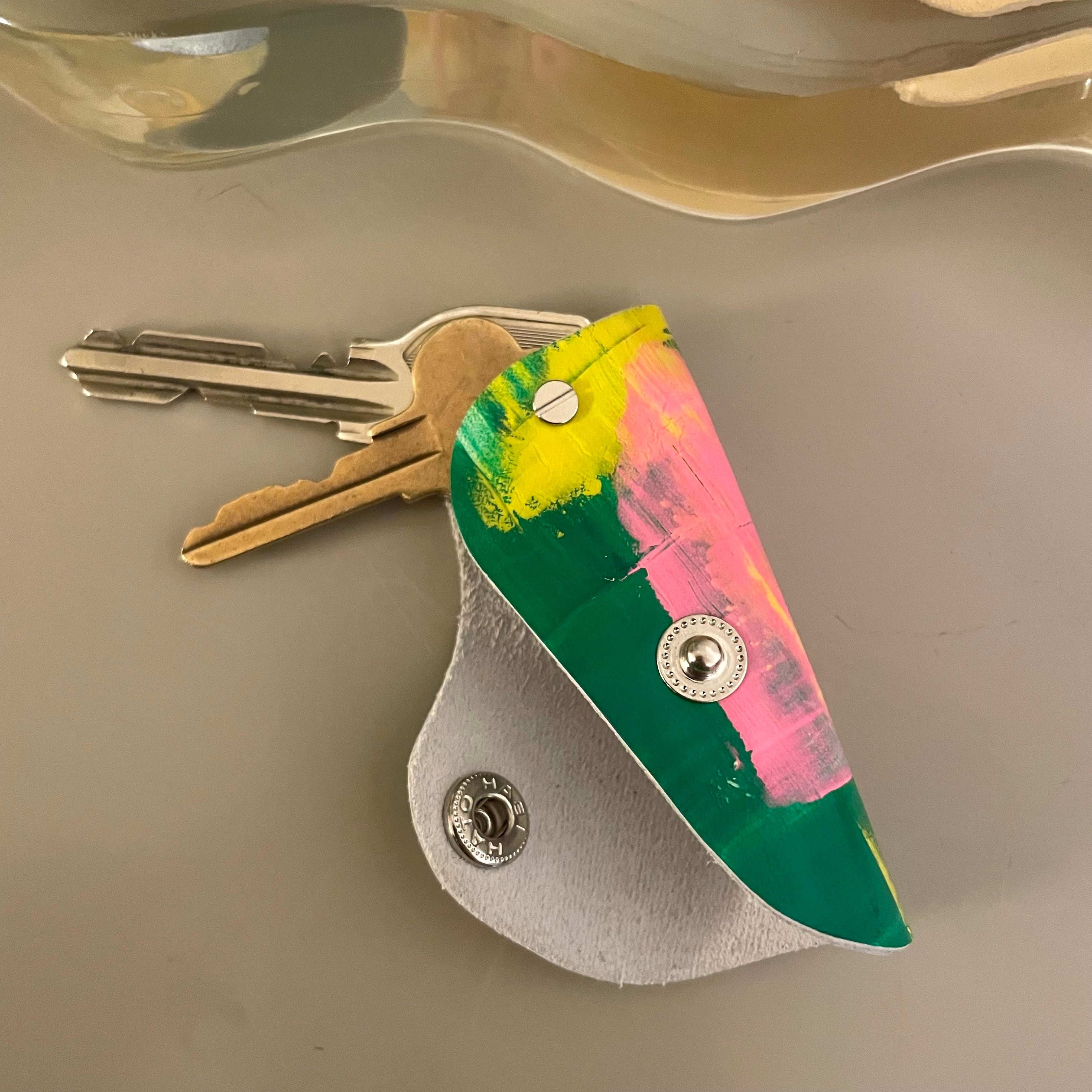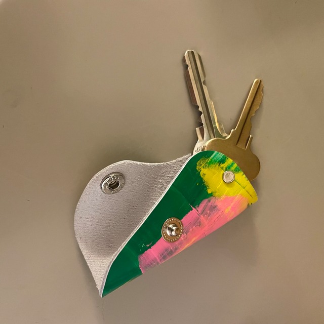 AMEERIEGA TORIBITATTから、ミニマルな美しさと道具を操る楽しさを同時に体感できるキーケース。目を引くのは、ブランドのアイデンティティであるヤドクガエルを彷彿とさせる鮮烈なカラーリング。柔らかな牛革をキャンバスに、職人の手仕事で施されたペイントが、日常の何気ない動作にアートの彩りを添えてくれます。