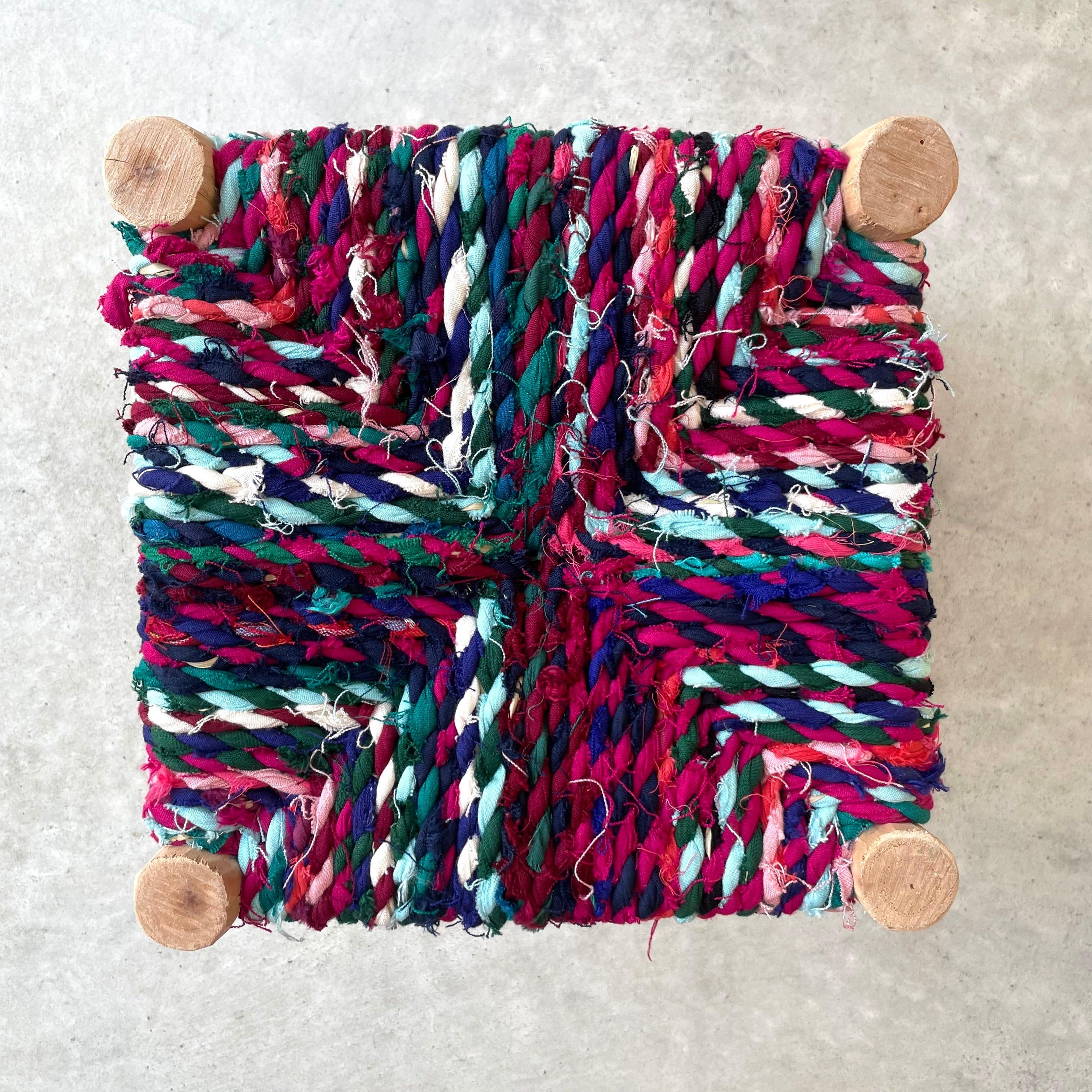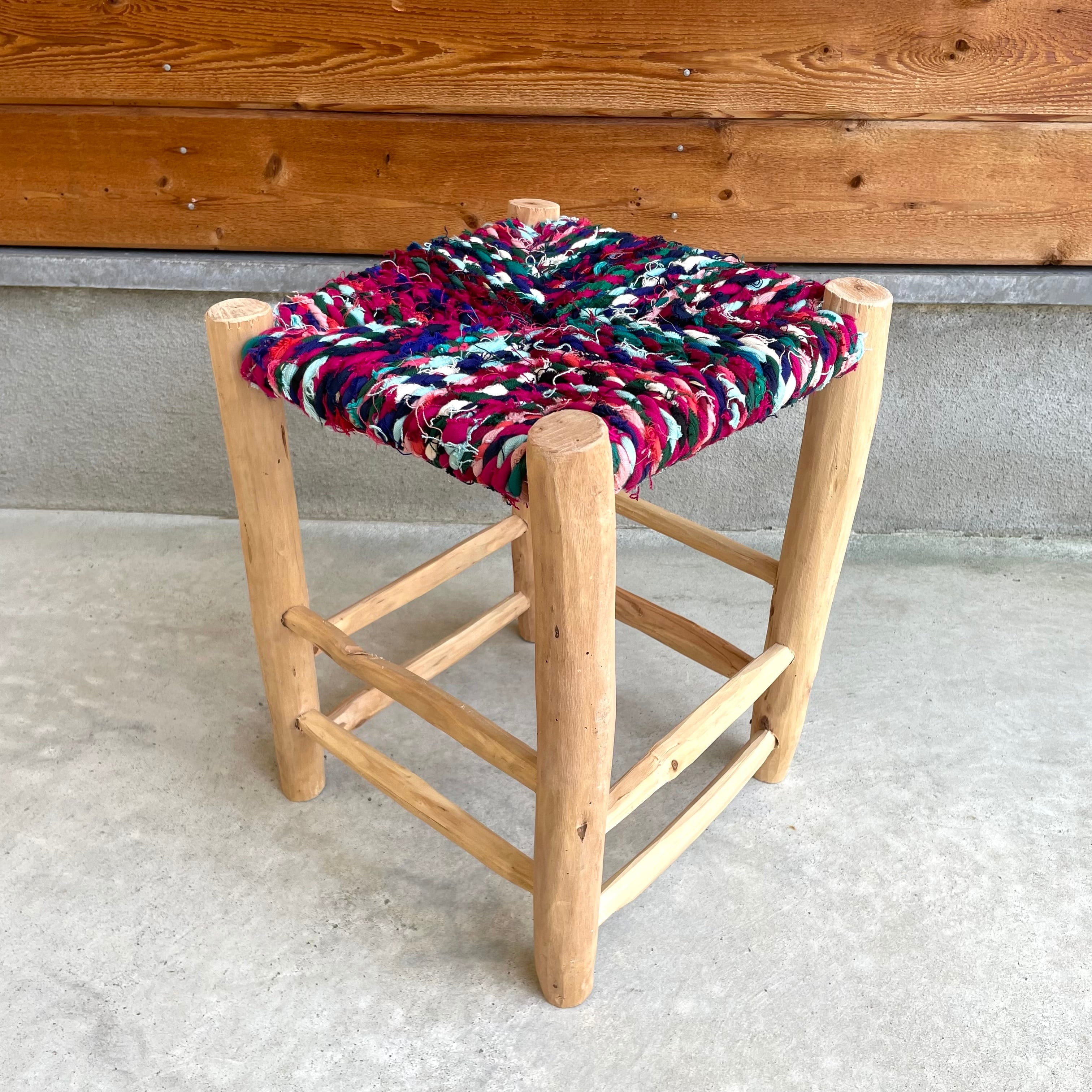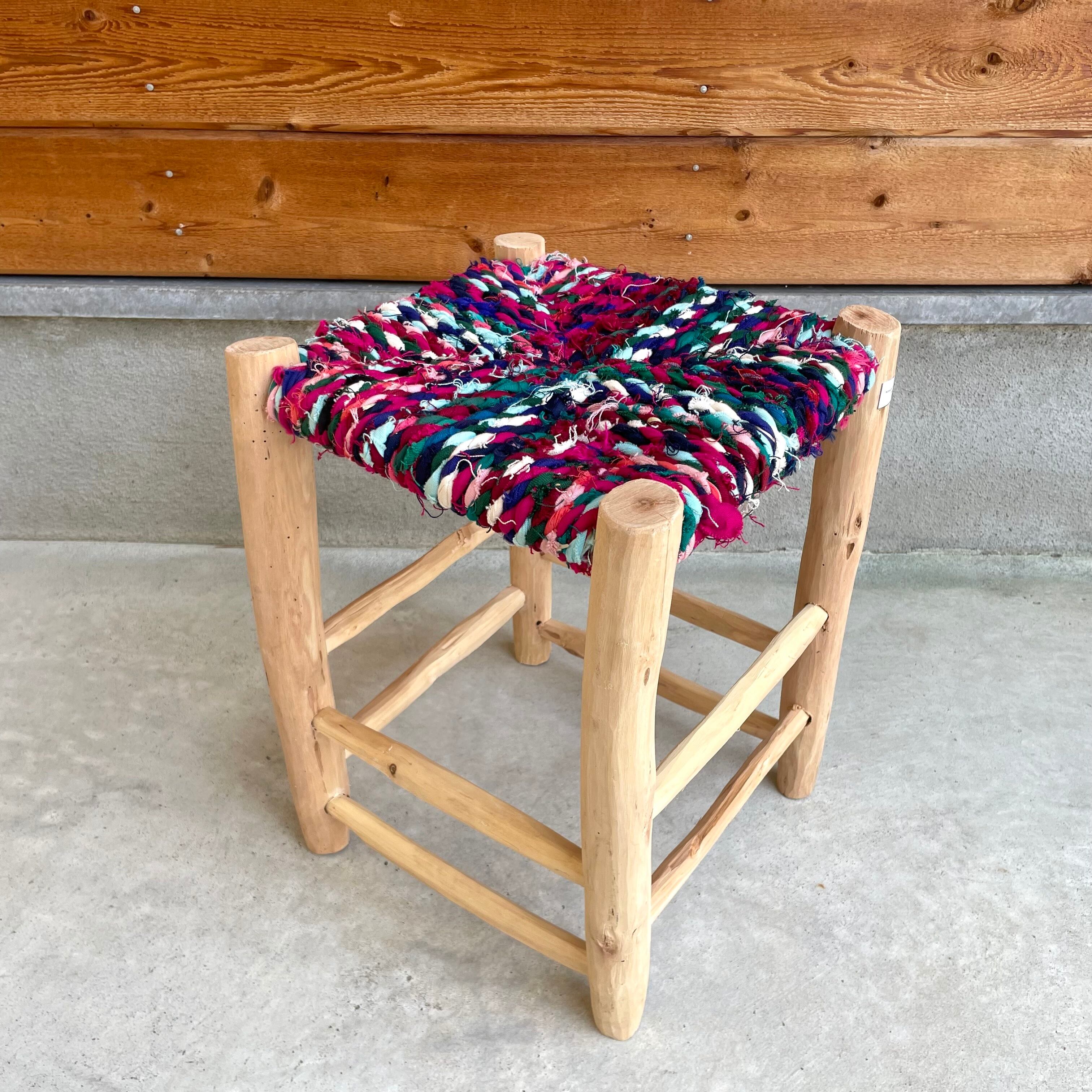 モロッコからやってきたナチュラルな雰囲気が素敵な座面に布を編み込んだ木製の椅子。軽くてコンパクトな低座タイプなので、ちょっとした腰掛けや玄関椅子などに便利です。ナチュラルな木の風合いを生かした脚やすべて手作業で作られる1点ものという点も魅力的!