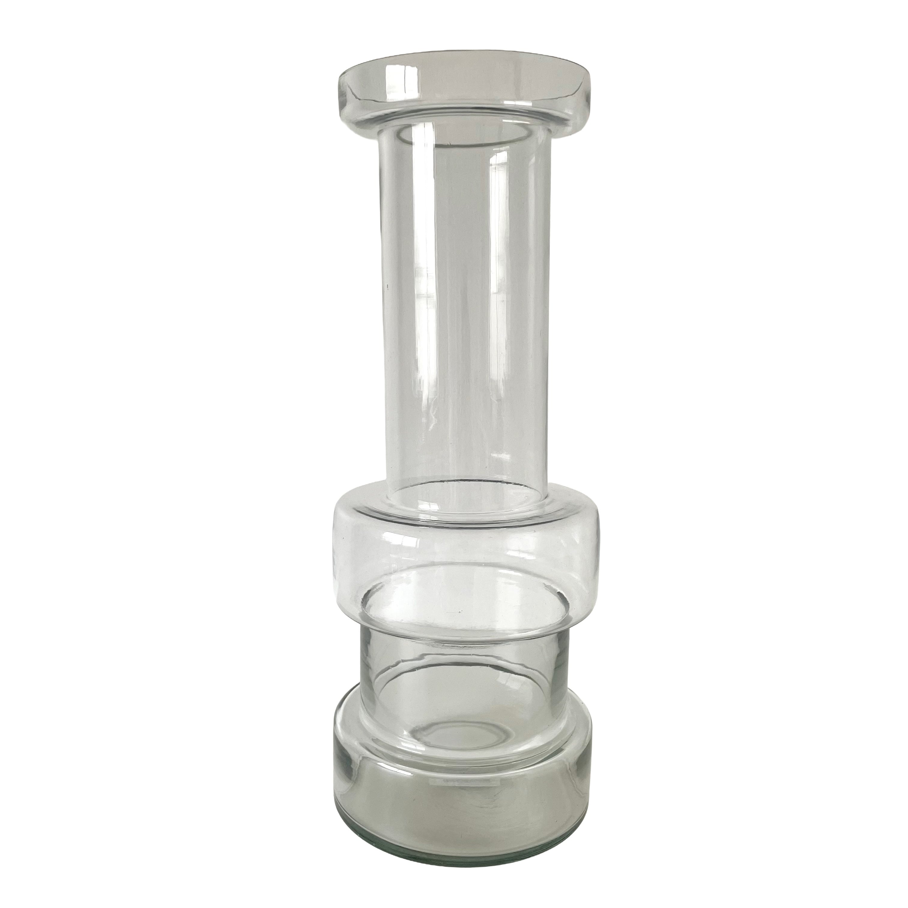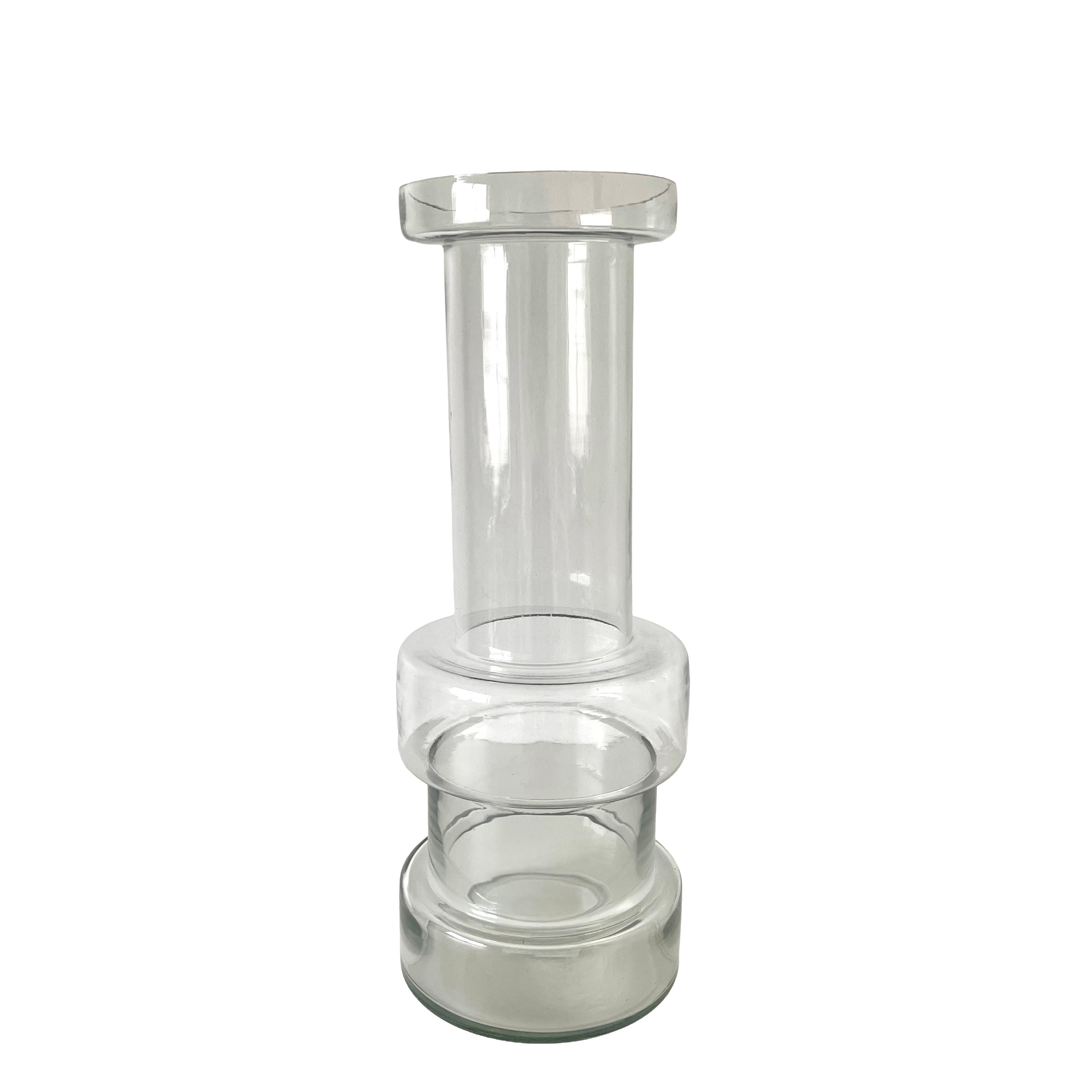 高さ40cmという存在感のあるサイズは、季節の枝物や丈の長い花々をダイナミックに受け止め、空間に心地よい緊張感と華やかさをもたらします。透明度の高いクリアガラスが光を複雑に屈折させ、花を活けていない時でもアートオブジェとして窓辺や棚の上を美しく彩ってくれるでしょう。