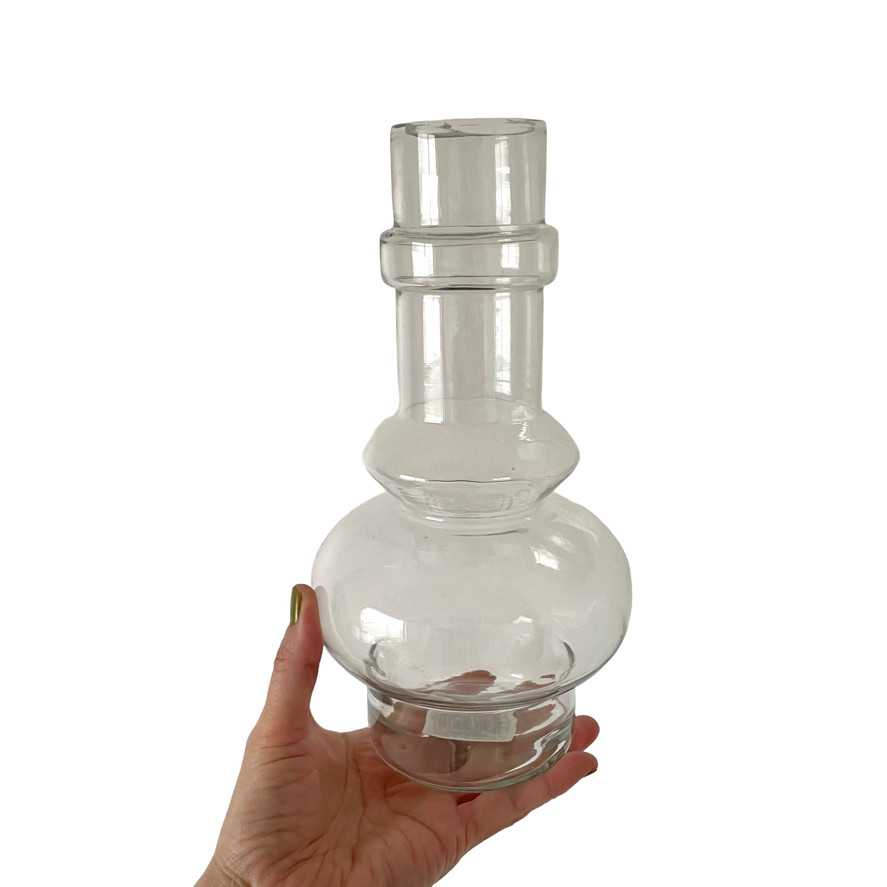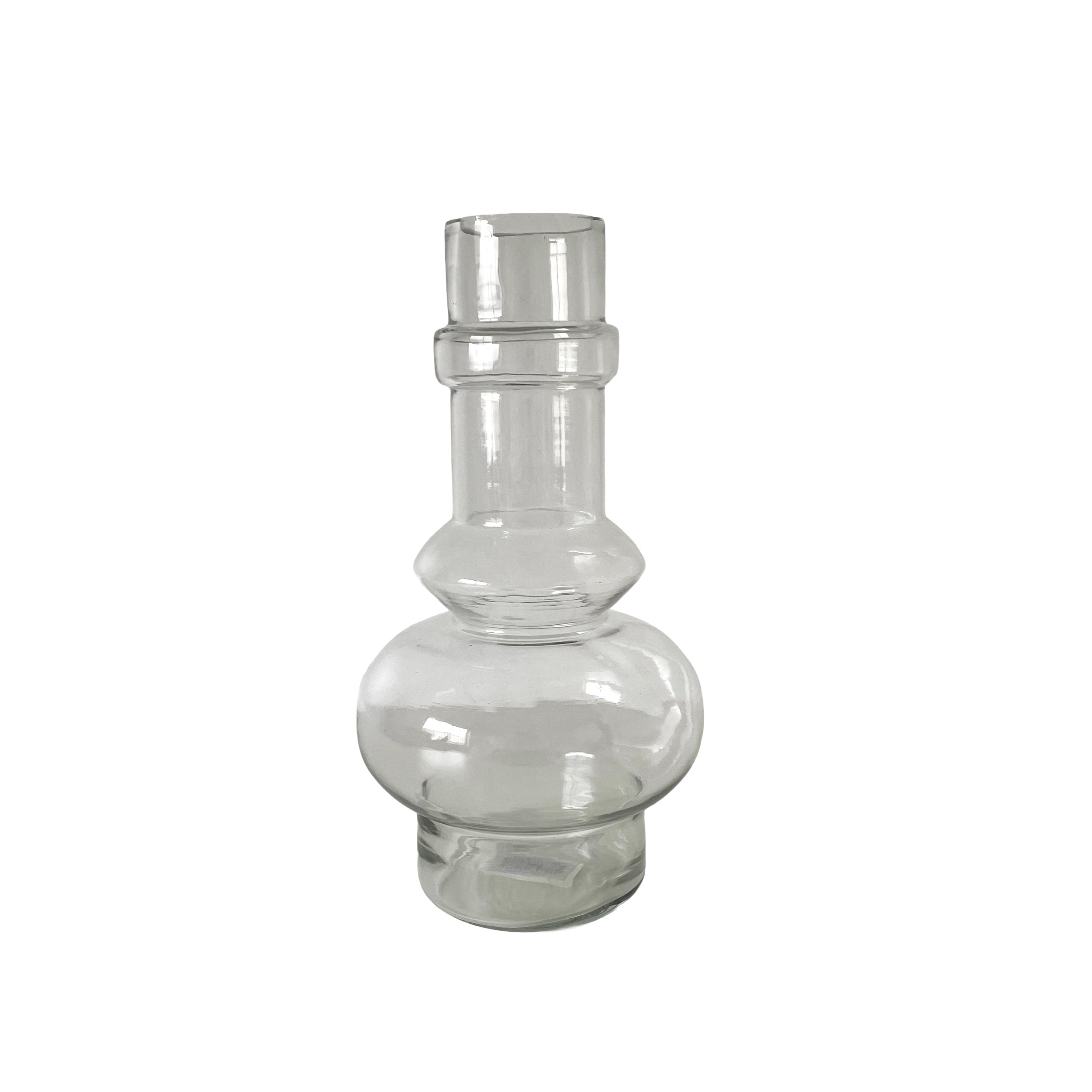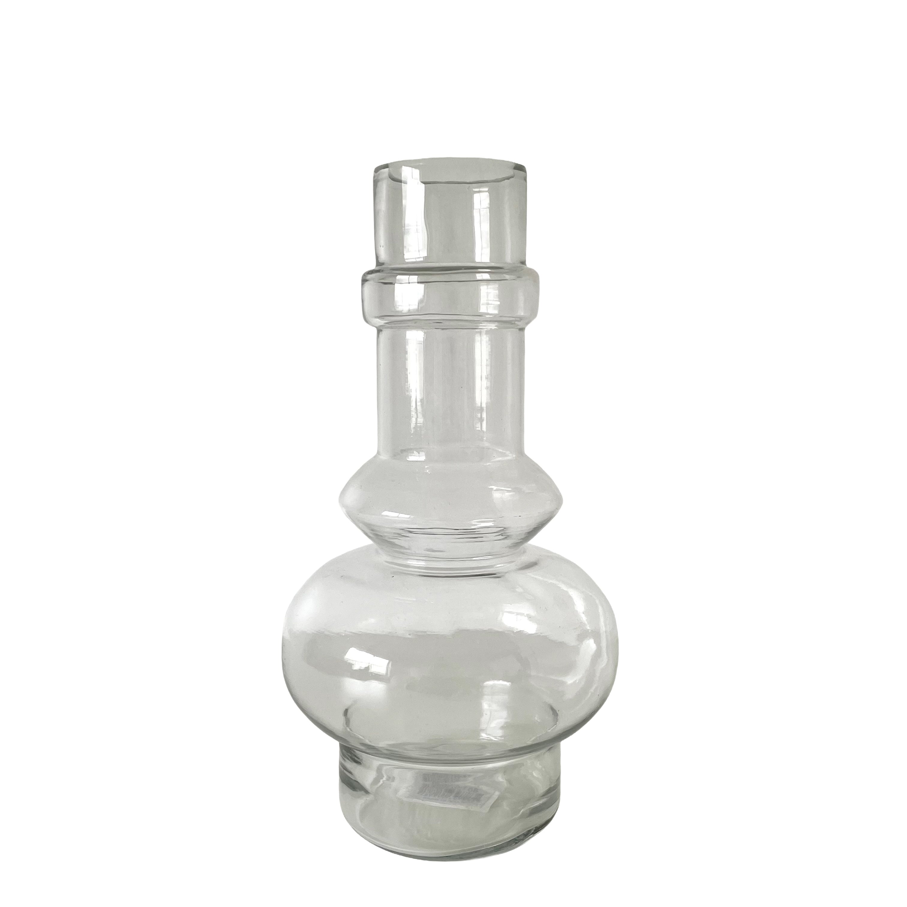 目を引くのは、ふっくらと丸みを帯びた底部分から、リズミカルな段差を描きながら立ち上がる独創的なフォルム。異国のアンティークな調度品を思わせるクラシカルな趣がありながら、装飾を削ぎ落としたクリアガラスで仕上げることで、洗練されたスカンジナビア・デザインの感性が際立つ一品となりました。