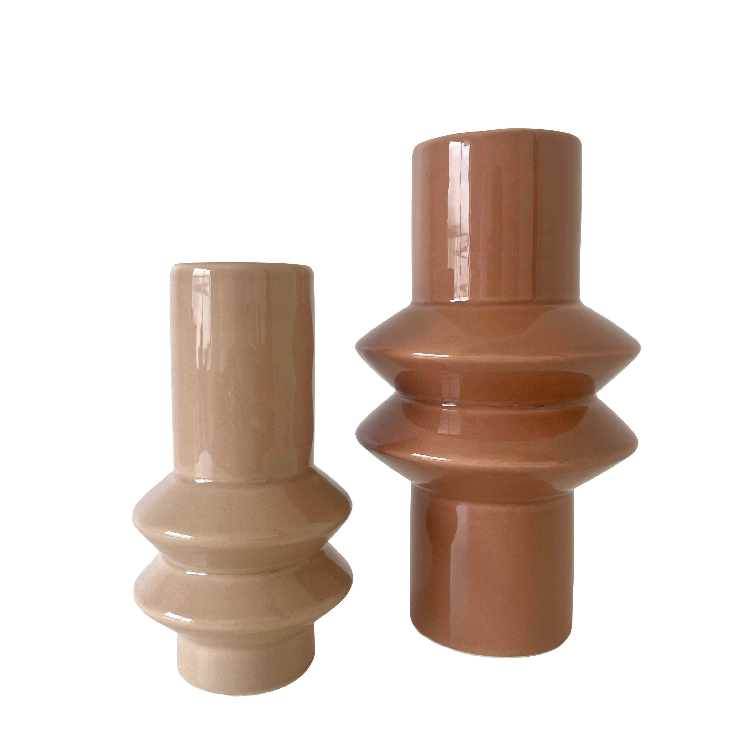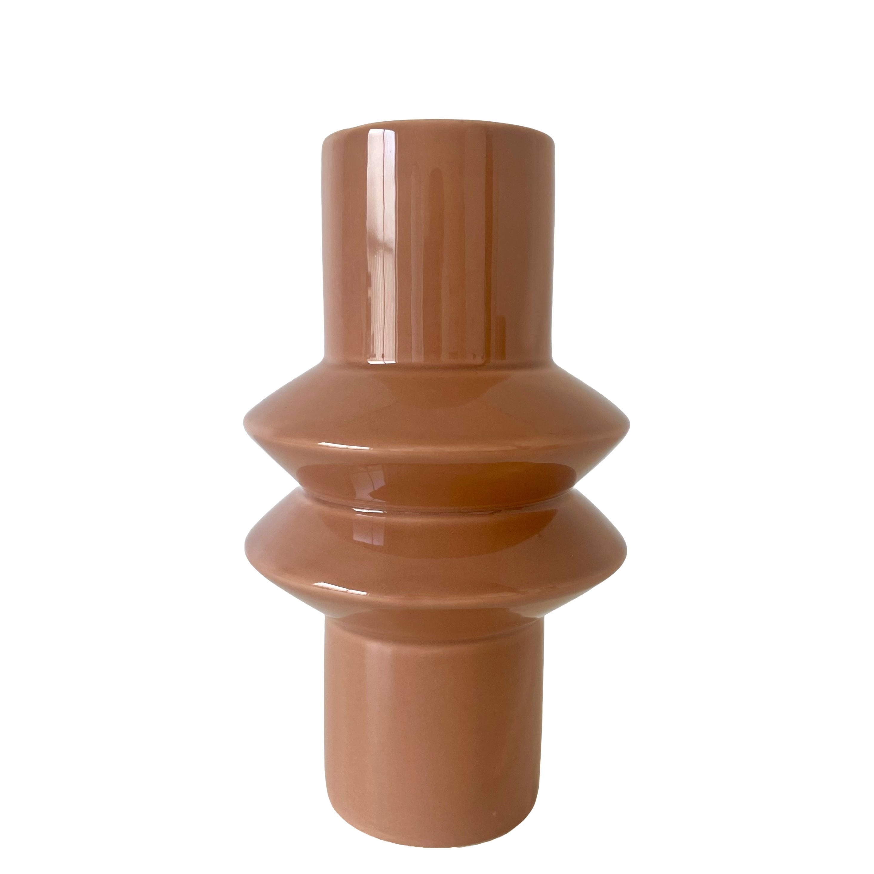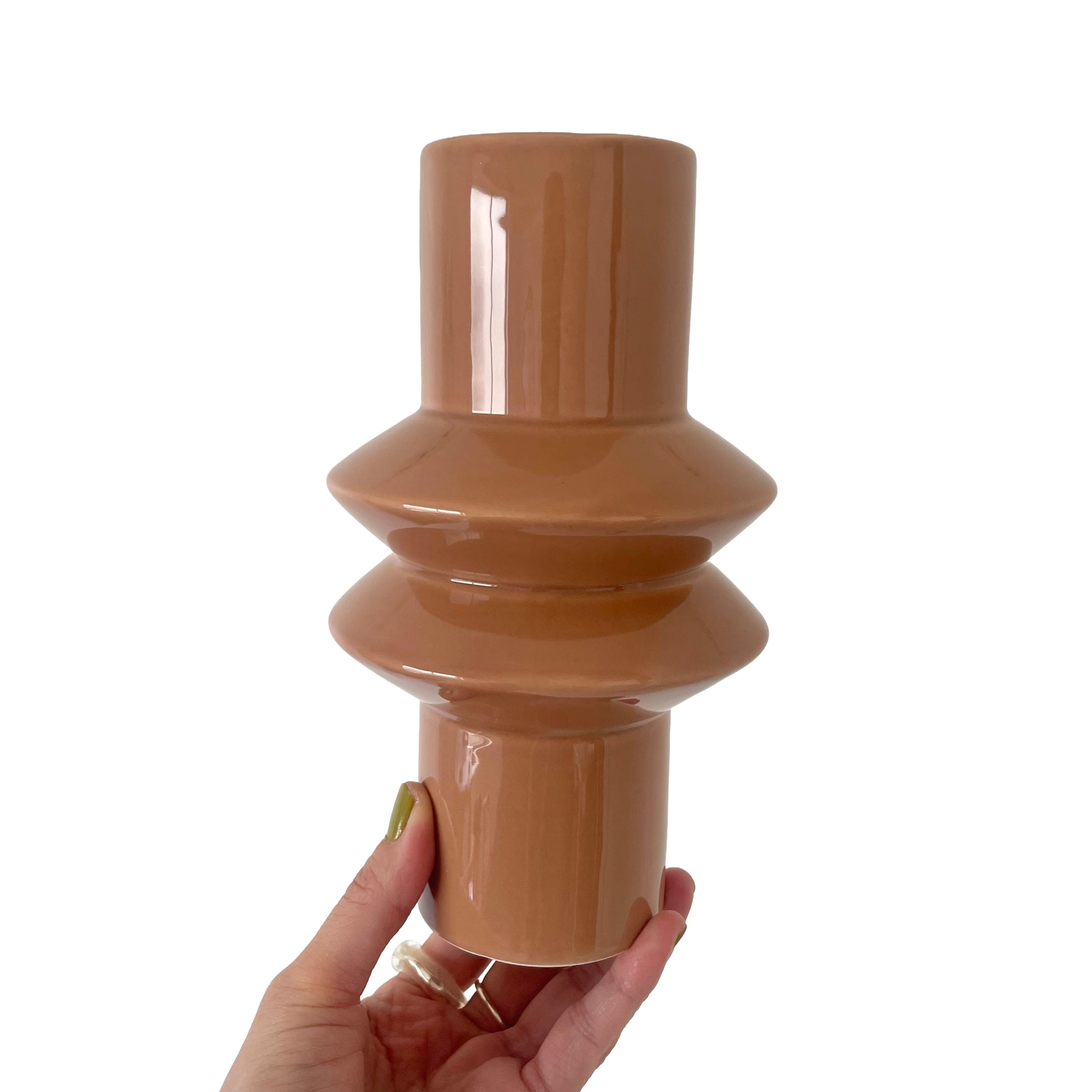 都会的で彫刻的なシルエットが目を引く、陶器のフラワーベース。円柱とエッジの効いたフォルムがリズムよく重なり合うその姿は、モダンアートのような凛とした佇まいを感じさせます。深みのあるラセットブラウンの色調と、陶器特有の柔らかな光沢が相まって、空間に落ち着いた品格と温もりをもたらしてくれます。直径11cm、高さ20cmというサイズ感は、ダイニングテーブルのセンターピースや棚のアクセントとして最適です。そのままでも完成された美しさがありますが、鮮やかな緑の枝物や、ドライのワイルドフラワーを活けることで、素材のコントラストが際立ち、よりいっそう印象的な風景を作り出します。