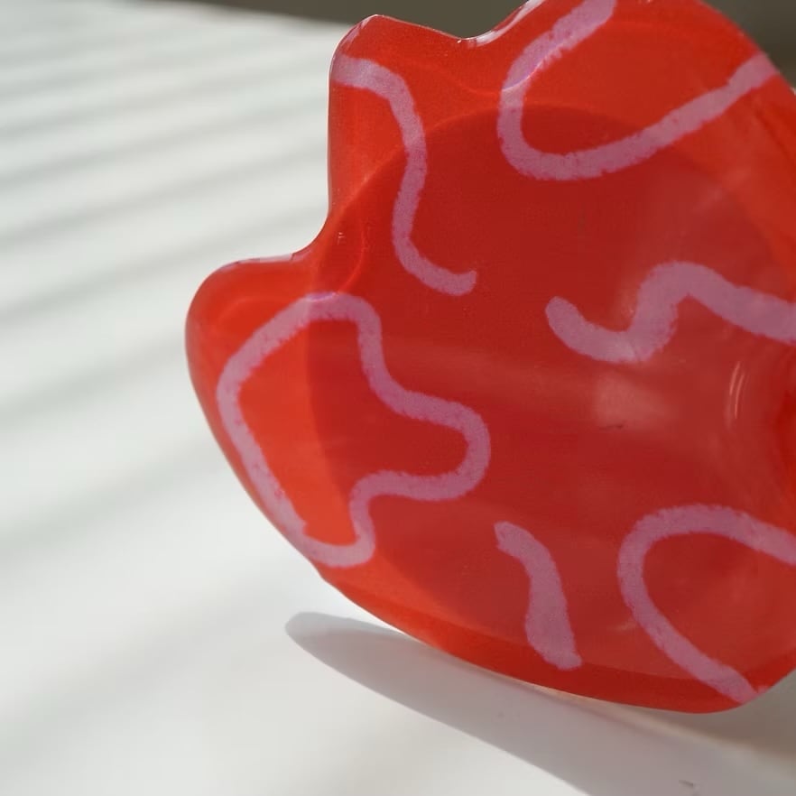 表面は光沢のある艶やかな質感で、手元に華やかな存在感を与えてくれます。不規則で有機的なフォルムと、ポップなカラーリングの組み合わせは、お手持ちのスマホケースに装着するだけで、いつものスタイルを一気にモードな雰囲気へと変えてくれます。