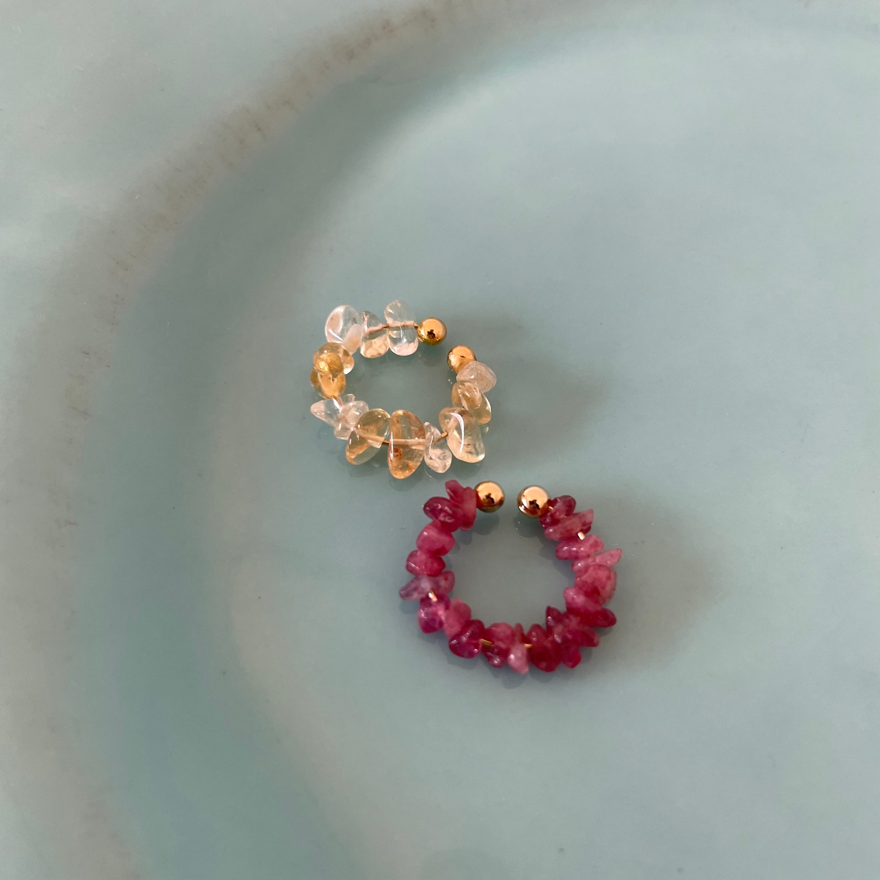 cocoiroがお届けする、天然石を贅沢に使用したクリップ式のイヤーカフ。華奢なワイヤーに、美しい鮮やかな色彩を放つ天然石を丁寧に編み込みました。まるで小さな宝石のリングを耳に着けているかのような、上品で愛らしいデザインです。